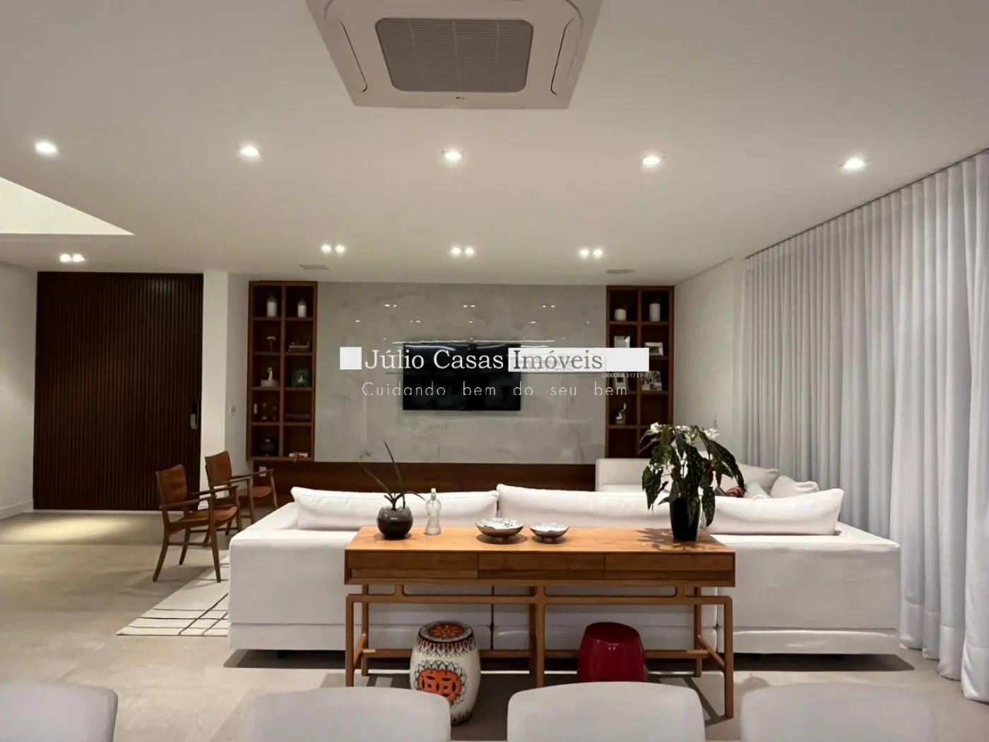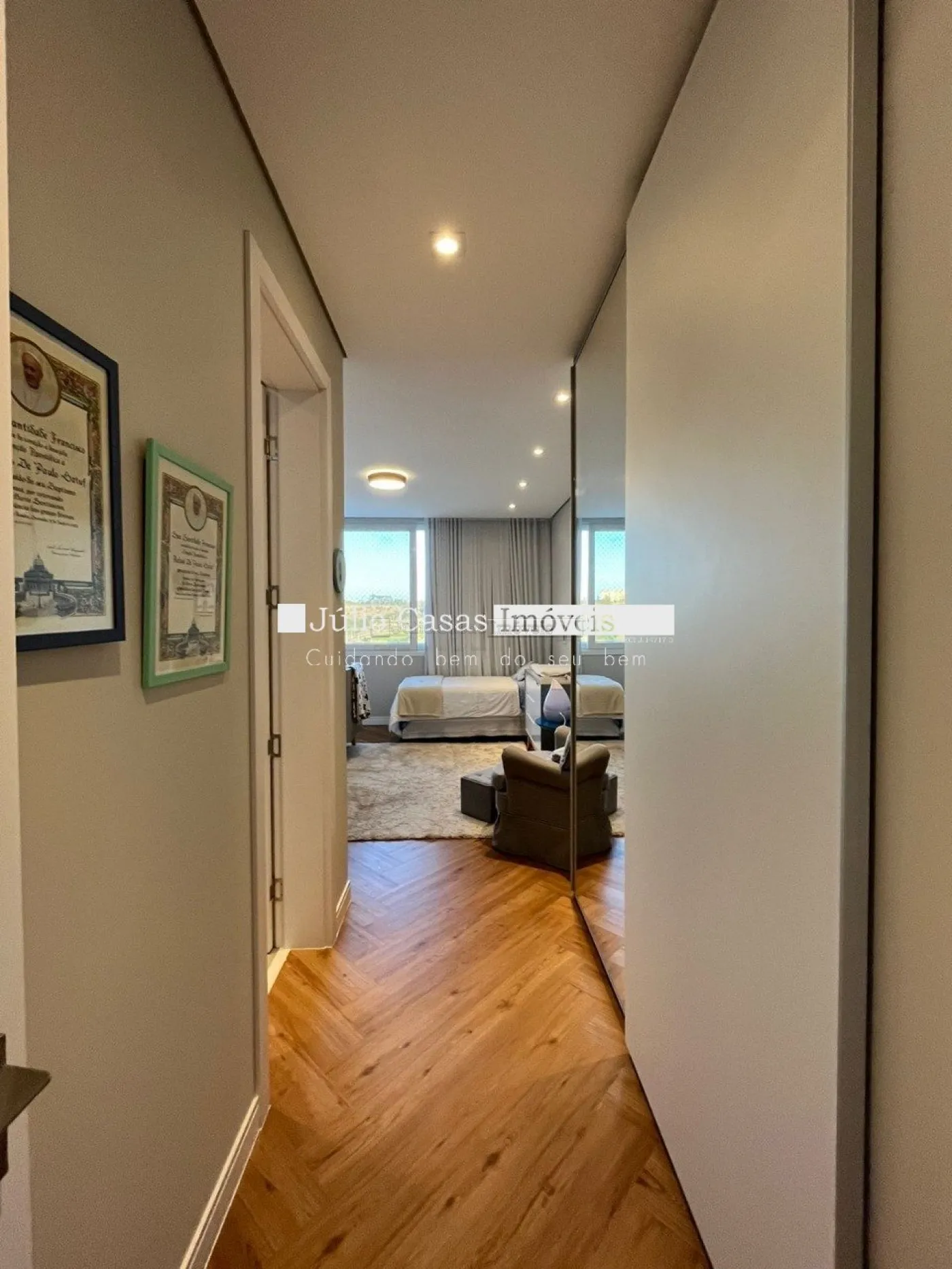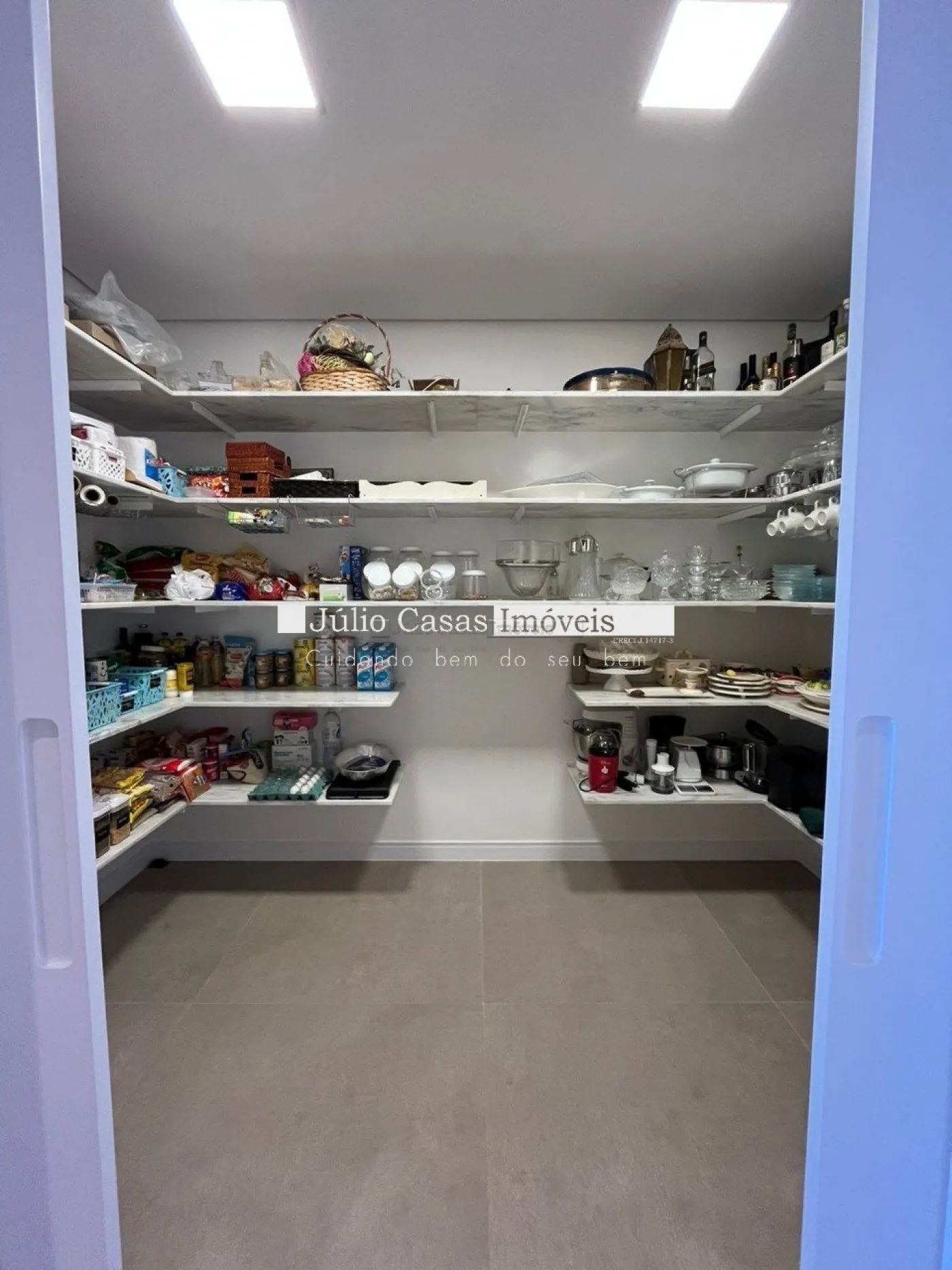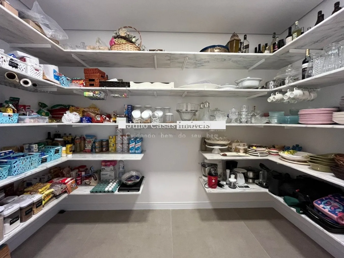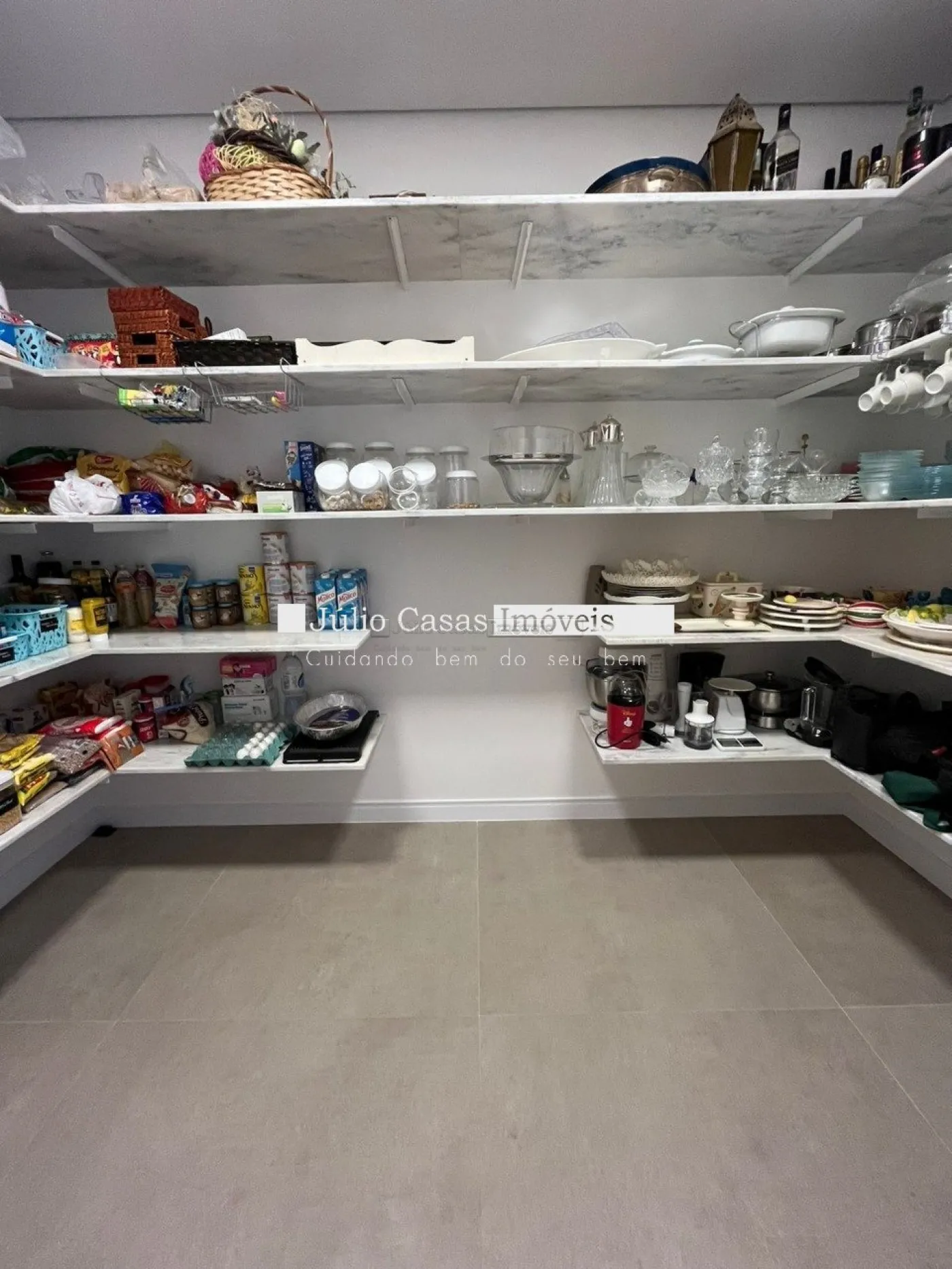 O andar térreo também conta com uma lavanderia espaçosa com ampla despensa, uma varanda técnica e um depósito de 30 m², oferecendo soluções práticas para o dia a dia. No andar superior, encontra-se uma ampla sala que serve como espaço de convivência, além de quatro suítes, sendo uma máster com closet e banheira, proporcionando um ambiente de luxo e conforto. O hall deste andar inclui um amplo roupeiro e um frigobar embutido, garantindo praticidade e sofisticação.