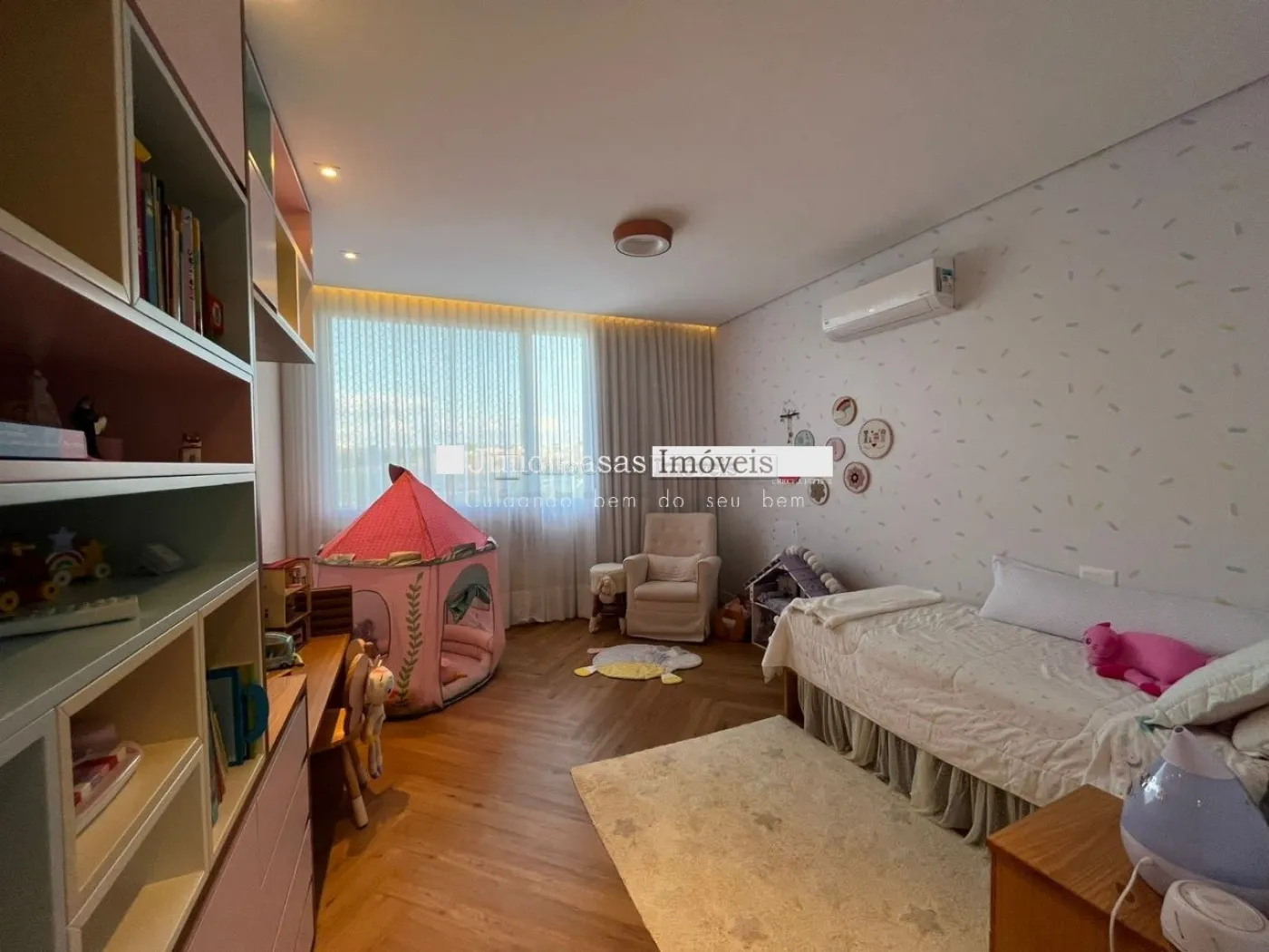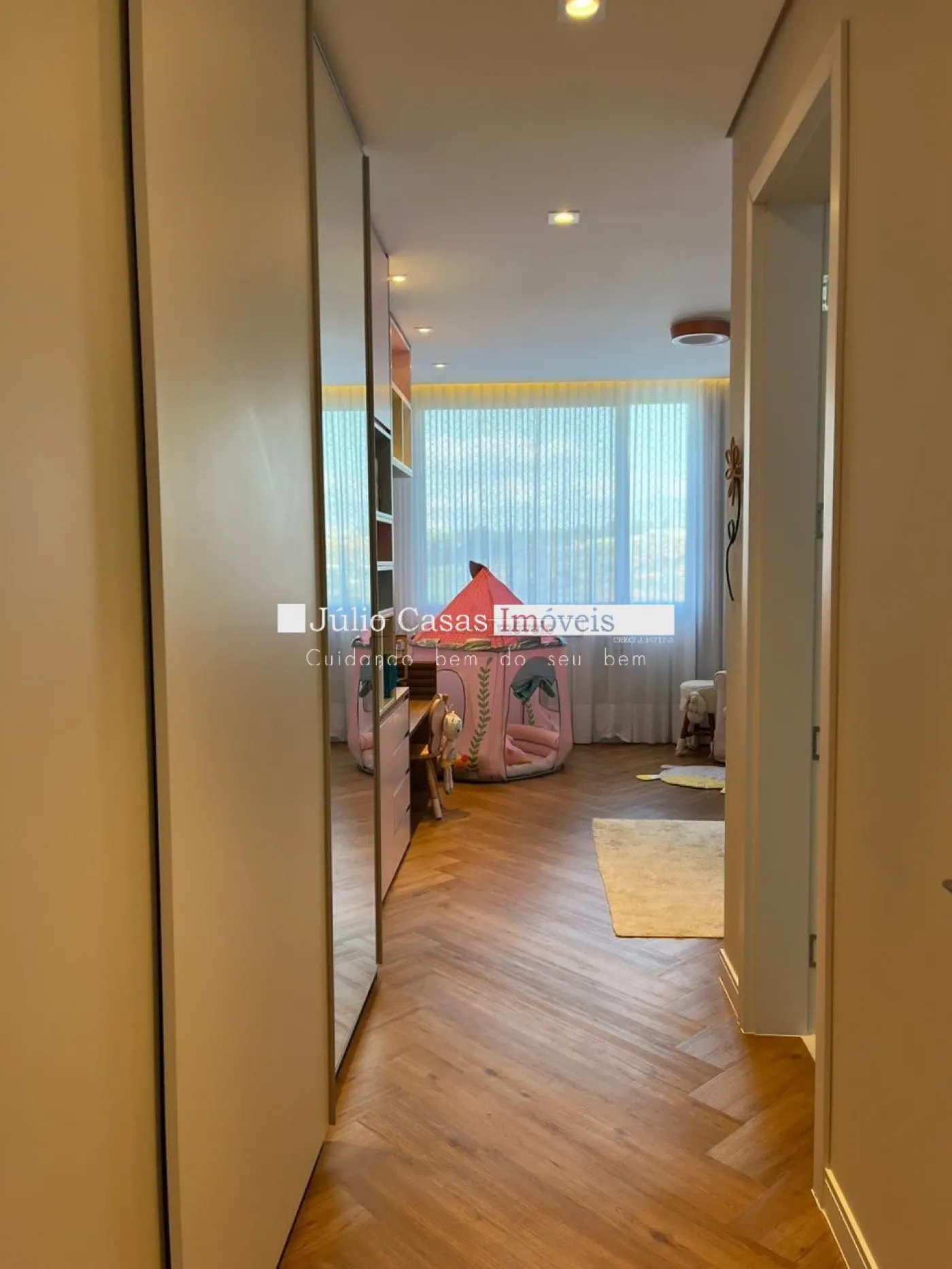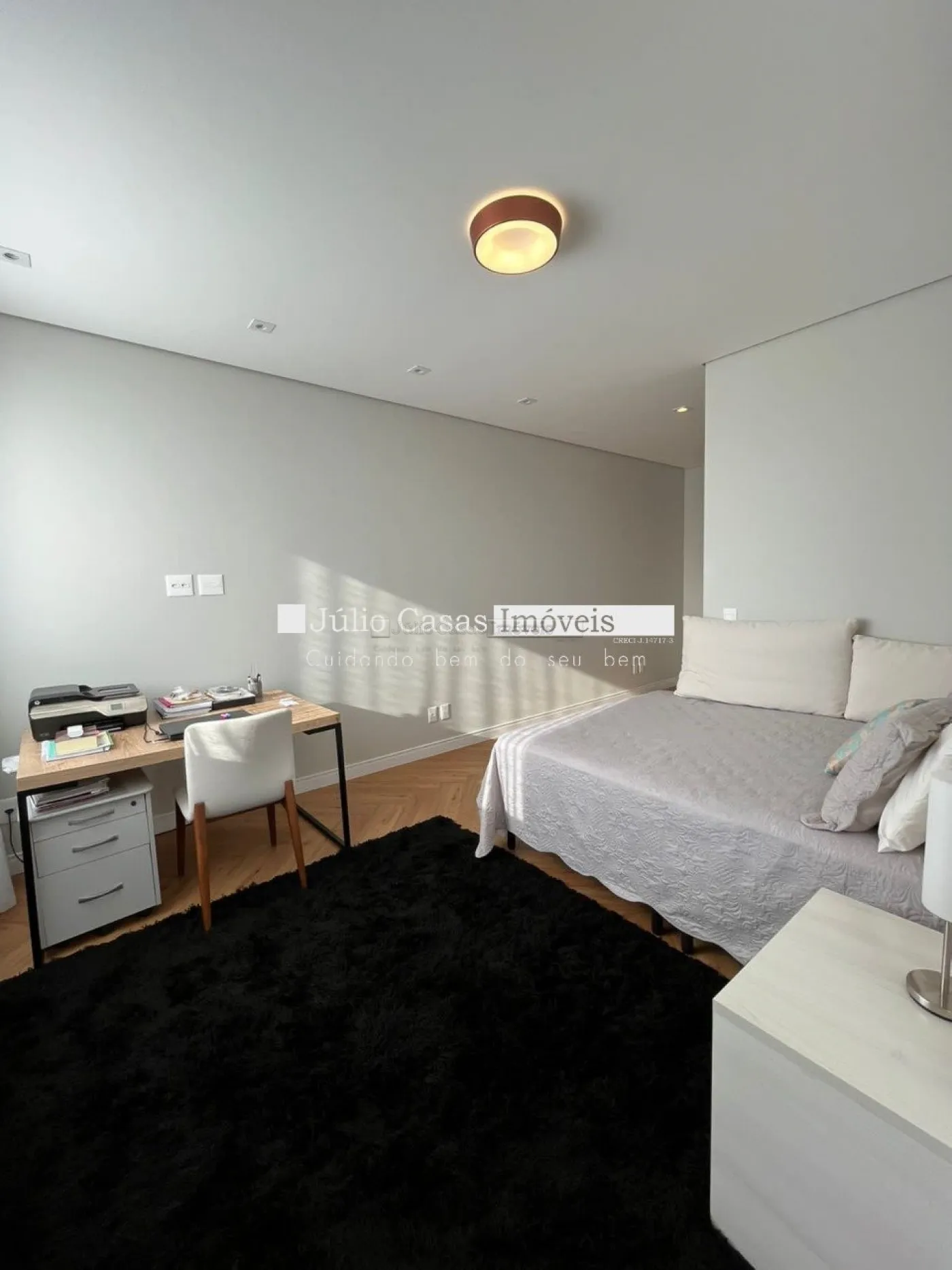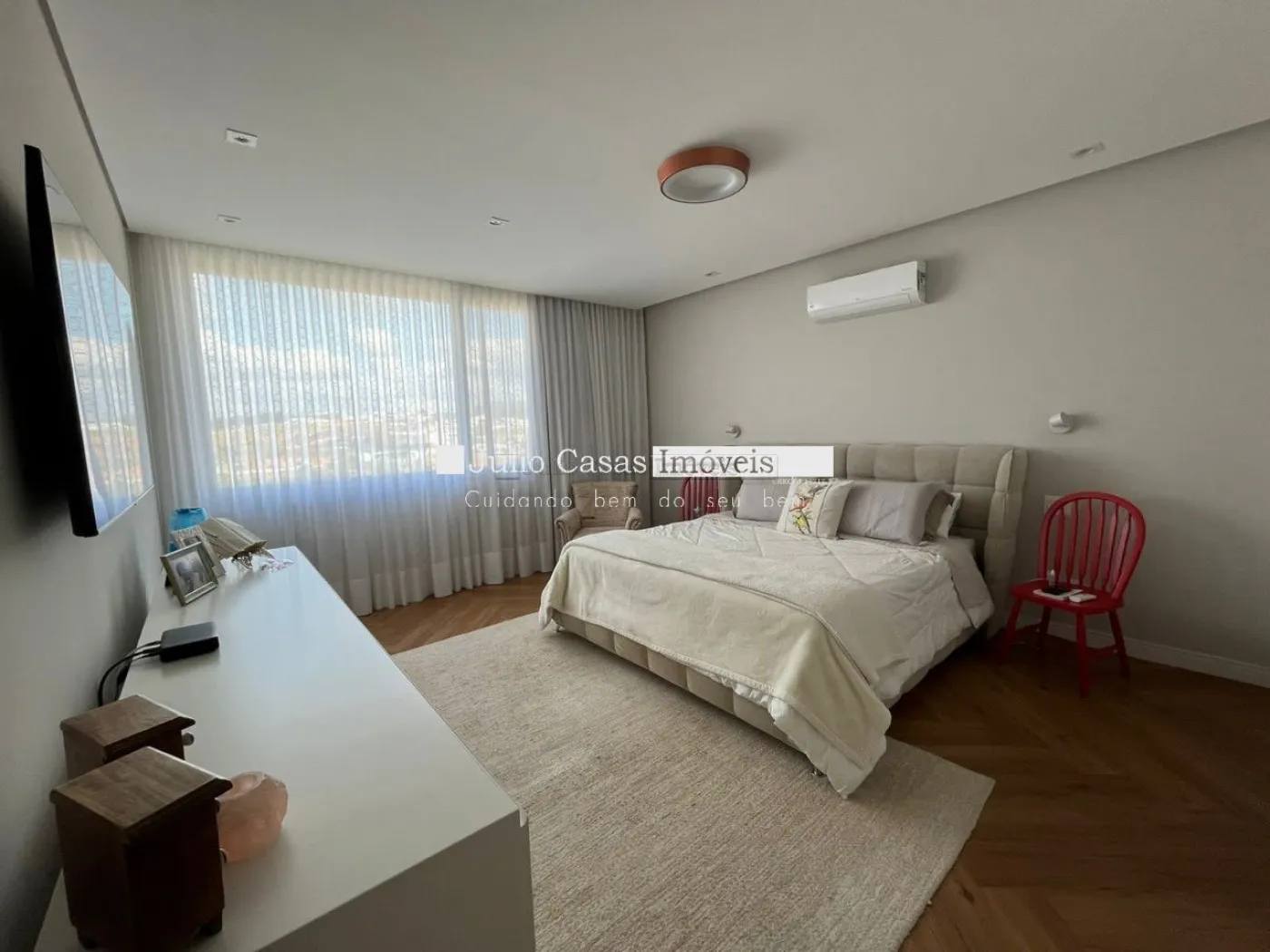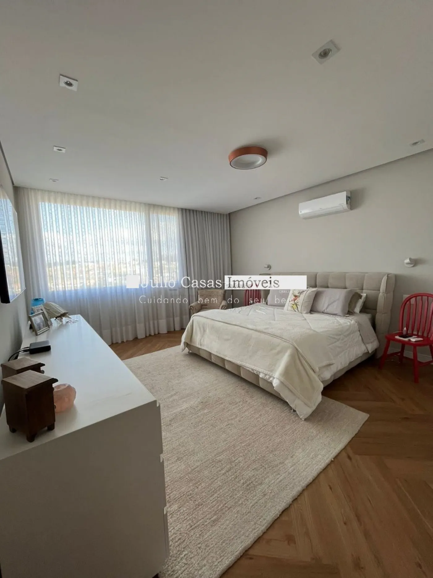O andar térreo também conta com uma lavanderia espaçosa com ampla despensa, uma varanda técnica e um depósito de 30 m², oferecendo soluções práticas para o dia a dia. No andar superior, encontra-se uma ampla sala que serve como espaço de convivência, além de quatro suítes, sendo uma máster com closet e banheira, proporcionando um ambiente de luxo e conforto. O hall deste andar inclui um amplo roupeiro e um frigobar embutido, garantindo praticidade e sofisticação.