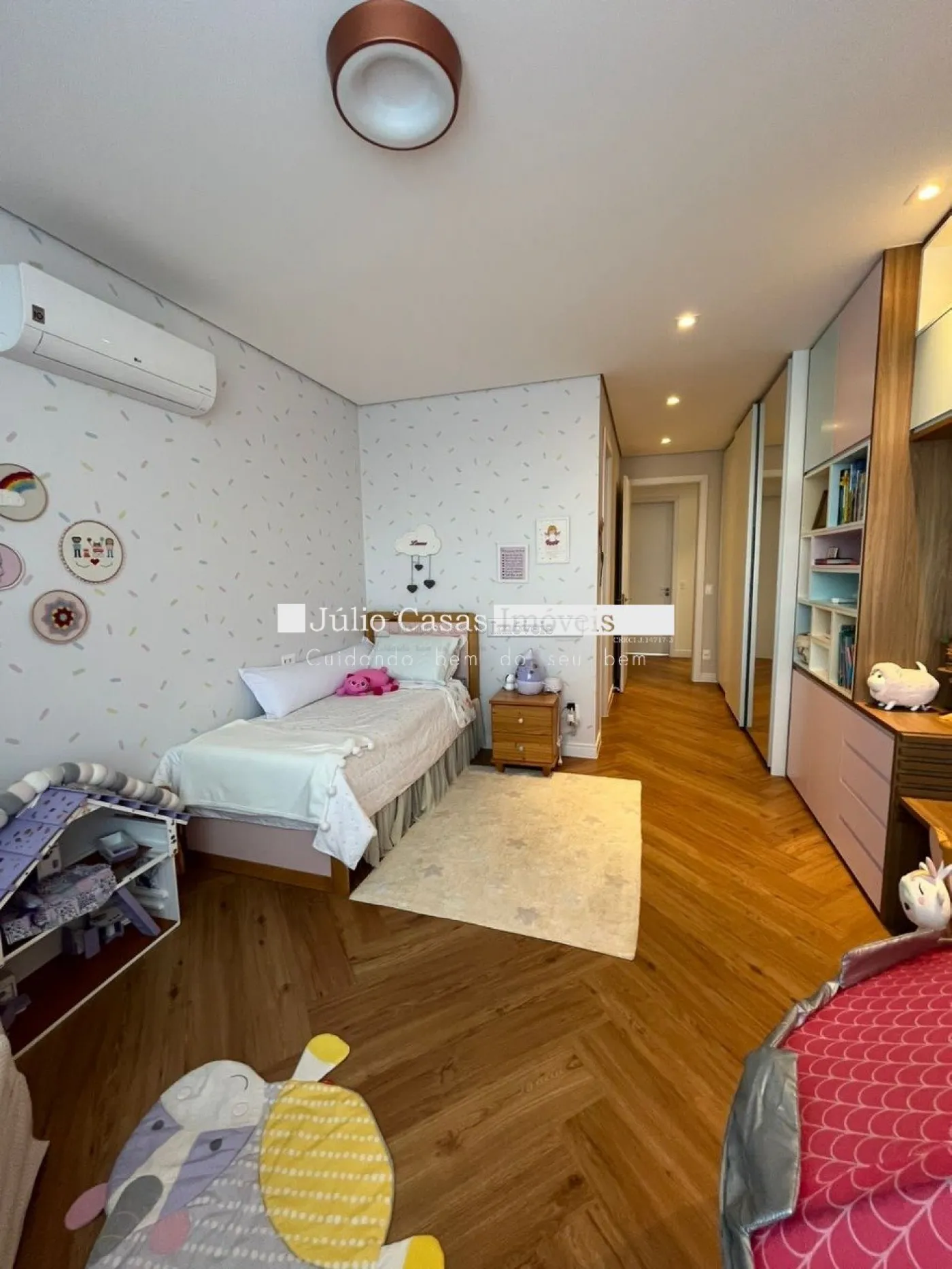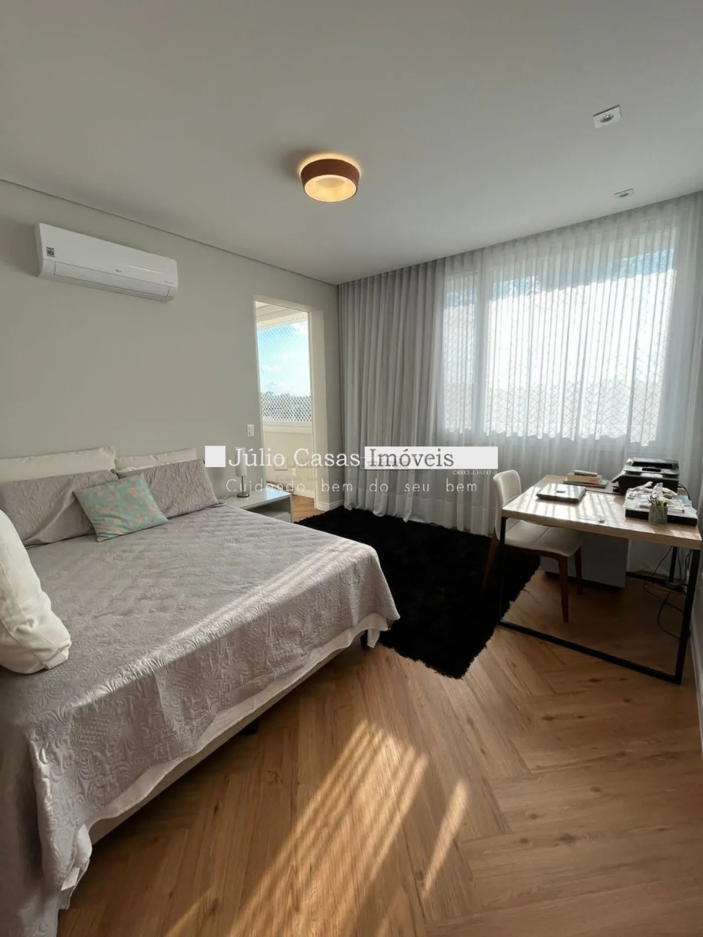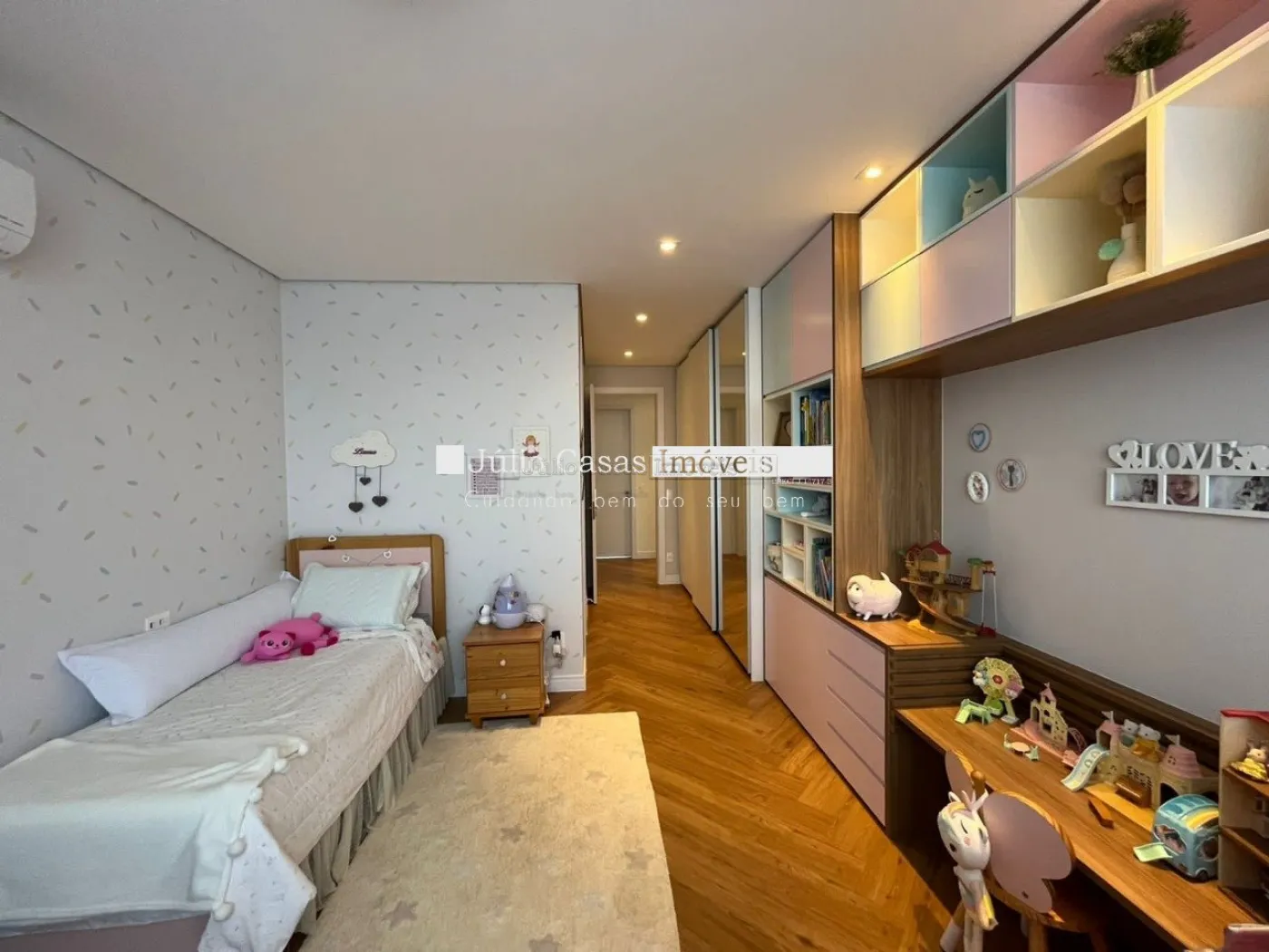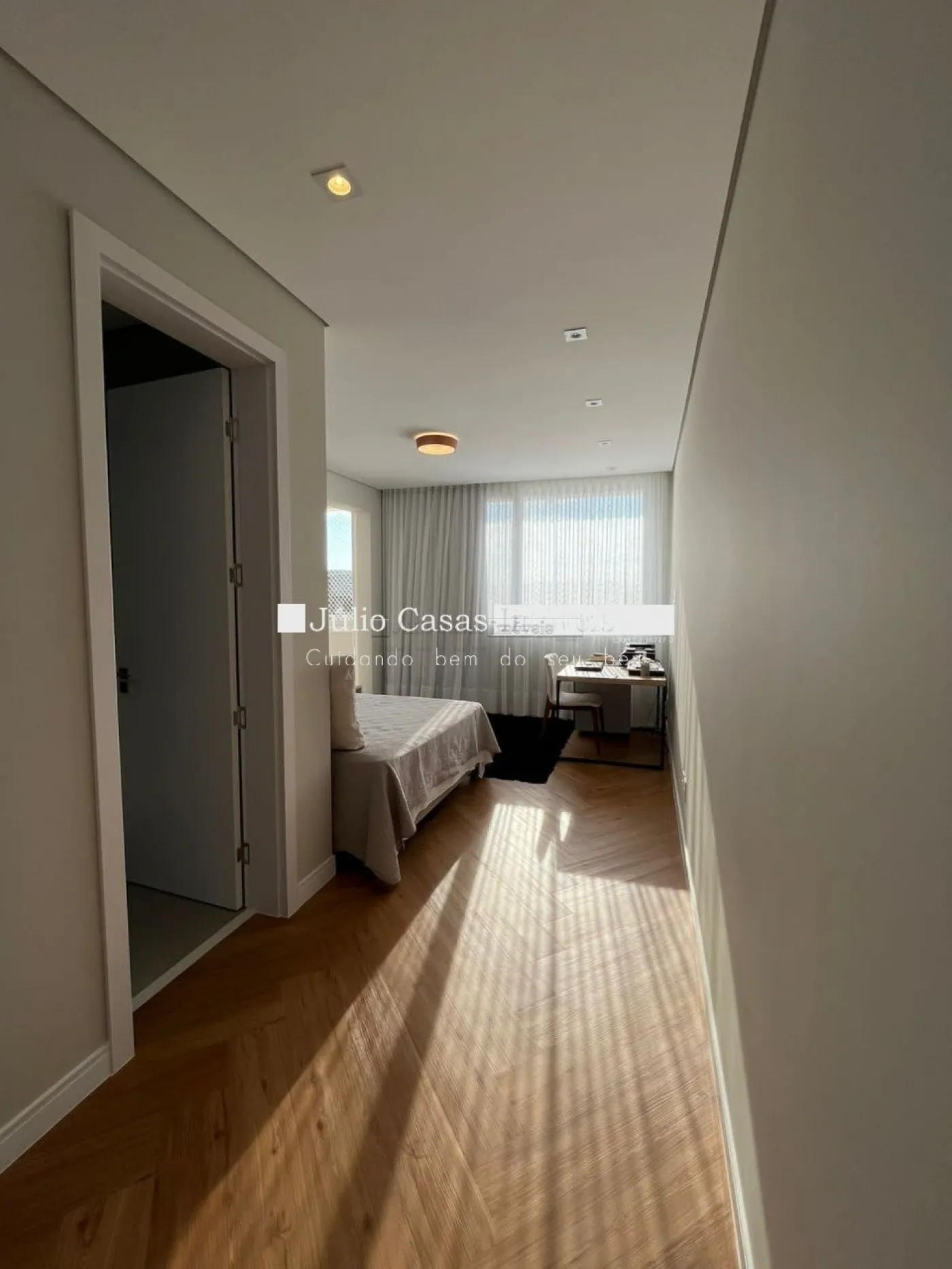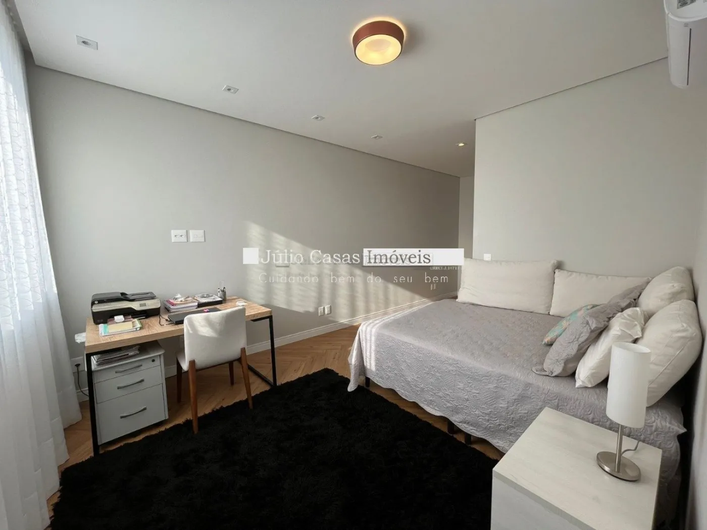 O andar térreo também conta com uma lavanderia espaçosa com ampla despensa, uma varanda técnica e um depósito de 30 m², oferecendo soluções práticas para o dia a dia. No andar superior, encontra-se uma ampla sala que serve como espaço de convivência, além de quatro suítes, sendo uma máster com closet e banheira, proporcionando um ambiente de luxo e conforto. O hall deste andar inclui um amplo roupeiro e um frigobar embutido, garantindo praticidade e sofisticação.