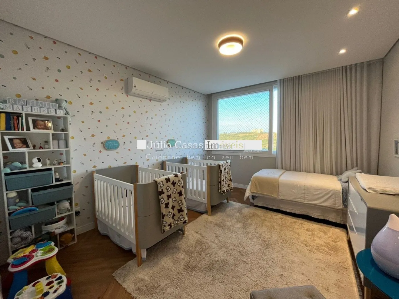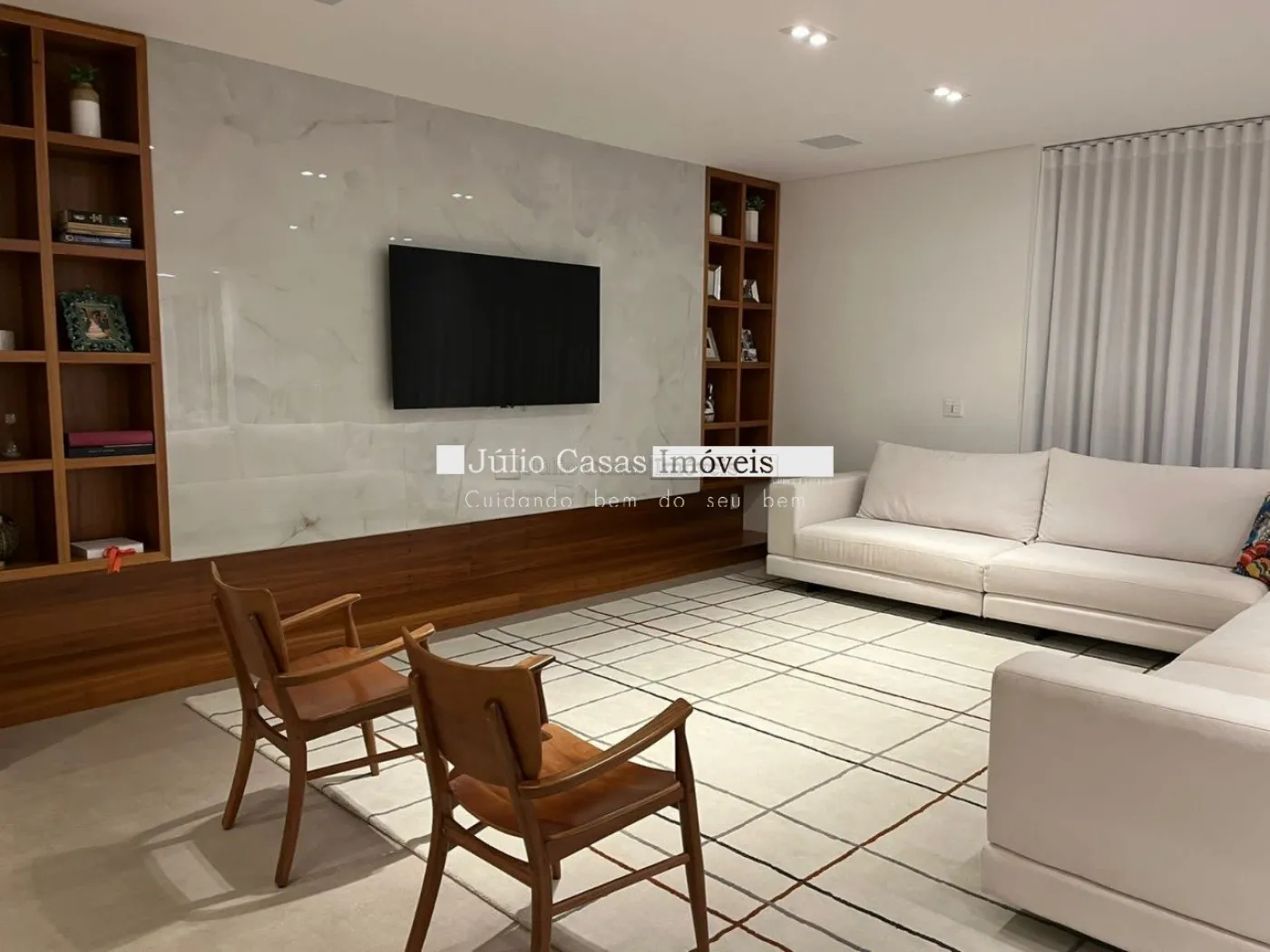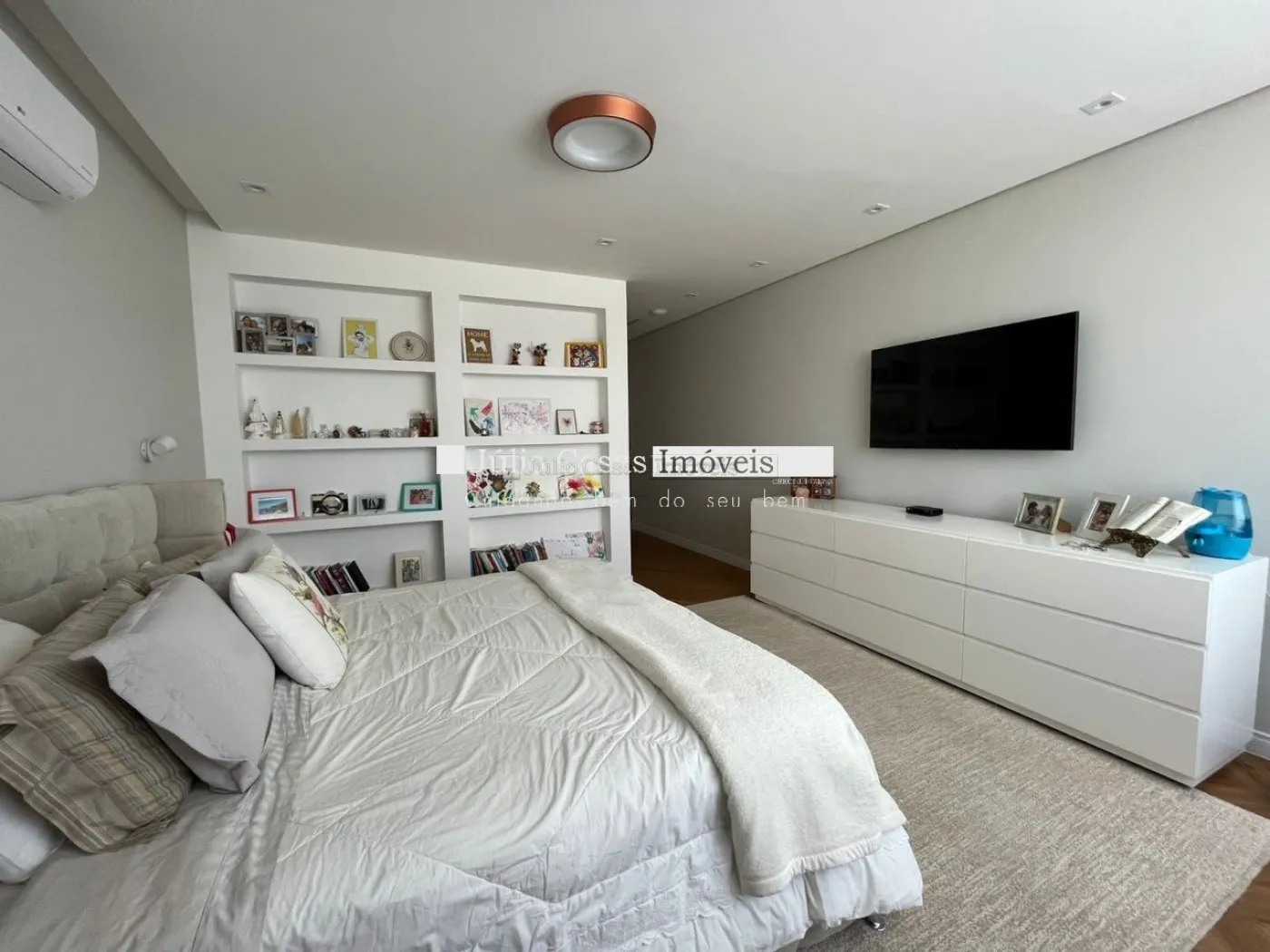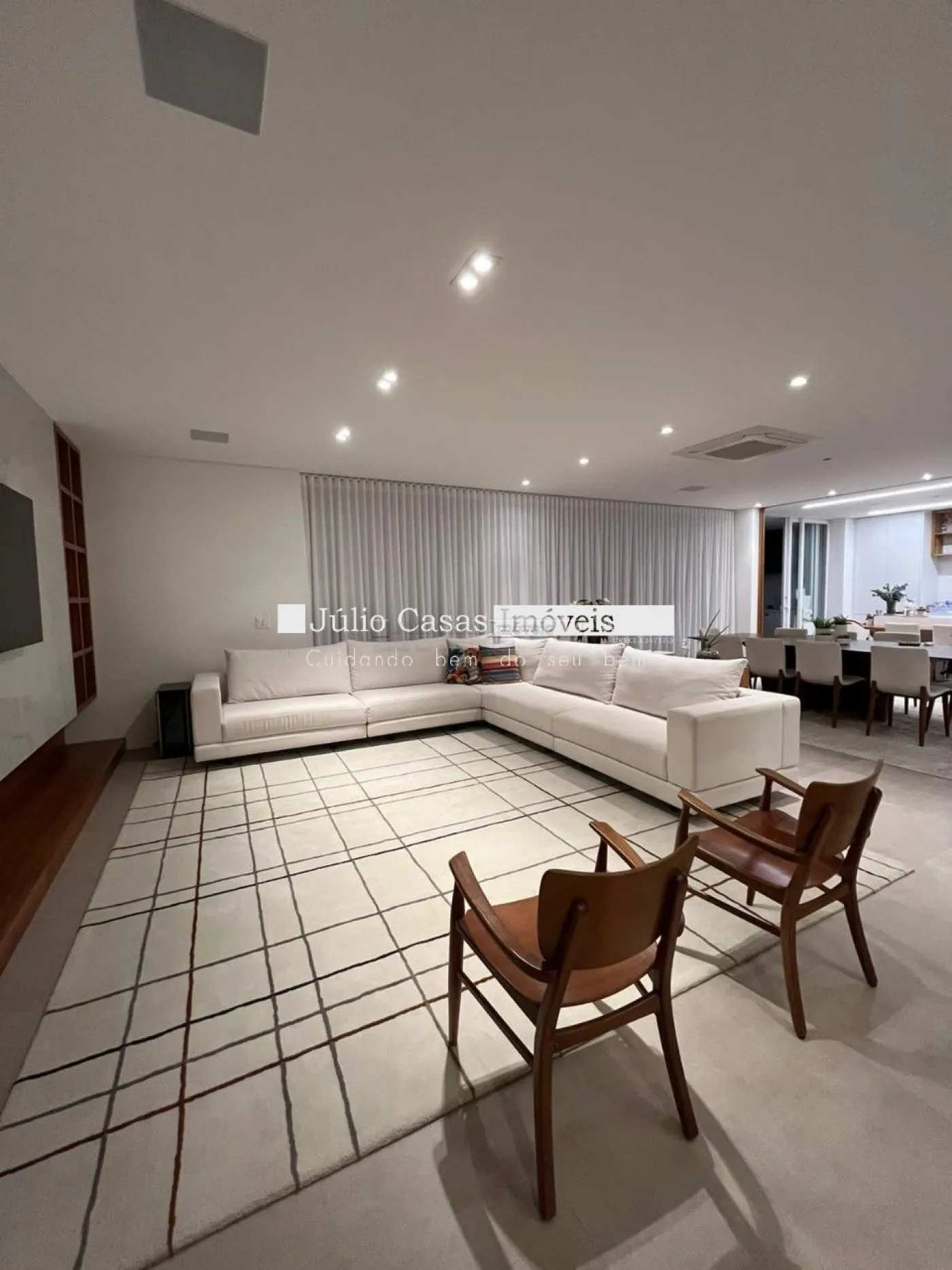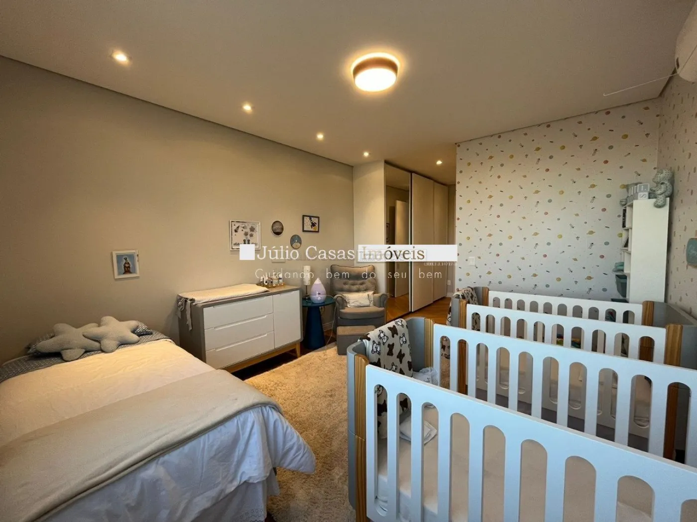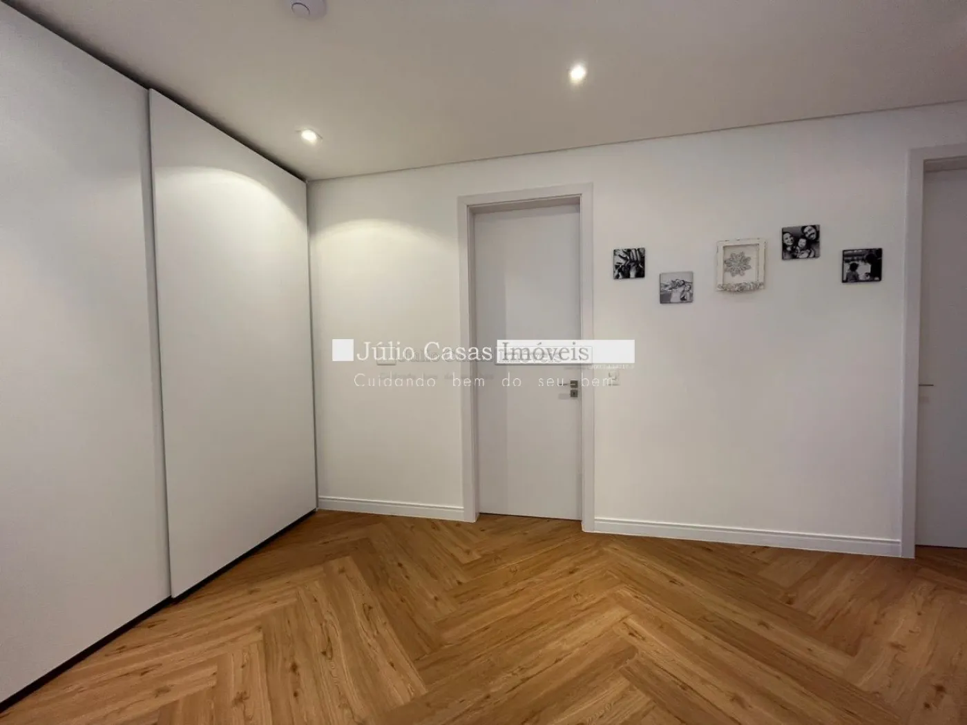 O andar térreo também conta com uma lavanderia espaçosa com ampla despensa, uma varanda técnica e um depósito de 30 m², oferecendo soluções práticas para o dia a dia. No andar superior, encontra-se uma ampla sala que serve como espaço de convivência, além de quatro suítes, sendo uma máster com closet e banheira, proporcionando um ambiente de luxo e conforto. O hall deste andar inclui um amplo roupeiro e um frigobar embutido, garantindo praticidade e sofisticação.