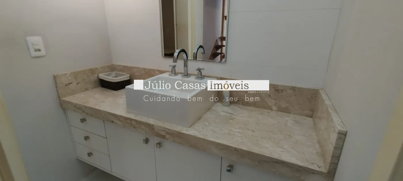 Banheiros com pias em mármore travertino, box em vidro temperado.