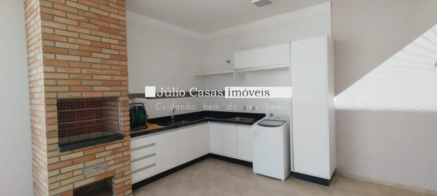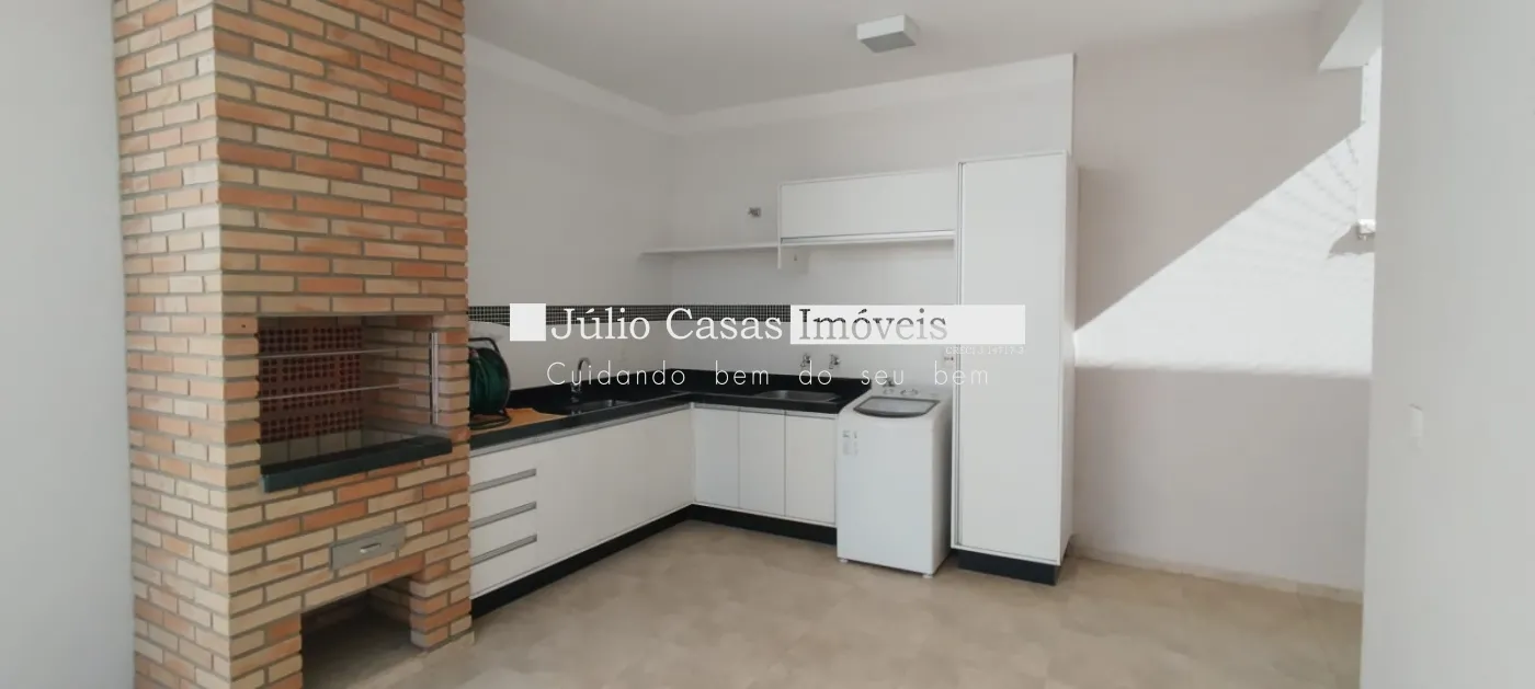 Área gourmet com churrasqueira, pia de apoio. Está com armários.