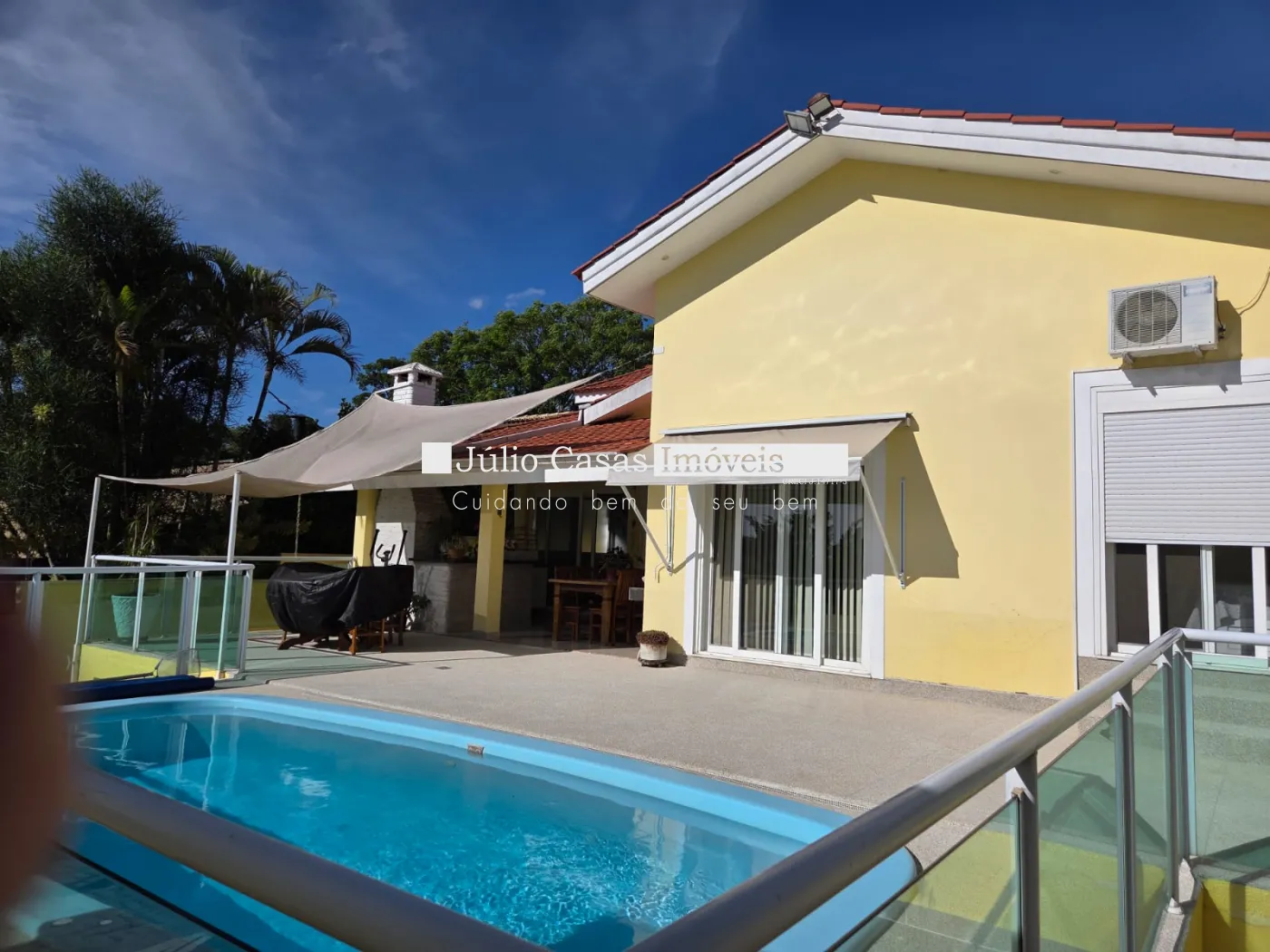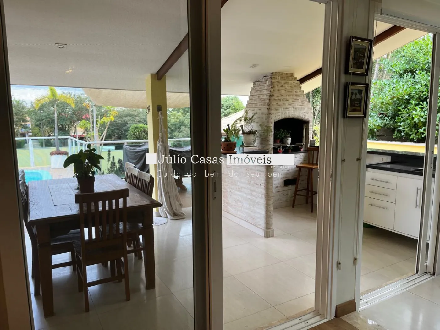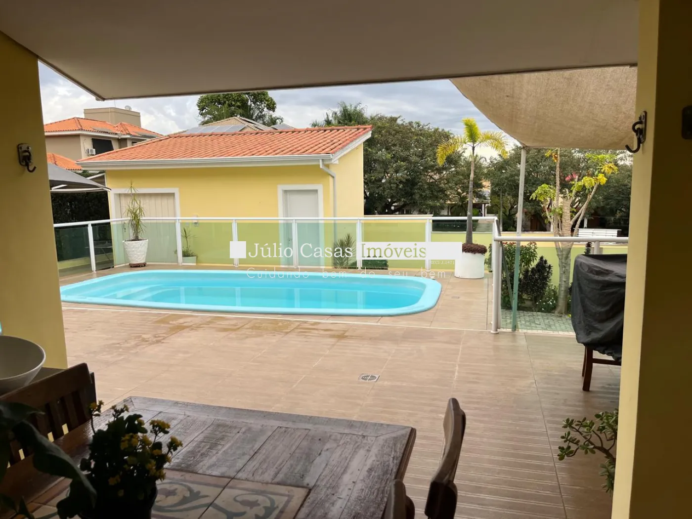 Quintal com churrasqueira e piscina.