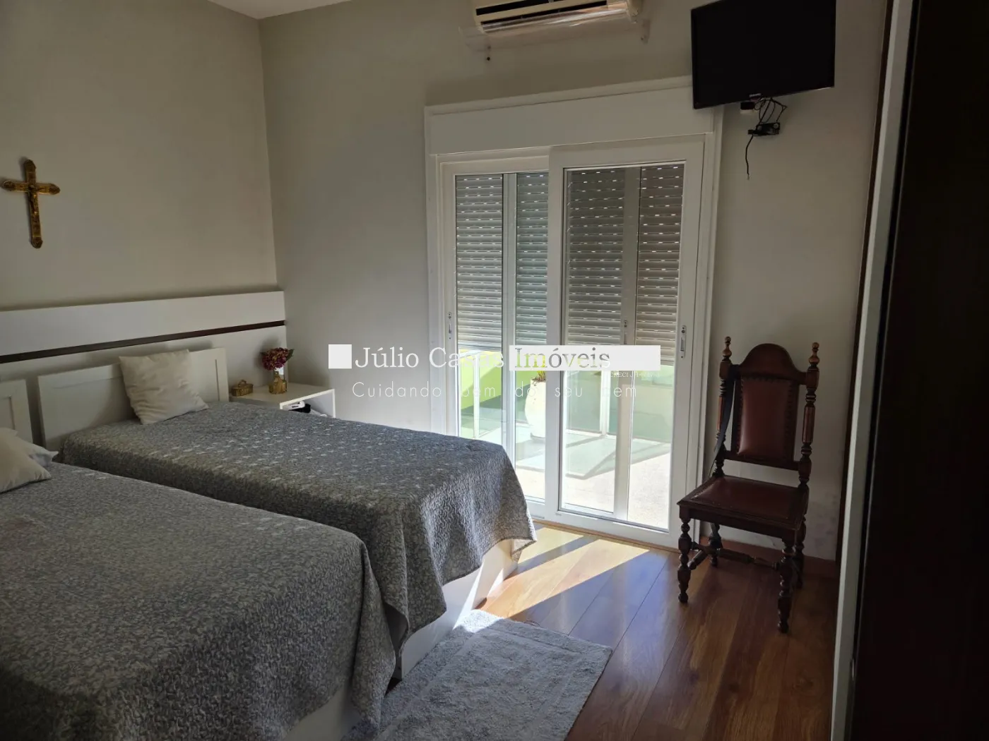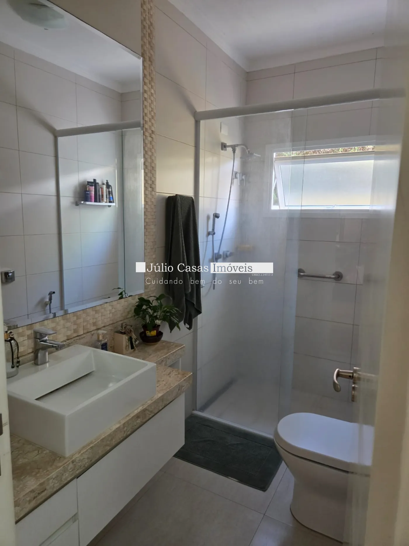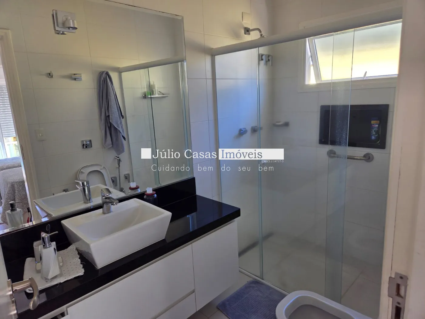 Casa com 3 dormitórios, sendo 1 suíte e 2 quartos com banheiro, todos com armários planejados e ar condicionado.