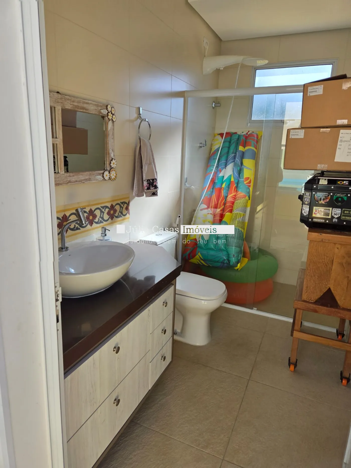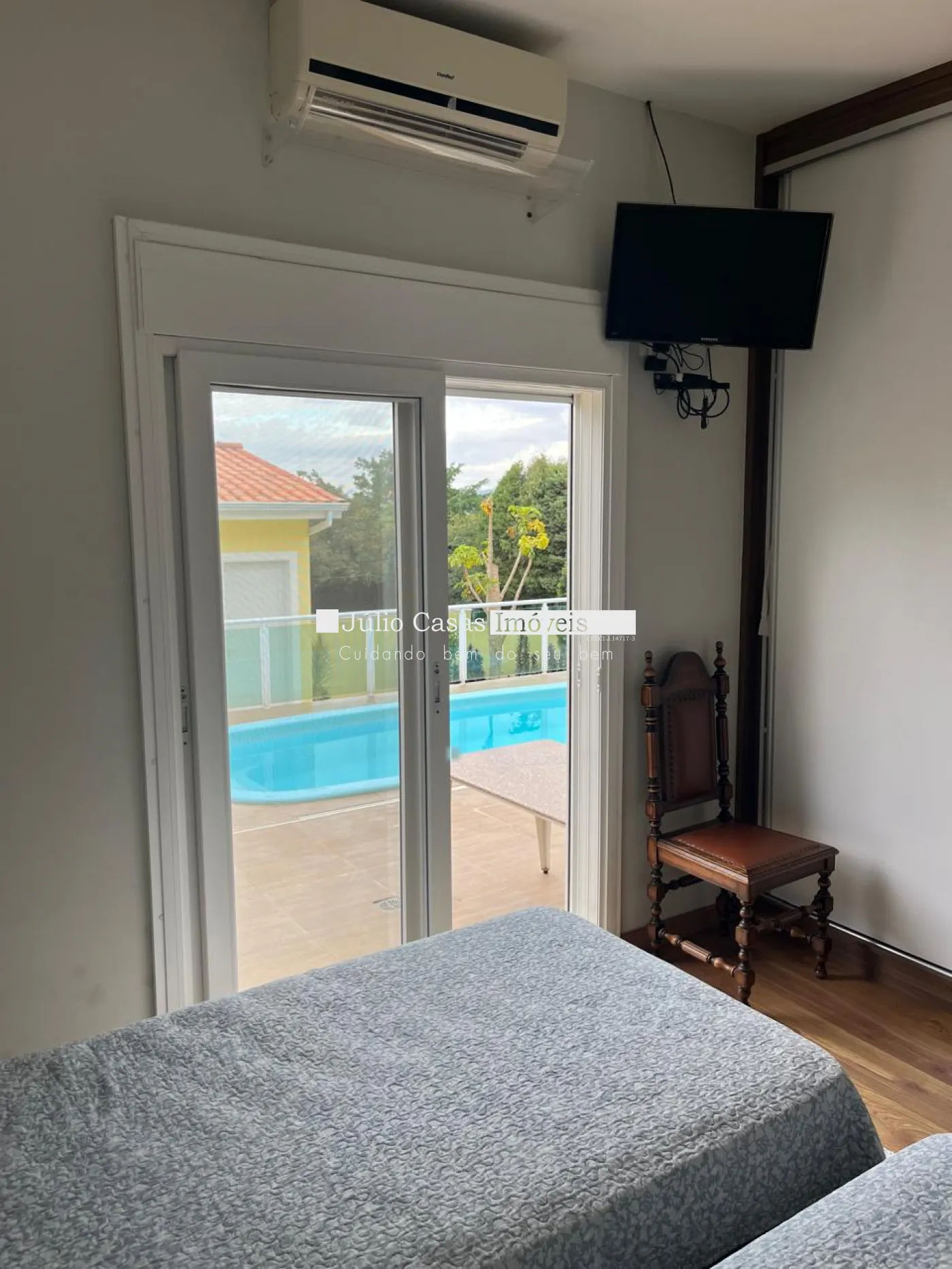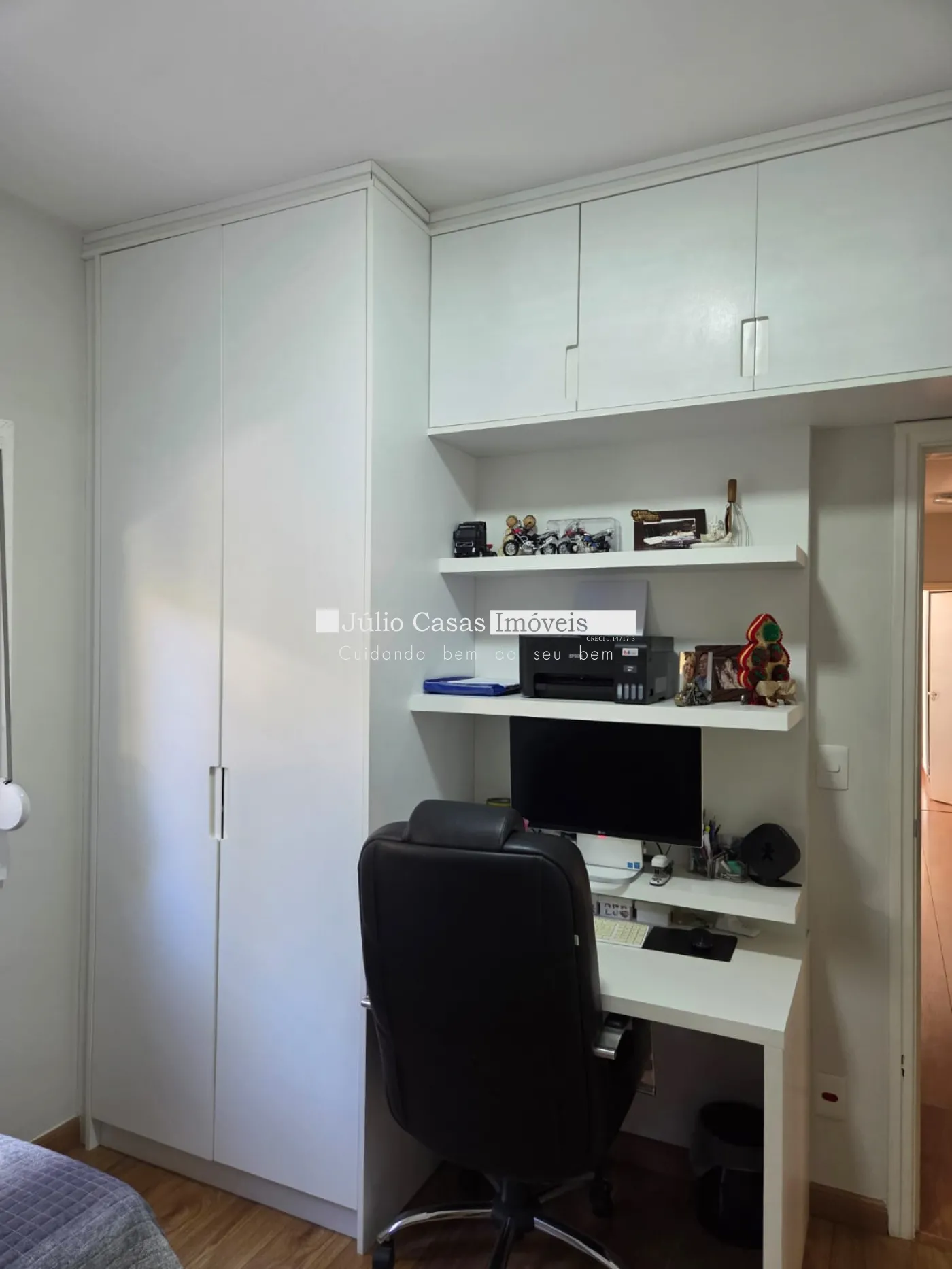Casa com 3 dormitórios, sendo 1 suíte e 2 quartos com banheiro, todos com armários planejados e ar condicionado.