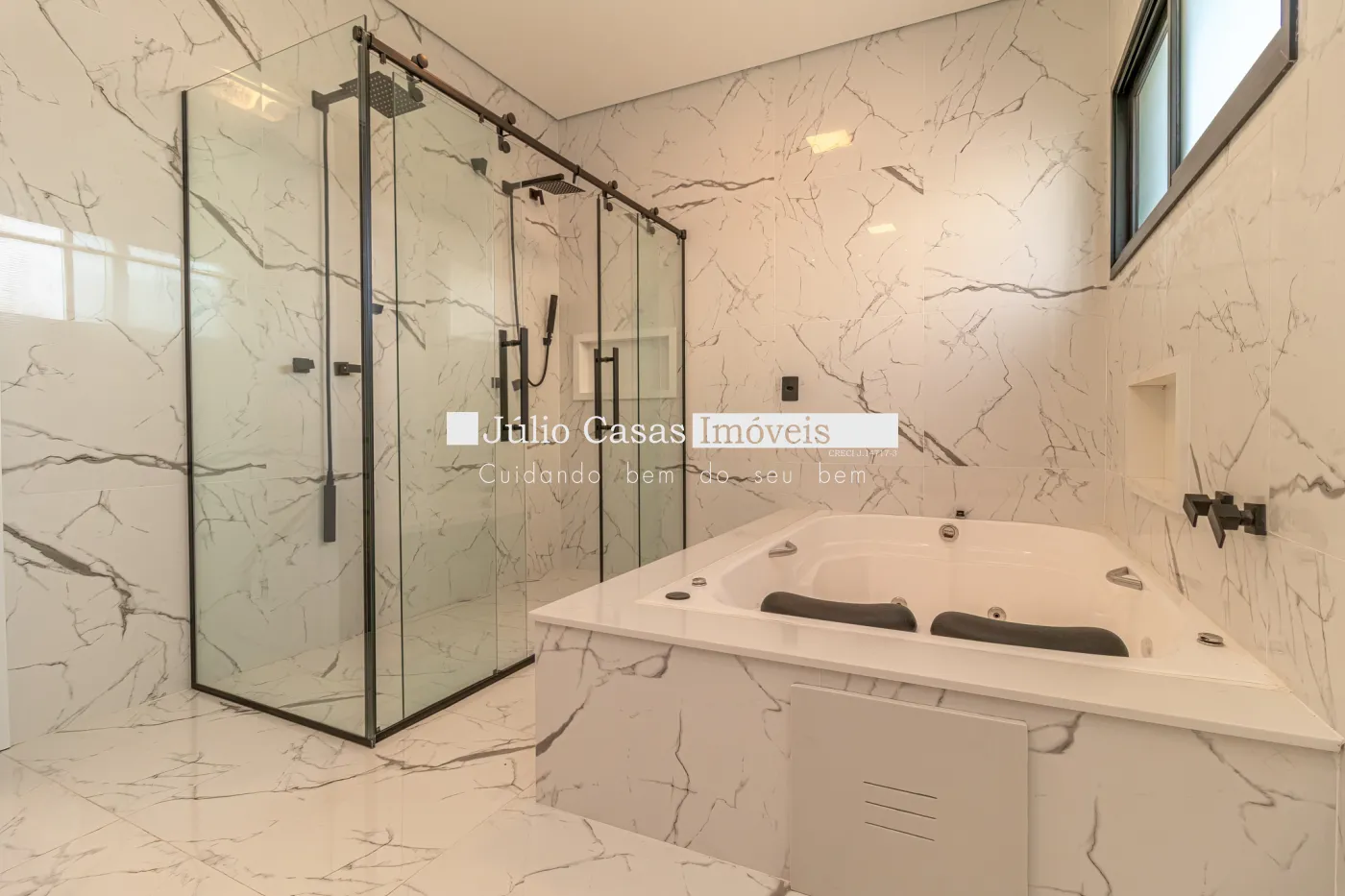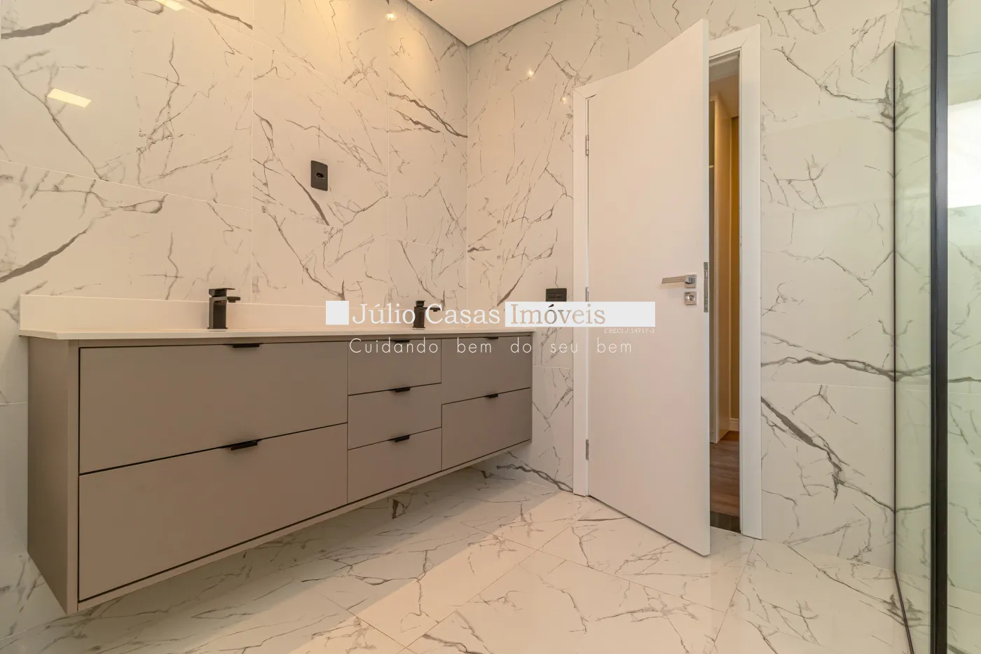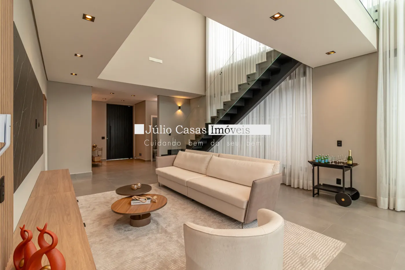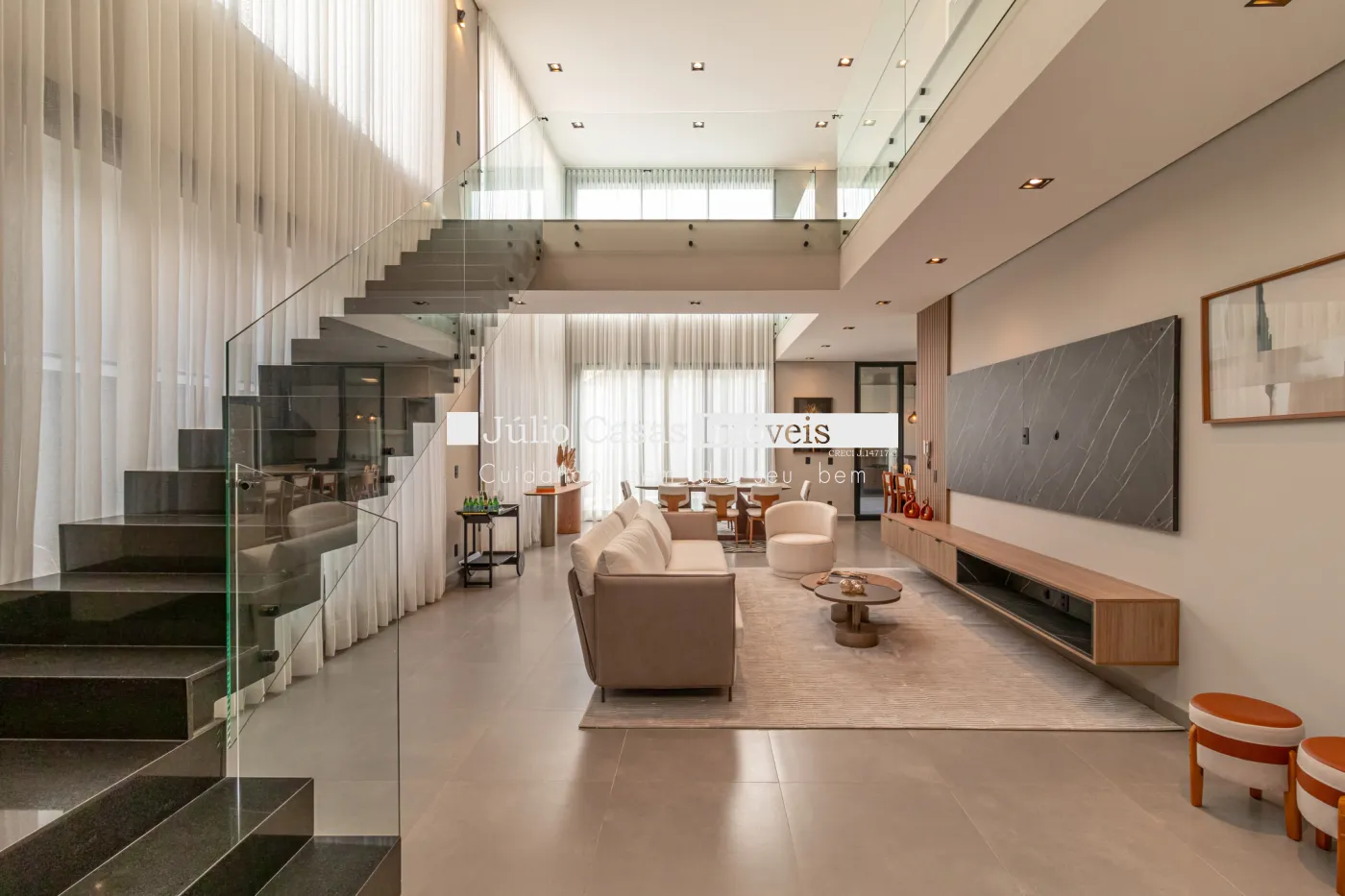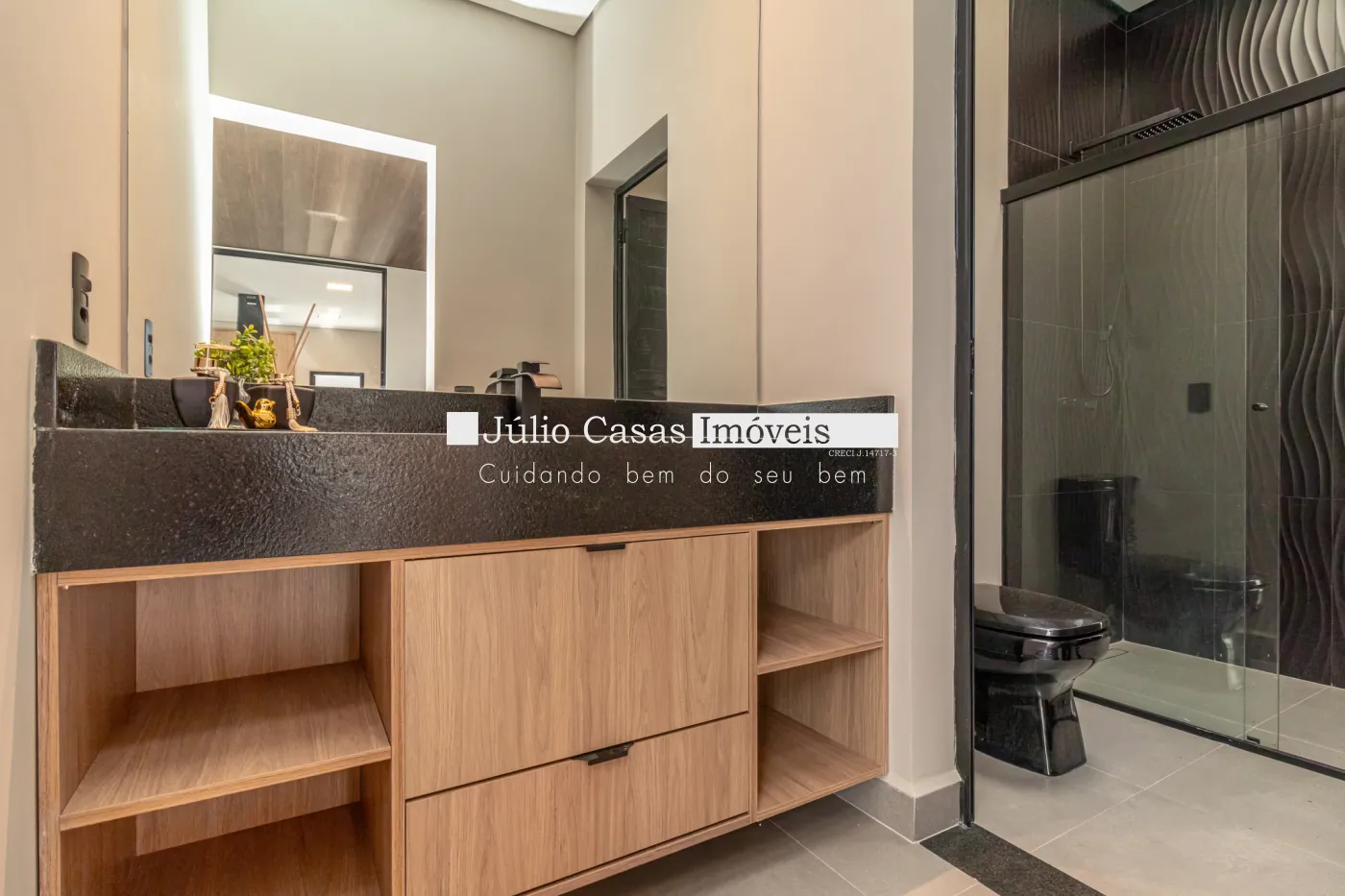 Requinte, qualidade e riqueza nos acabamentos. Possui 03 suítes no piso superior, sendo uma master (closet e banheira) e as outras com closet. No piso inferior possui um escritório, reversível para uma suíte, Lavabo andar térreo Armários planejados na casa completa. (Quartos, banheiros, cozinhas, despensa, lavanderia, sala TV), pisos em porcelanato acetinado cinza, piso vinifico nos dormitórios superiores cor madeira e rodapé polipropileno branco, todas as suítes com janelas amplas e automatizadas para maior iluminação e ventilação, esquadrias de alumínio linha Gold cor preta , portas dos dormitórios e banheiros na cor branco fosco, aquecedor solar e rede de água pressurizada e quente nas torneiras dos dormitórios, cozinha e espaço gourmet, preparação para ar-condicionado (suítes, sala estar, gourmet), banheiros com lavatórios em mármores , cozinha ampla ilha com cooktop, área Gourmet com ilha, cooktop, chopeira e churrasqueira, banheiro para atender o espaço gourmet e piscina, piscina com 10,85 m², com aquecimento solar e iluminação de LED, fachada diferenciada com BRISE em alumínio na cor madeira, circulação dos quartos com piso porcelanato e guarda corpo em vidro temperado , jardim com paisagismo na frente da casa, lavanderia espaçosa com bancada em granito, porta de entrada principal com fechadura digital, banheiros serão entregue com box, armário para despejo nos fundos, Garagem com ponto de preparação para carregador de carro elétrico