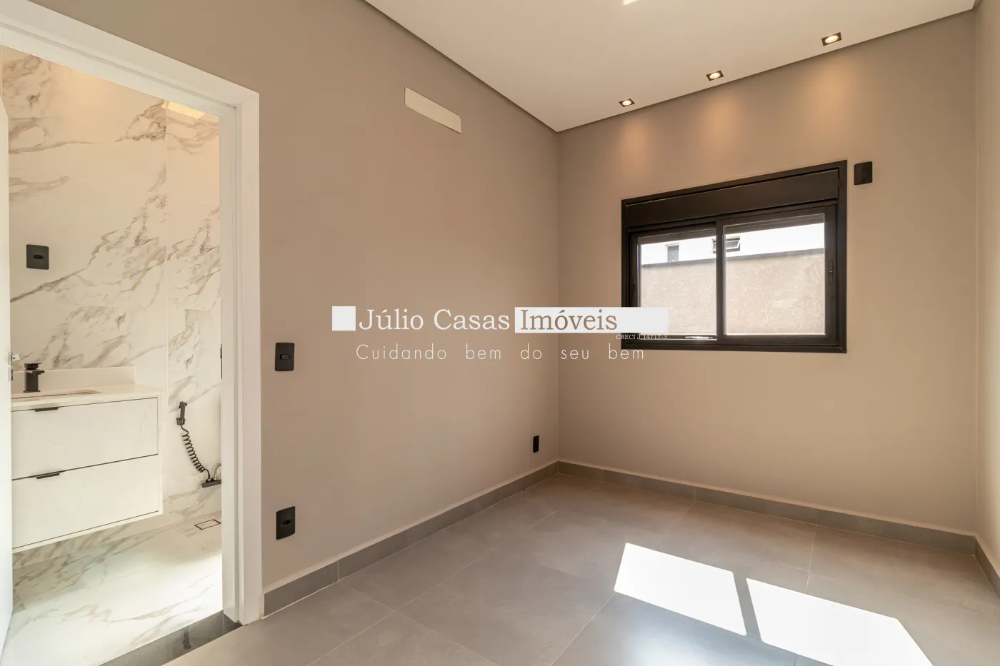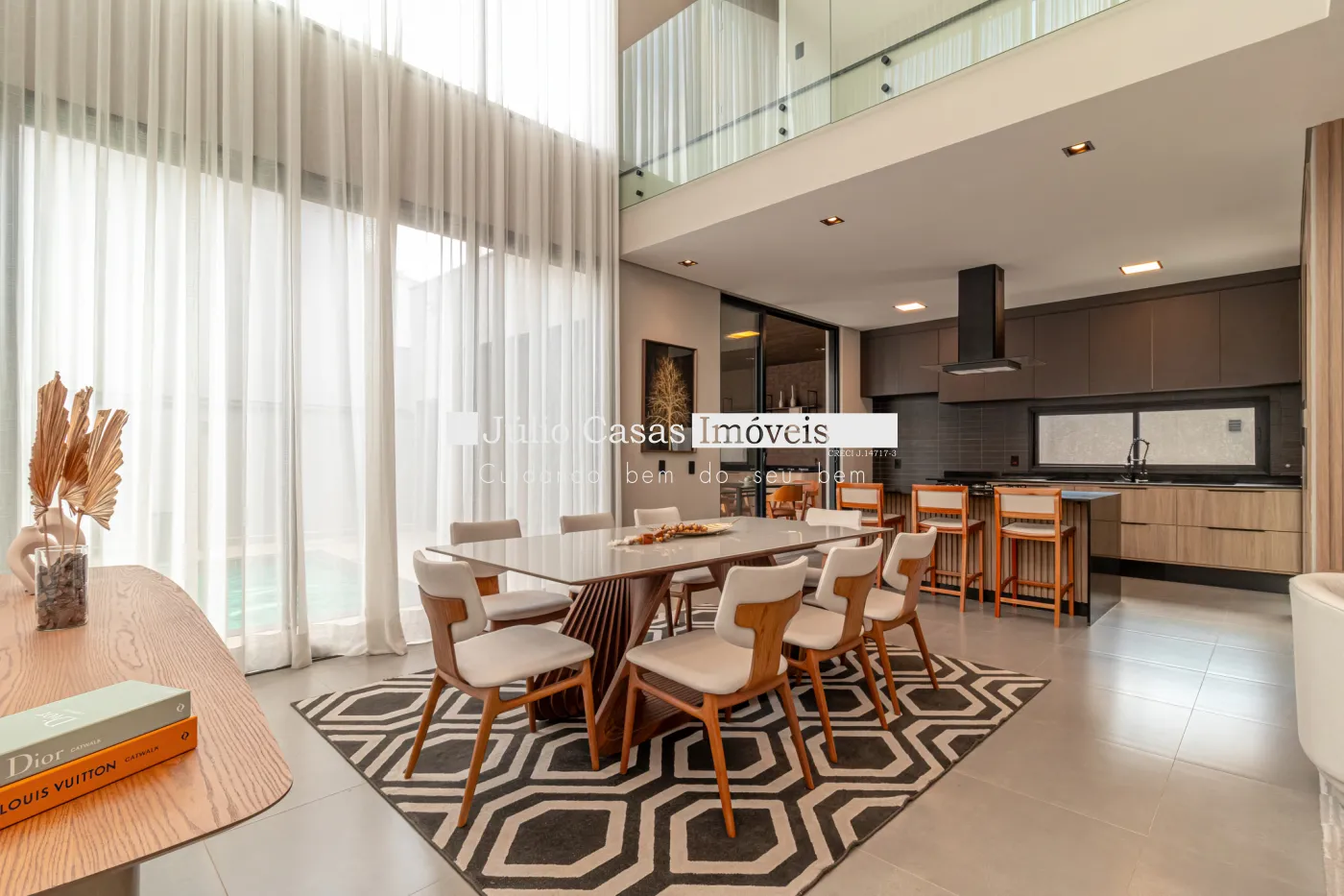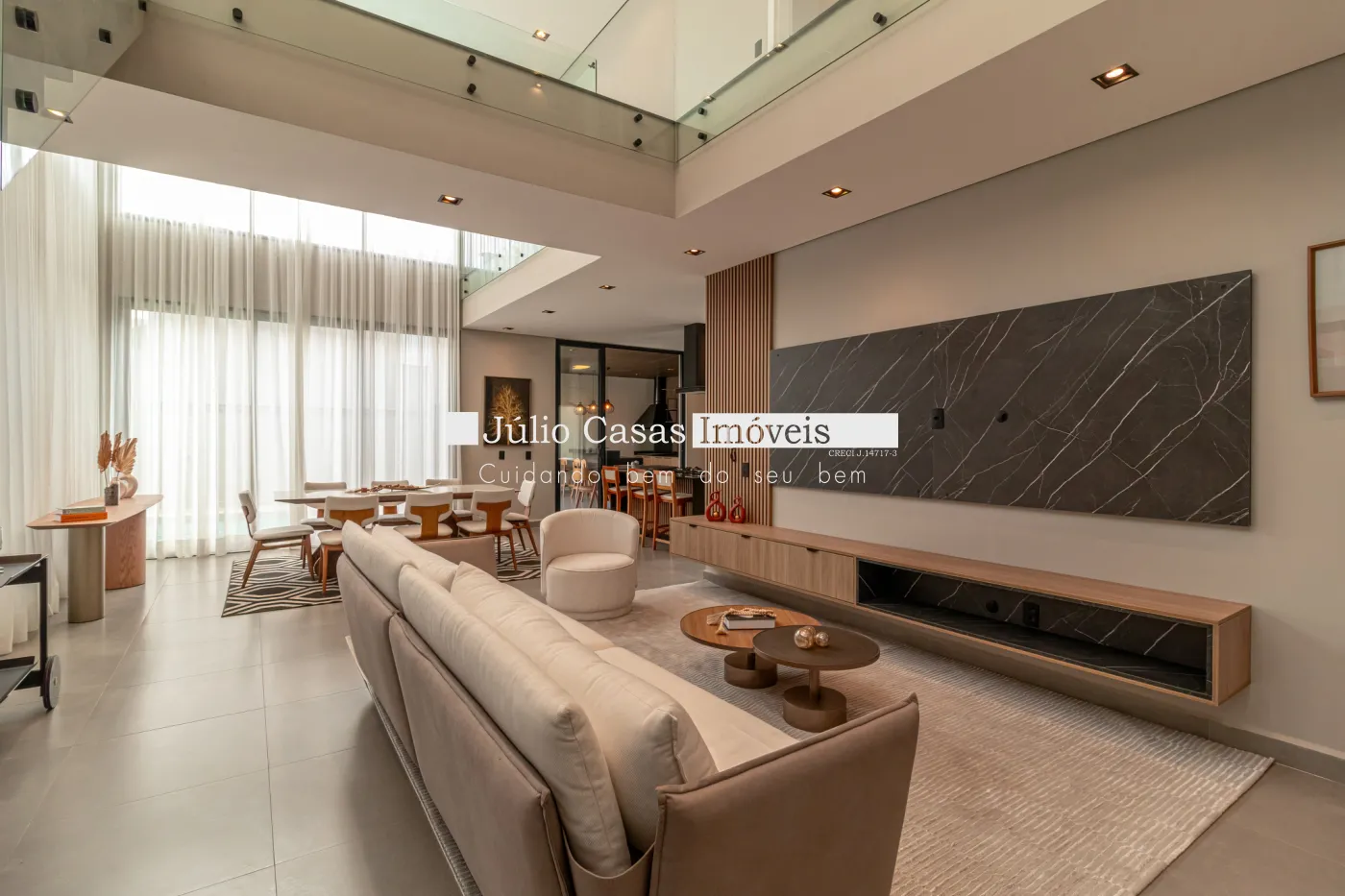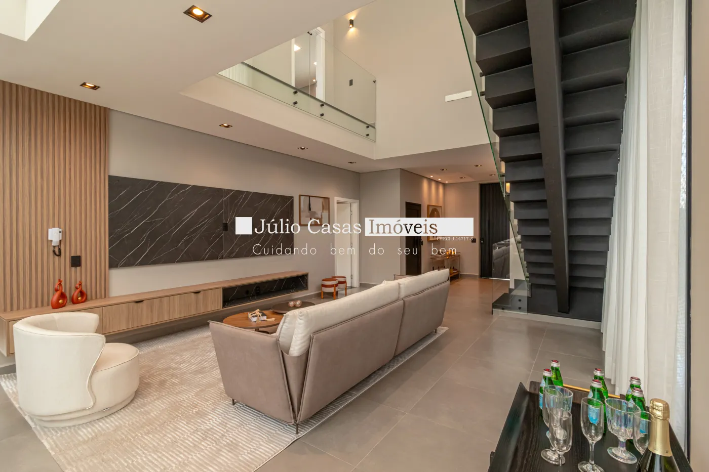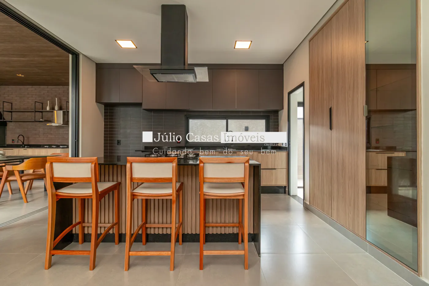 Requinte, qualidade e riqueza nos acabamentos. Possui 03 suítes no piso superior, sendo uma master (closet e banheira) e as outras com closet. No piso inferior possui um escritório, reversível para uma suíte, Lavabo andar térreo Armários planejados na casa completa. (Quartos, banheiros, cozinhas, despensa, lavanderia, sala TV), pisos em porcelanato acetinado cinza, piso vinifico nos dormitórios superiores cor madeira e rodapé polipropileno branco, todas as suítes com janelas amplas e automatizadas para maior iluminação e ventilação, esquadrias de alumínio linha Gold cor preta , portas dos dormitórios e banheiros na cor branco fosco, aquecedor solar e rede de água pressurizada e quente nas torneiras dos dormitórios, cozinha e espaço gourmet, preparação para ar-condicionado (suítes, sala estar, gourmet), banheiros com lavatórios em mármores , cozinha ampla ilha com cooktop, área Gourmet com ilha, cooktop, chopeira e churrasqueira, banheiro para atender o espaço gourmet e piscina, piscina com 10,85 m², com aquecimento solar e iluminação de LED, fachada diferenciada com BRISE em alumínio na cor madeira, circulação dos quartos com piso porcelanato e guarda corpo em vidro temperado , jardim com paisagismo na frente da casa, lavanderia espaçosa com bancada em granito, porta de entrada principal com fechadura digital, banheiros serão entregue com box, armário para despejo nos fundos, Garagem com ponto de preparação para carregador de carro elétrico