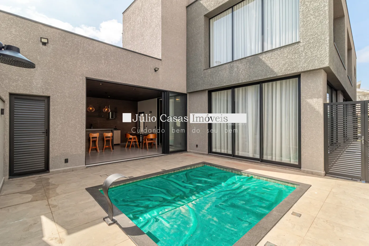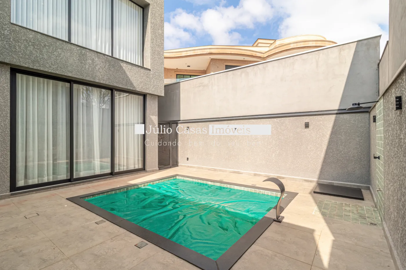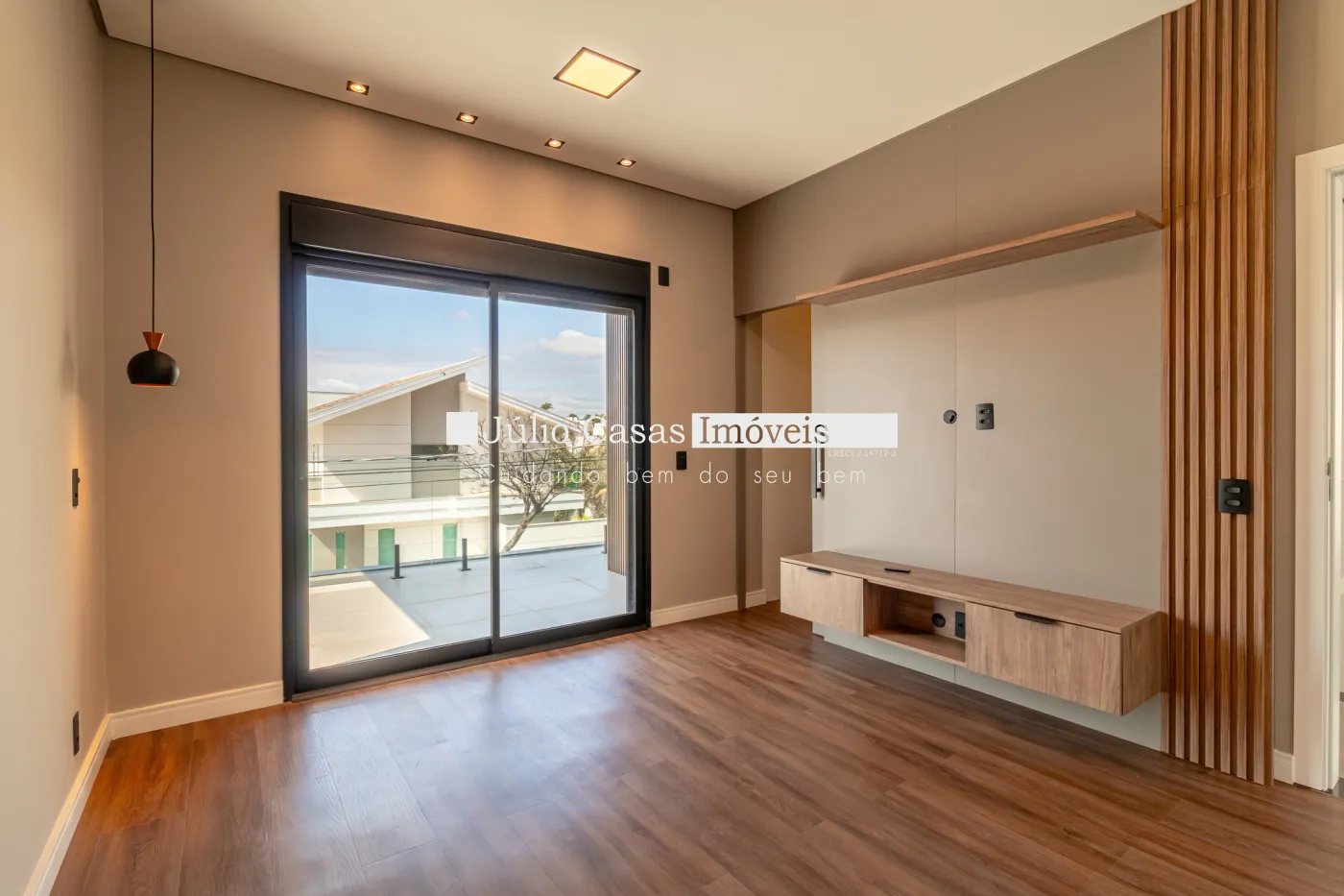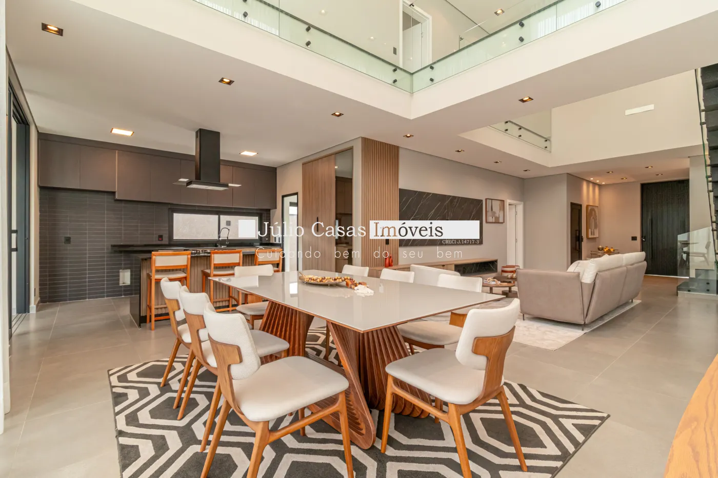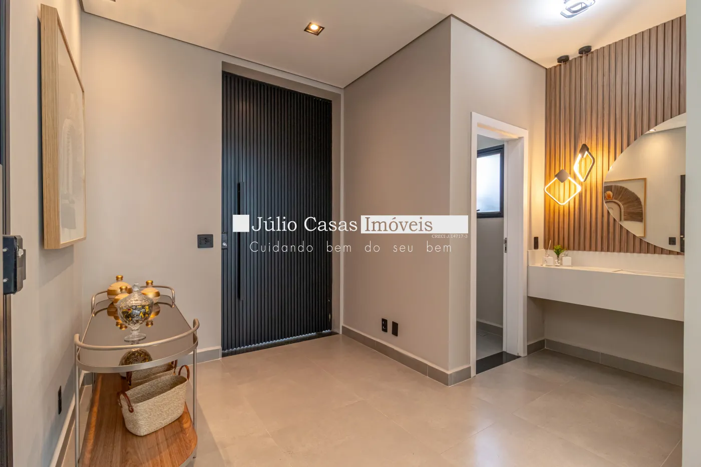 Requinte, qualidade e riqueza nos acabamentos. Possui 03 suítes no piso superior, sendo uma master (closet e banheira) e as outras com closet. No piso inferior possui um escritório, reversível para uma suíte, Lavabo andar térreo Armários planejados na casa completa. (Quartos, banheiros, cozinhas, despensa, lavanderia, sala TV), pisos em porcelanato acetinado cinza, piso vinifico nos dormitórios superiores cor madeira e rodapé polipropileno branco, todas as suítes com janelas amplas e automatizadas para maior iluminação e ventilação, esquadrias de alumínio linha Gold cor preta , portas dos dormitórios e banheiros na cor branco fosco, aquecedor solar e rede de água pressurizada e quente nas torneiras dos dormitórios, cozinha e espaço gourmet, preparação para ar-condicionado (suítes, sala estar, gourmet), banheiros com lavatórios em mármores , cozinha ampla ilha com cooktop, área Gourmet com ilha, cooktop, chopeira e churrasqueira, banheiro para atender o espaço gourmet e piscina, piscina com 10,85 m², com aquecimento solar e iluminação de LED, fachada diferenciada com BRISE em alumínio na cor madeira, circulação dos quartos com piso porcelanato e guarda corpo em vidro temperado , jardim com paisagismo na frente da casa, lavanderia espaçosa com bancada em granito, porta de entrada principal com fechadura digital, banheiros serão entregue com box, armário para despejo nos fundos, Garagem com ponto de preparação para carregador de carro elétrico