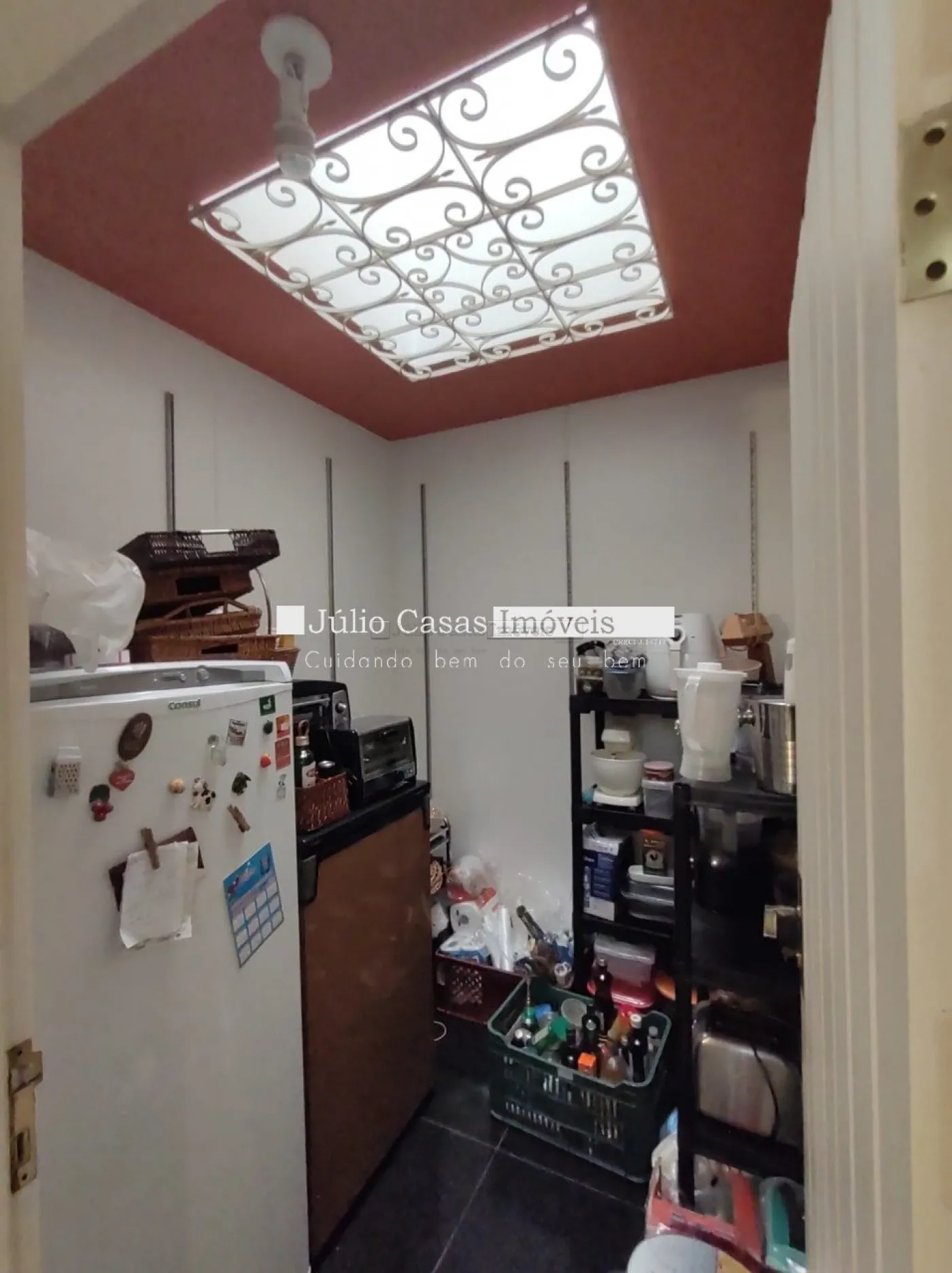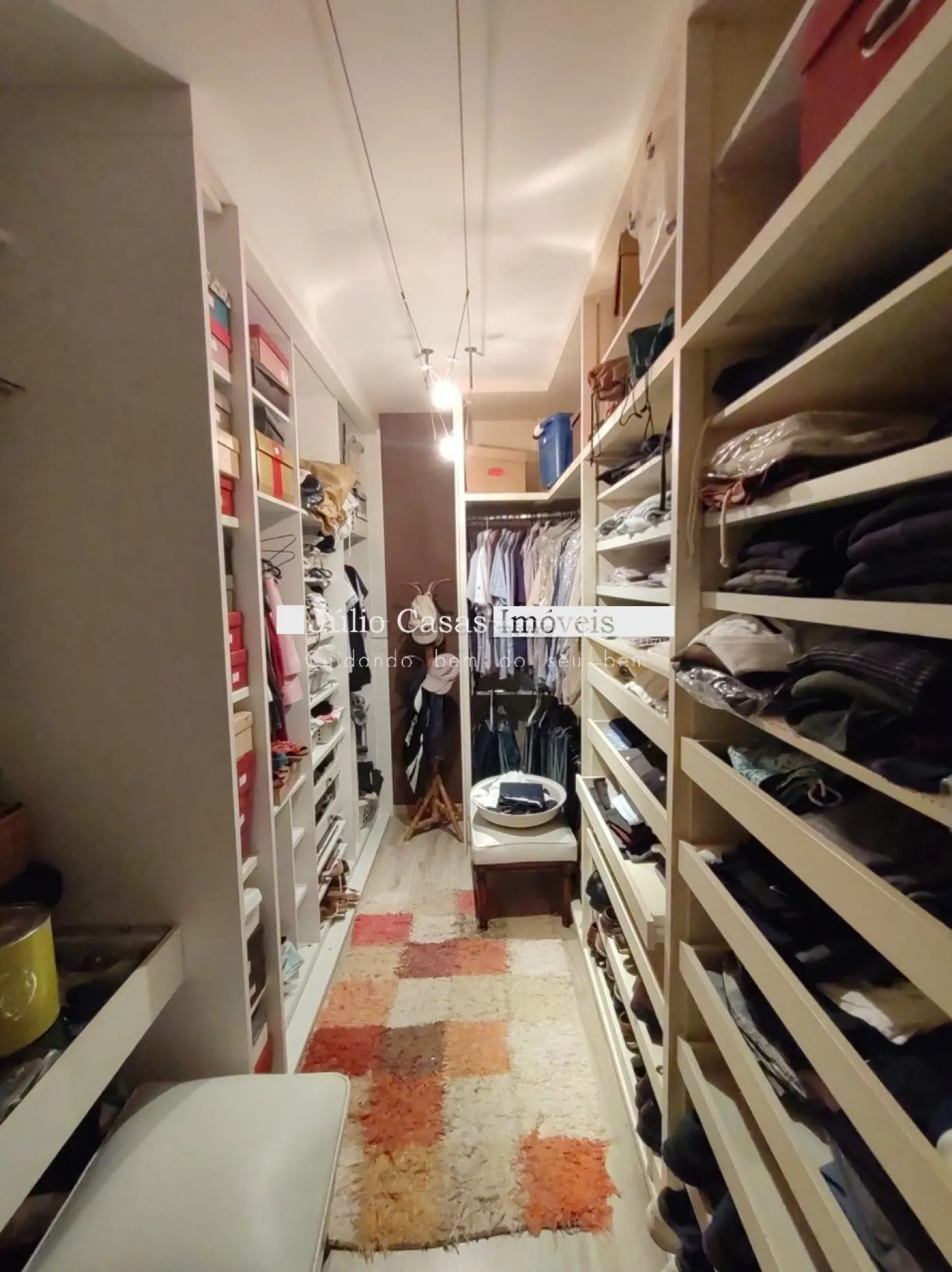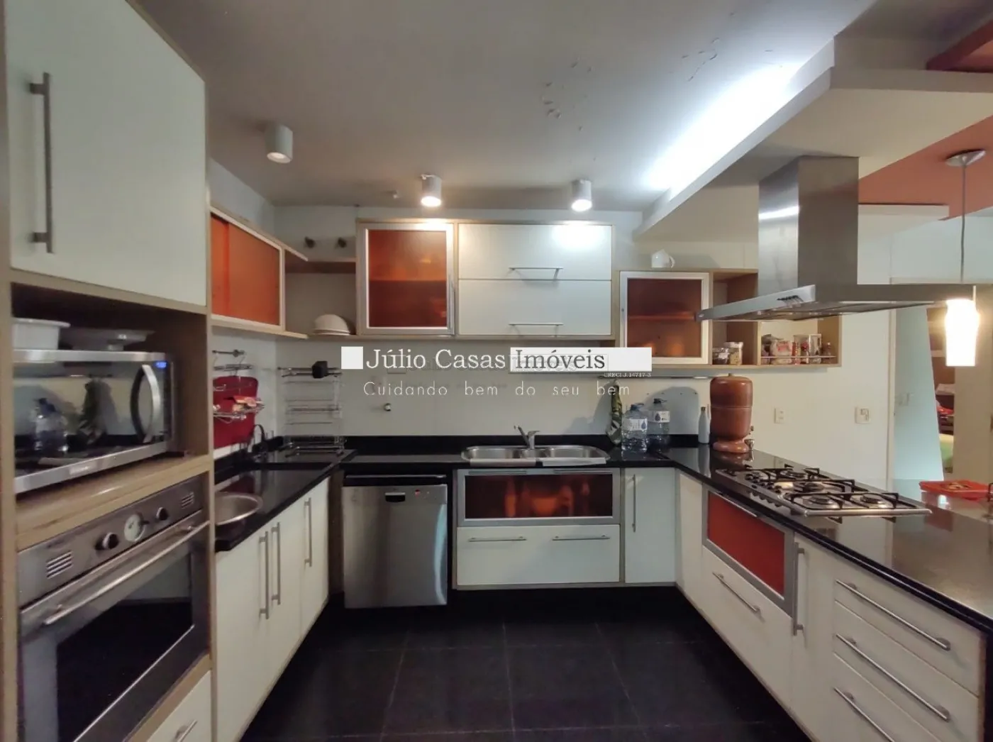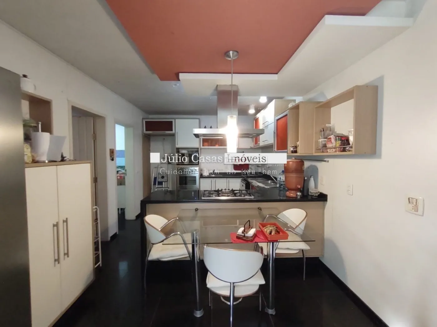A casa dispõe de quatro suítes, todas moduladas, sendo uma delas com hidromassagem. Há um amplo jardim com acabamentos em pedra, além de closet e roupeiro no corredor entre os dormitórios. A cozinha é totalmente azulejada até o teto, equipada com móveis planejados, ilha com bancada de granito, coifa em inox e despensa. A área de serviço é espaçosa, com lavanderia grande, dependência de empregada completa e varanda técnica.