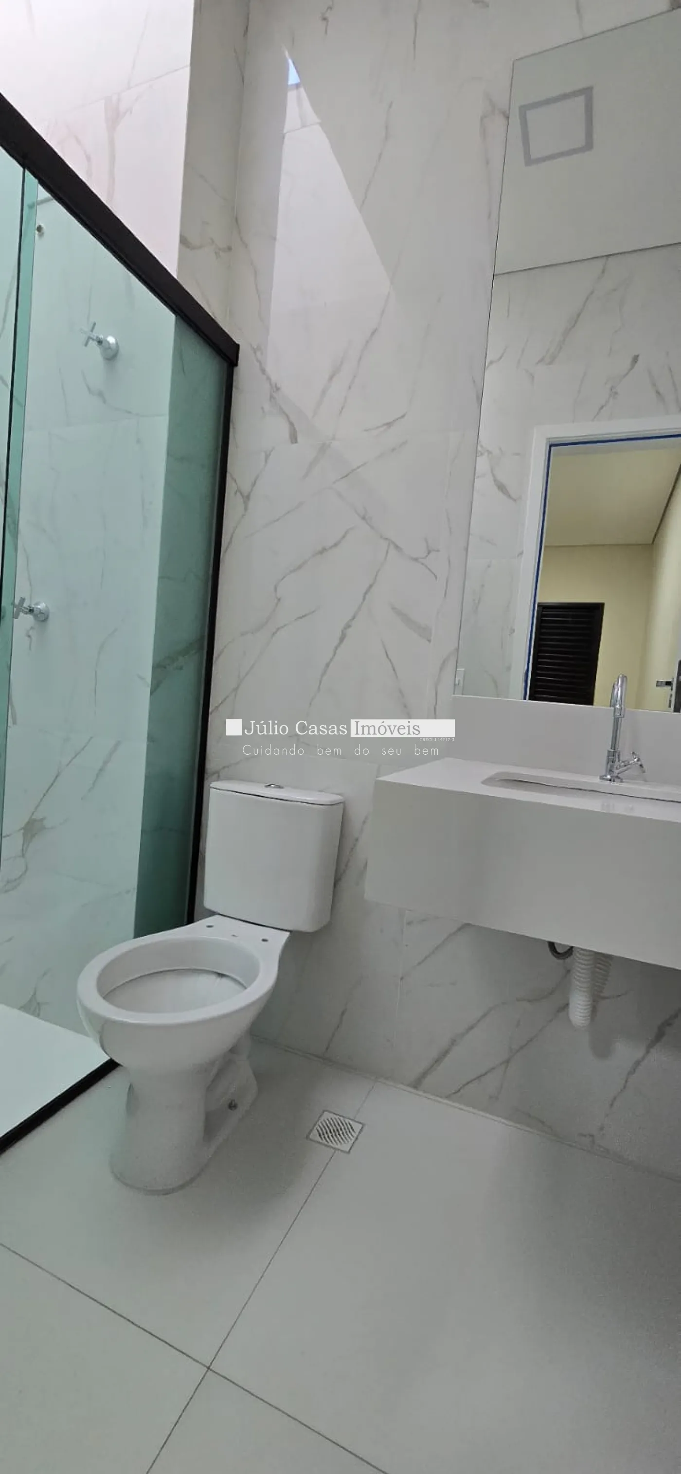 - os banheiros contam com revestimento até o teto e pias esculpidas em Branco Prime.