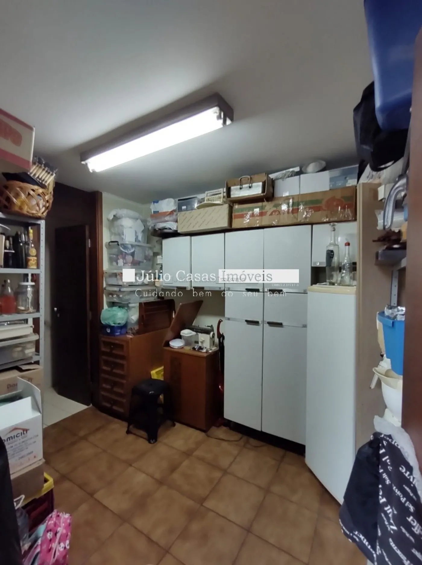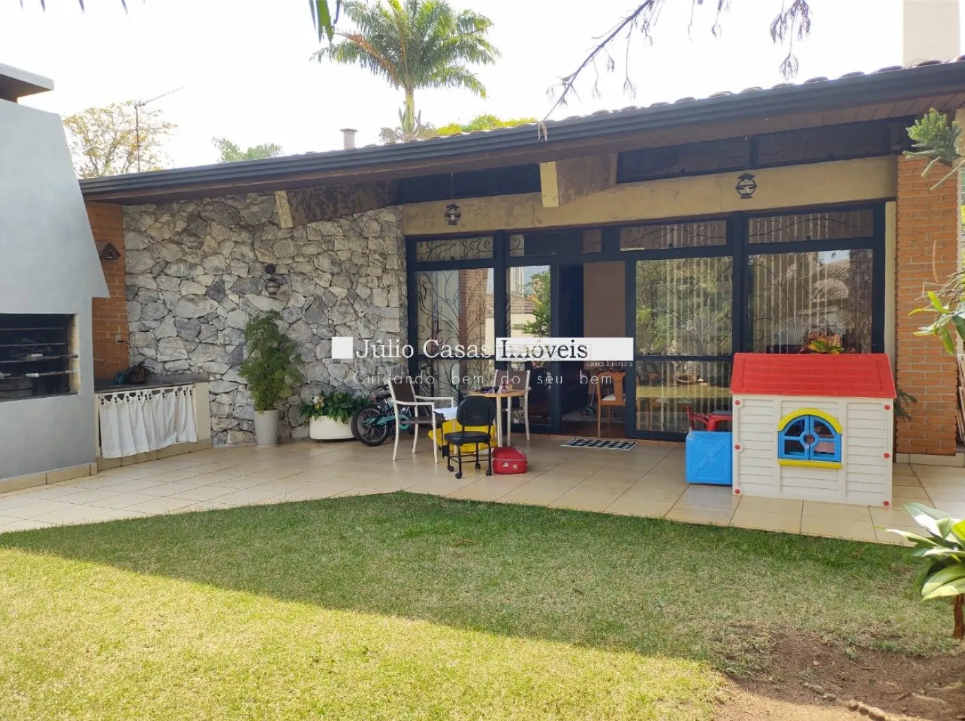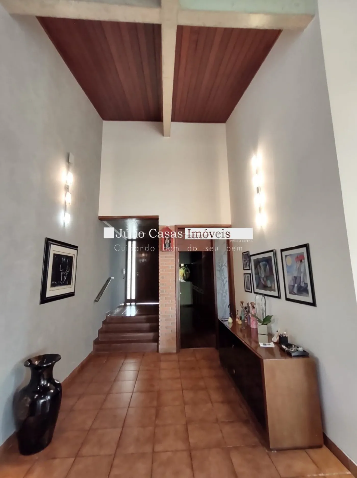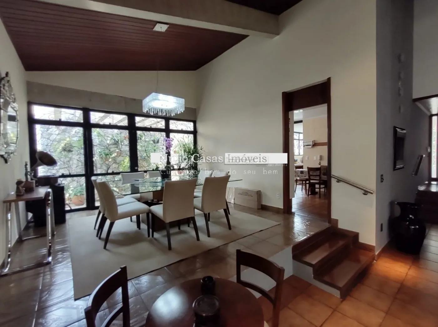 Casa térrea com excelente localização em uma rua sem saída e com guarita 24h. O imóvel possui uma sala com pé direito duplo e duas salas integradas, uma de estar e outra de jantar, além de um lavabo. A cozinha é equipada com armários, e a área de serviço inclui uma dependência de empregada completa.