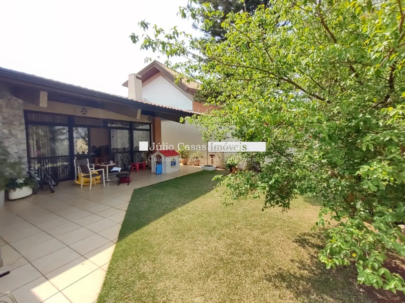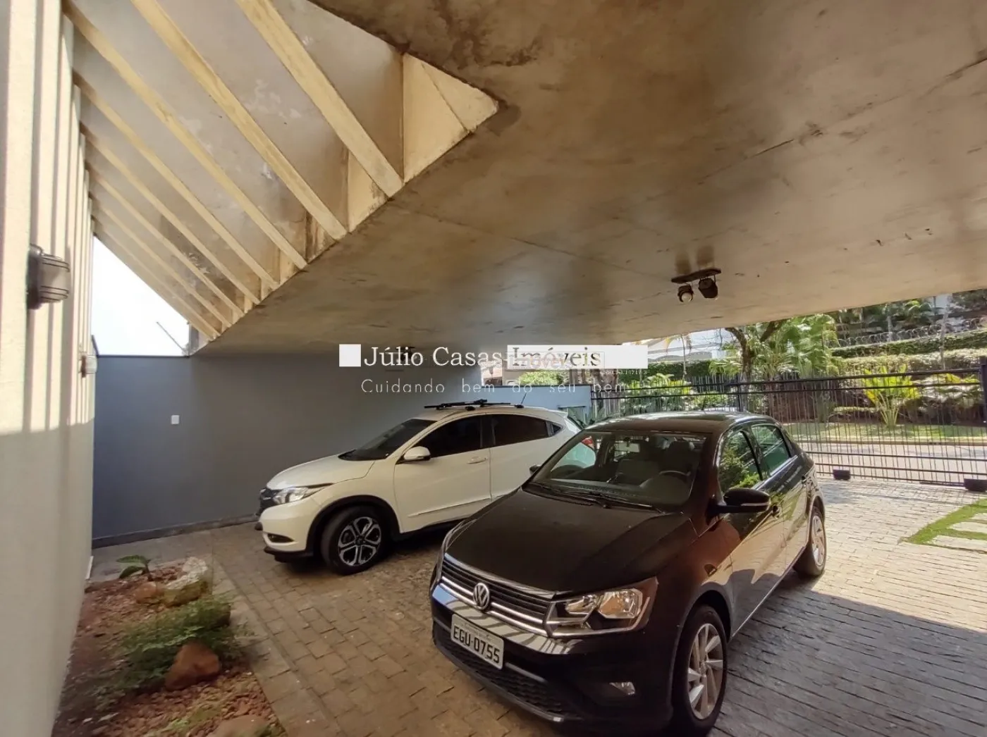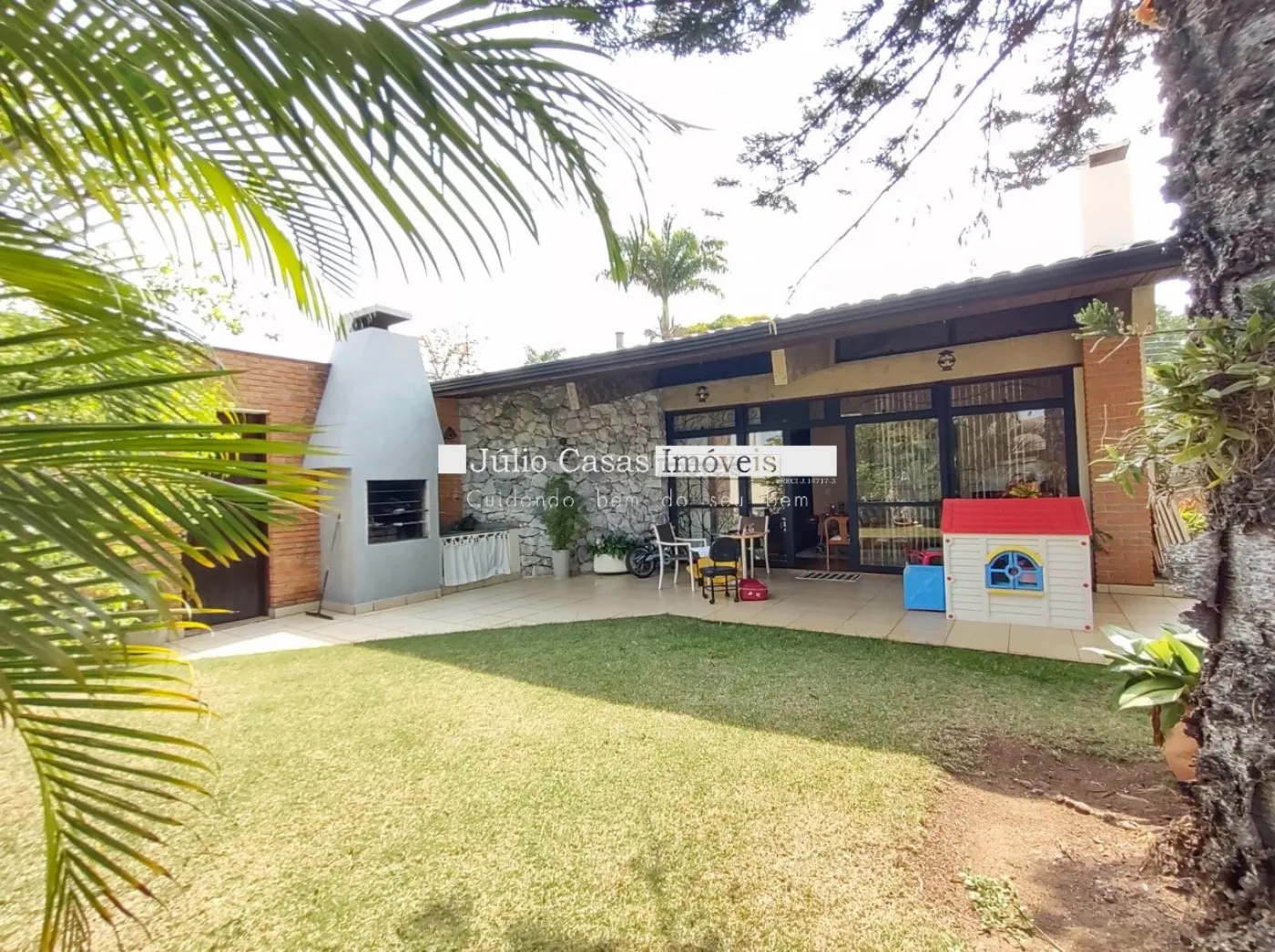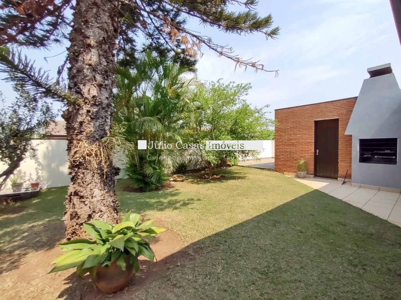 A casa conta com quatro dormitórios, sendo dois suítes, incluindo uma suíte máster com closet. Há também um banheiro social. O quintal é grande e conta com depósito, churrasqueira e uma varanda para lazer. A casa possui piso em madeira nas áreas quentes e cerâmico nas áreas frias. A garagem é coberta e comporta três veículos.