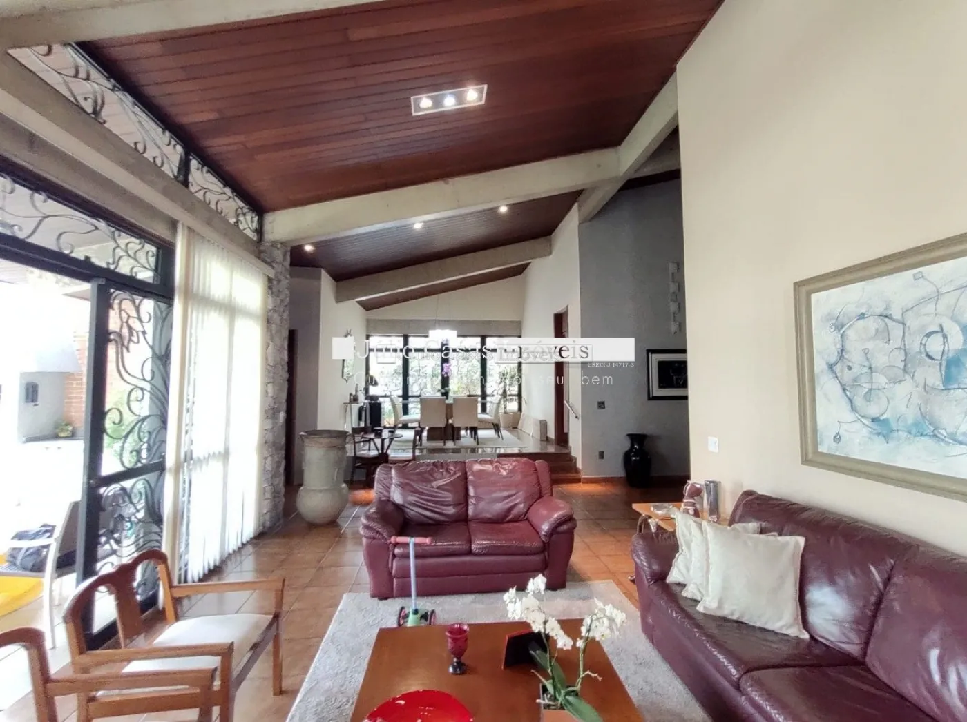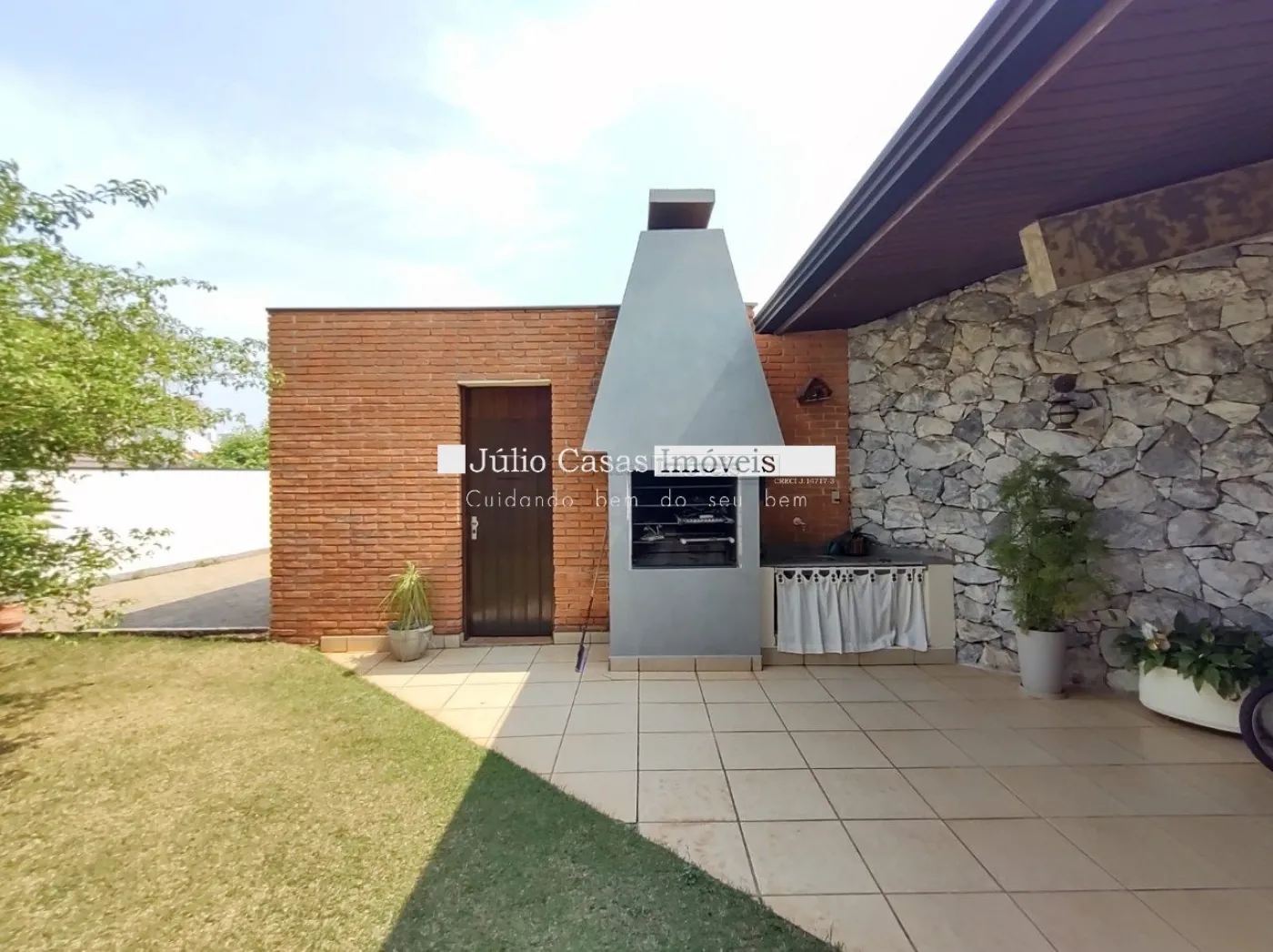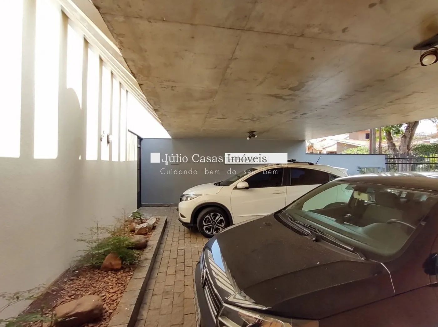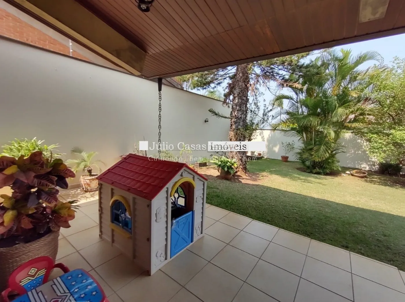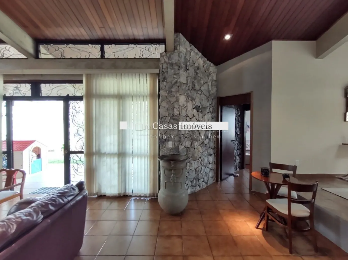 A casa conta com quatro dormitórios, sendo dois suítes, incluindo uma suíte máster com closet. Há também um banheiro social. O quintal é grande e conta com depósito, churrasqueira e uma varanda para lazer. A casa possui piso em madeira nas áreas quentes e cerâmico nas áreas frias. A garagem é coberta e comporta três veículos.