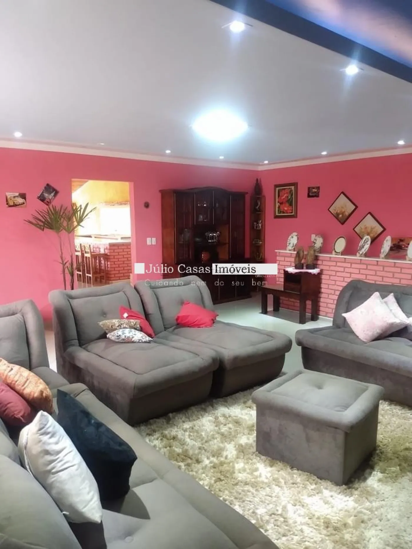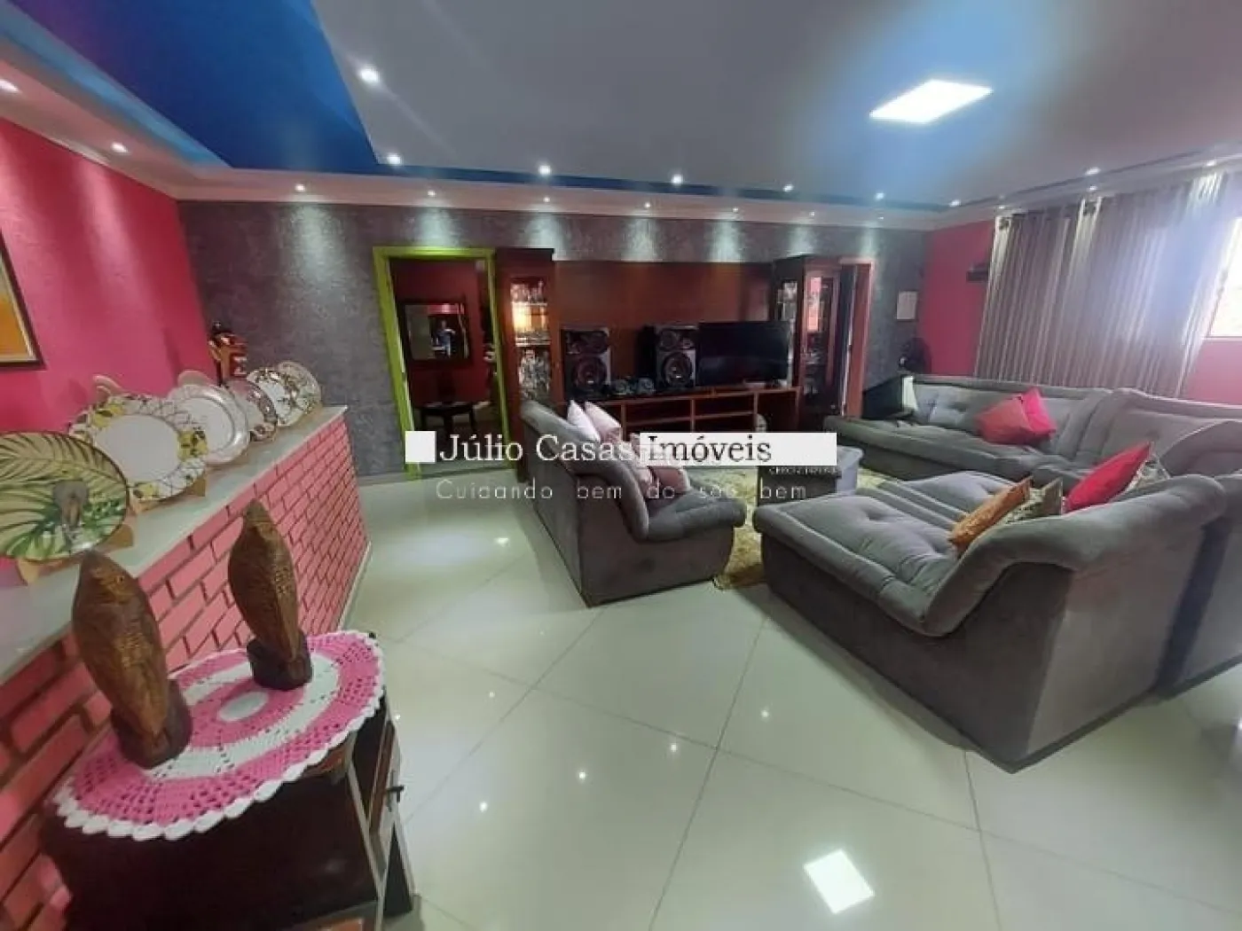 Sobrado com 6 dormitórios, sendo 4 suítes, 3 salas amplas, 2 cozinhas , copa dispensa, , 1 salão amplo, 1 sala de visitas, área de luz , sacada toda fechada , espaço de jardim e vários pés de frutas . Armários embutidos nos quartos e cozinha . Entrada da casa toda coberta com jardim . Garagem para 4 carros descobertas.