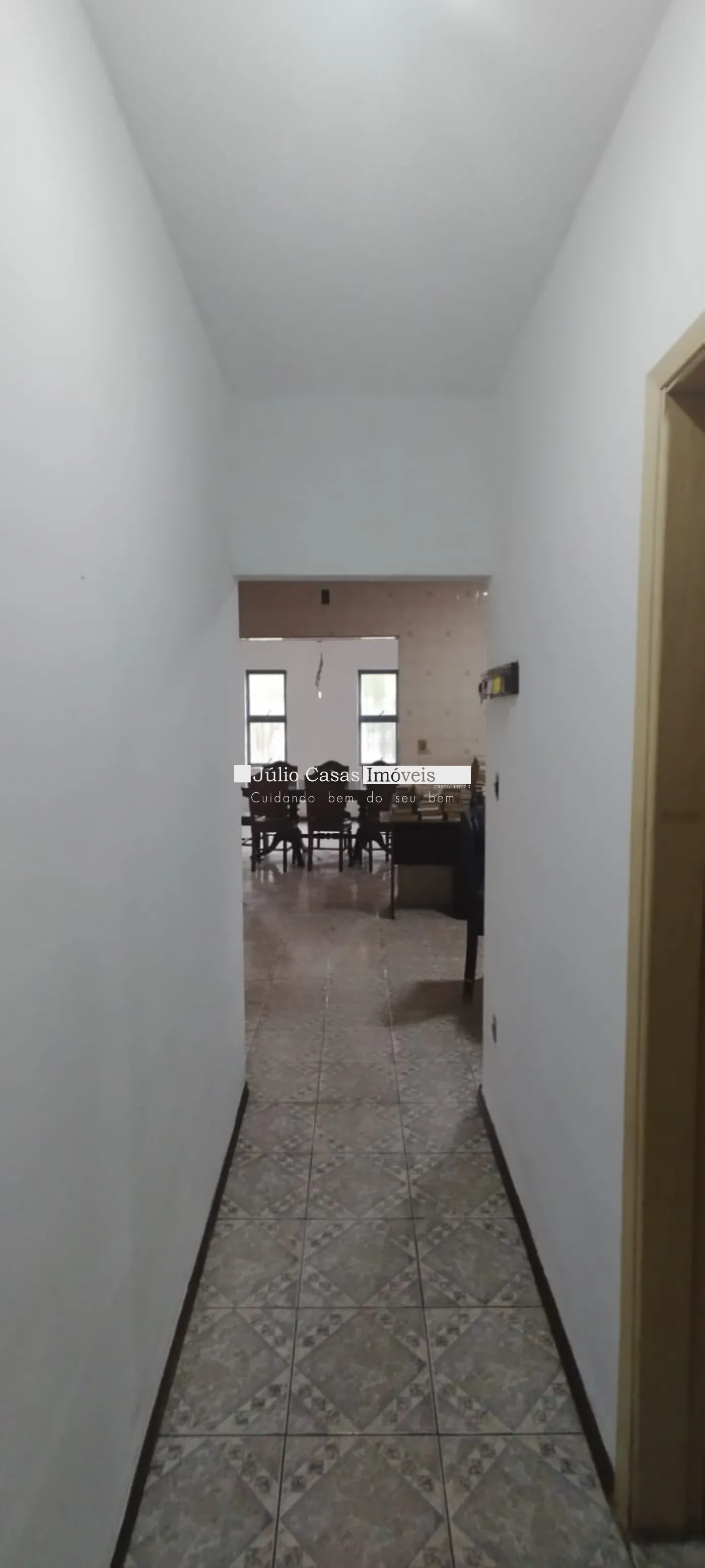 A casa é de laje e possui uma sala ampla, cozinha e um corredor que distribui 3 quartos e um banheiro. A cozinha e o banheiro estão revestidos com azulejo até o teto, e toda a casa está em piso cerâmico.