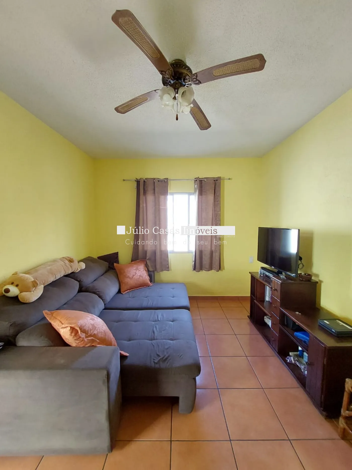 Sala ampla com 2 quartos 1 sendo suíte, wc social, cozinha grande casa toda em piso cerâmico.