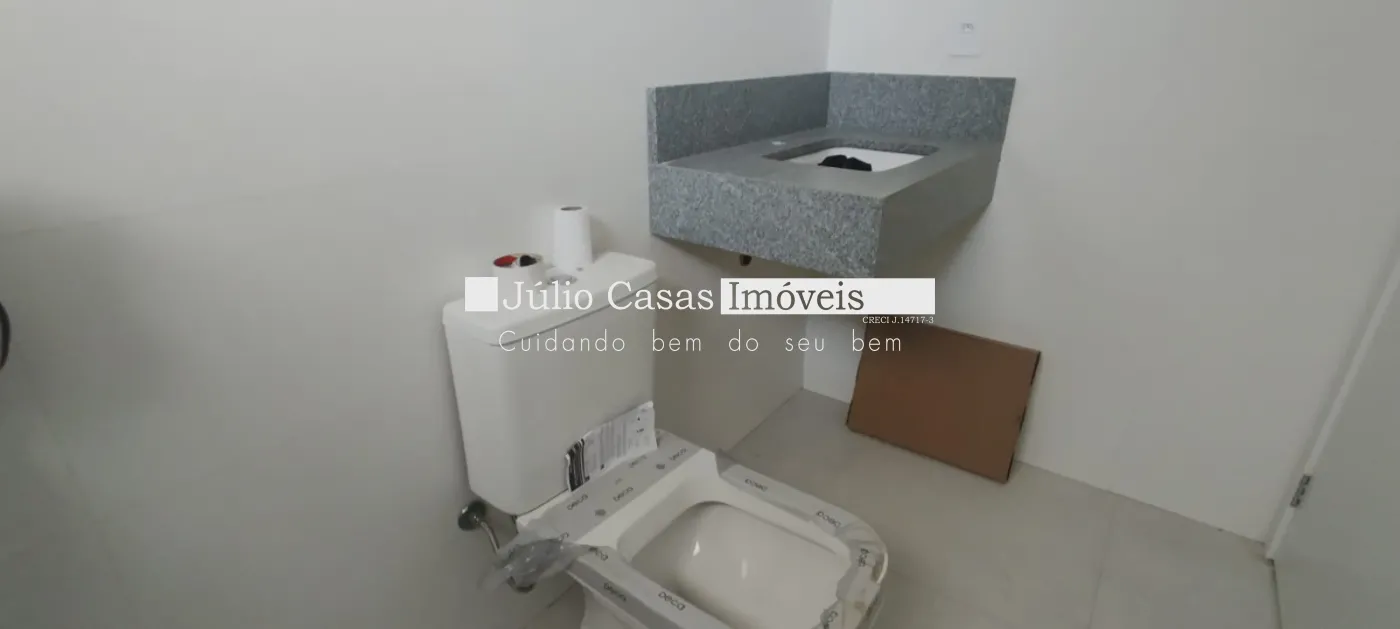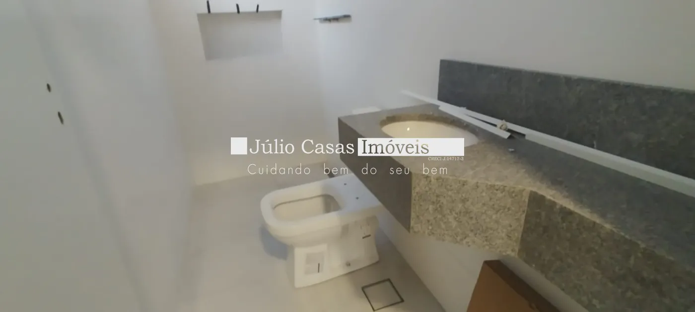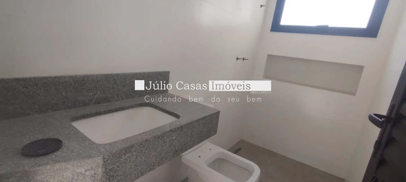 Os banheiros são equipados com pia em granito, revestimento nas paredes, nicho e bacia sanitária Deca, proporcionando conforto e elegância.