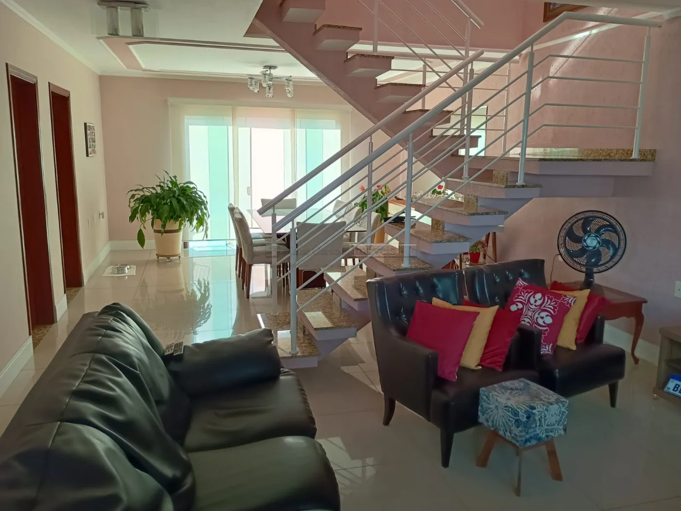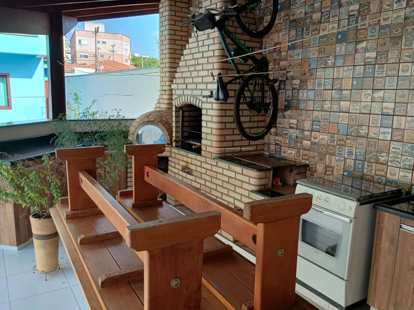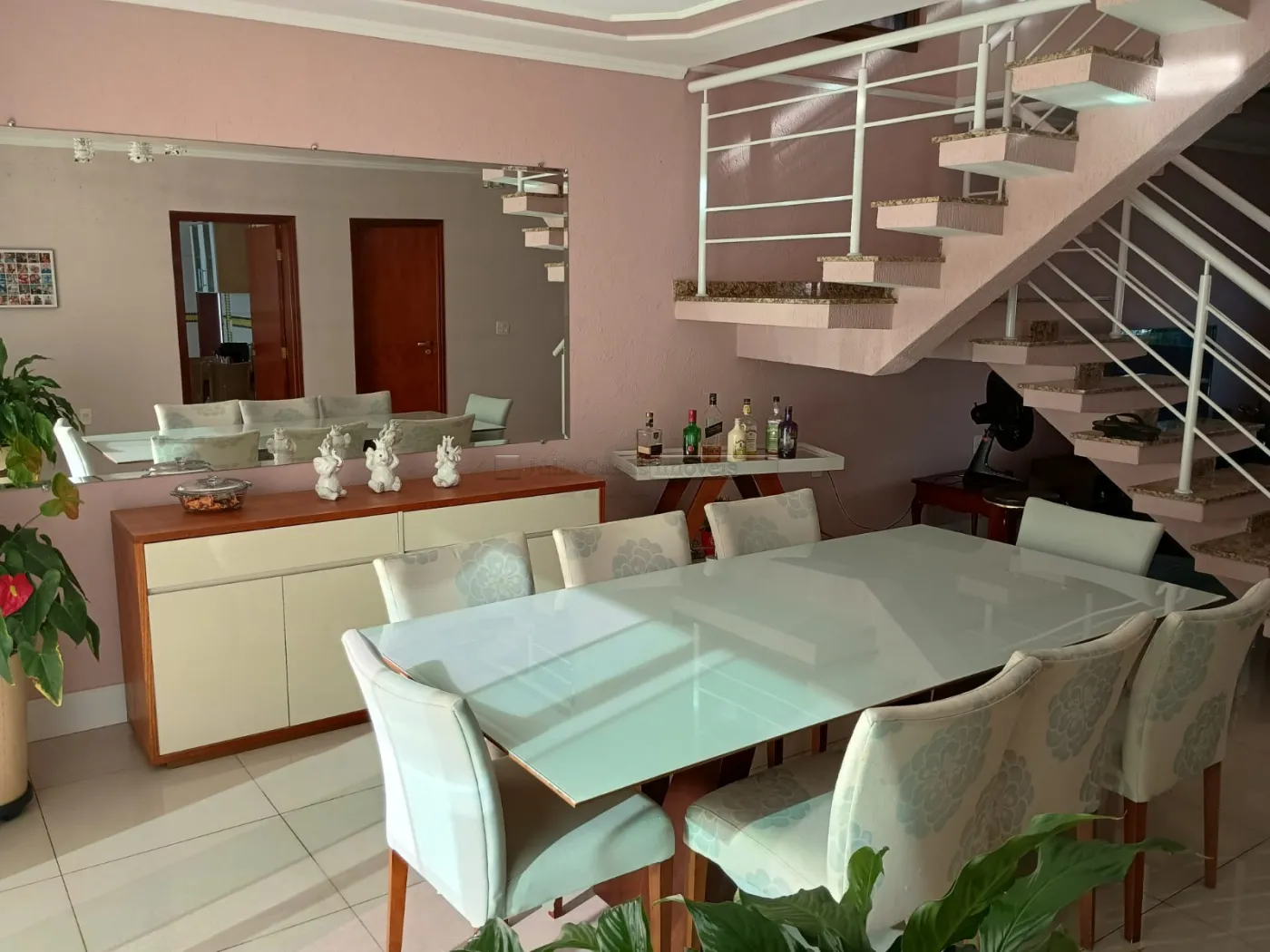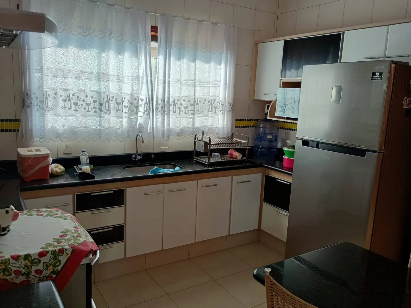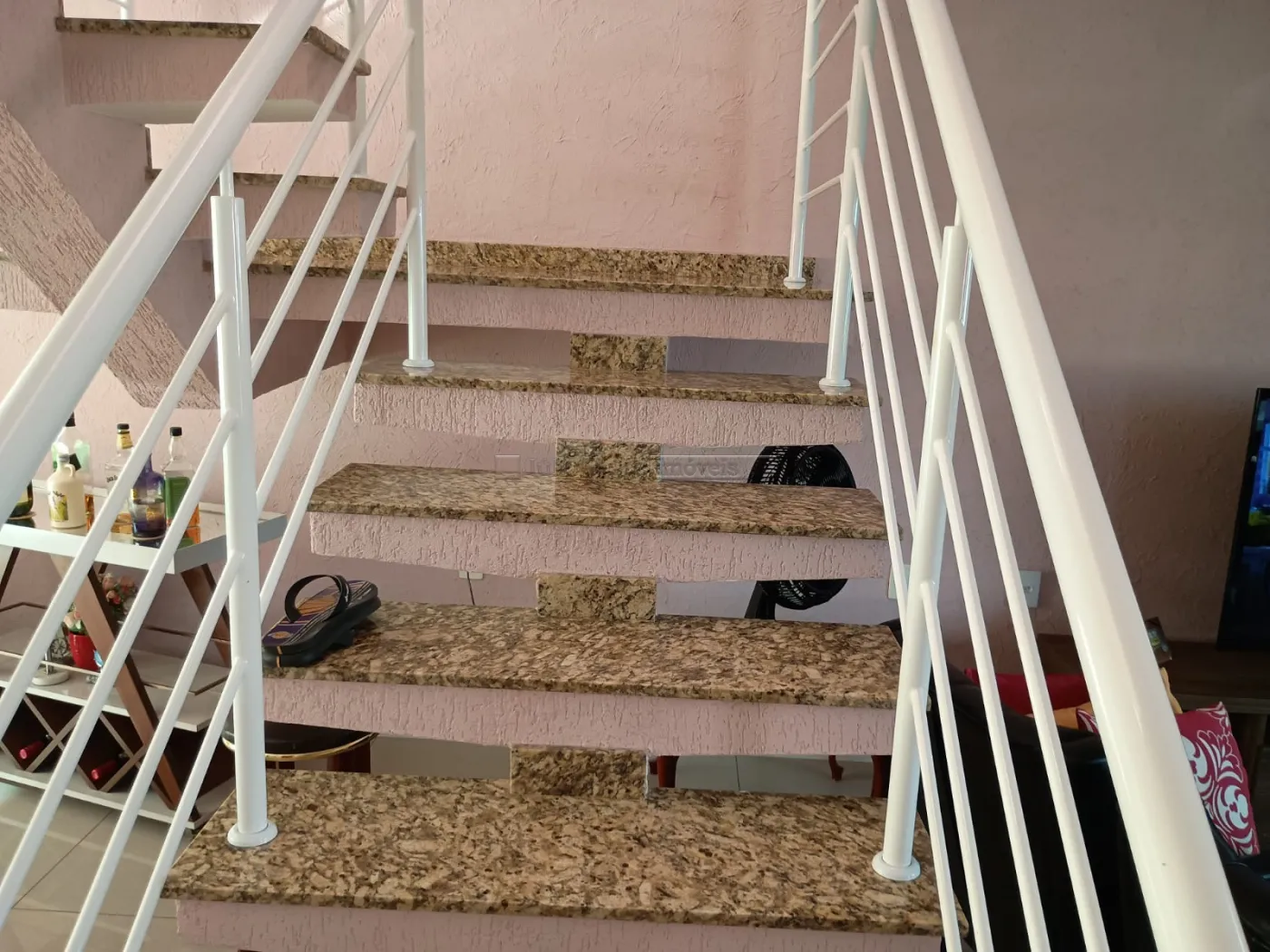 Espaçosa sala em dois ambientes com piso em porcelanato polido, forro em gesso e sanca, e lavabo. Cozinha com paredes azulejadas até o teto, repleta de armários modulados, pia em granito preto absoluto e anexa, uma prática lavanderia. No quintal espaço gourmet com churrasqueira, forno e fogão à lenha junto a piscina com cascata. Escadas com degraus revestidos em granito São Gabriel e corrimão em alumínio pintado na cor branca que levam ao andar superior que é constituído por três suítes com piso em laminado de madeira, moduladas e com sacada. Na suíte master conta com prático closet. Em bairro plenamente servido por comércio em geral, próximo a escolas supermercados, farmácias e fácil acesso à rodovia Raposo Tavares e à Castelinho.