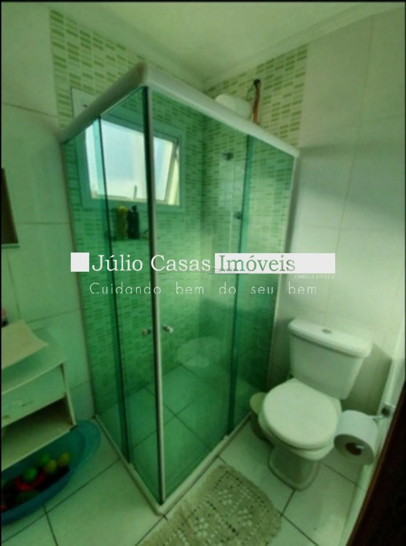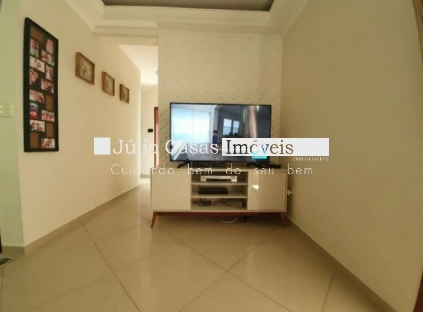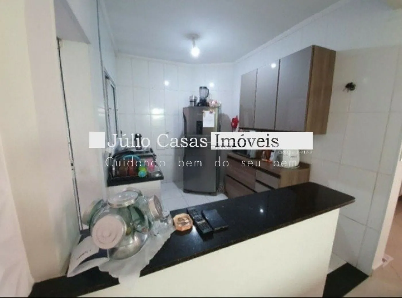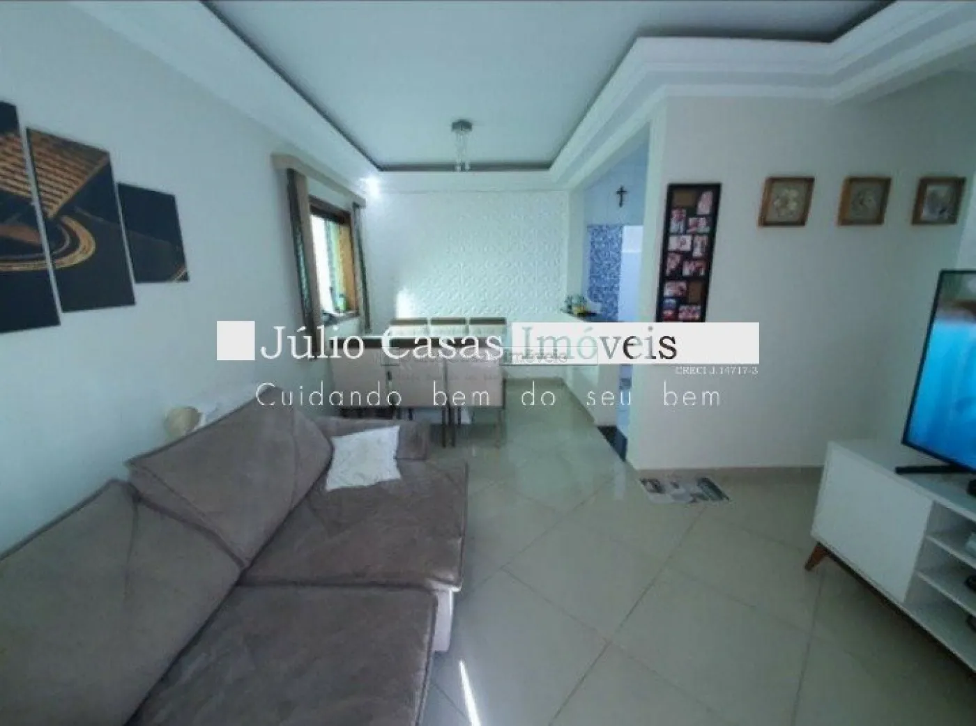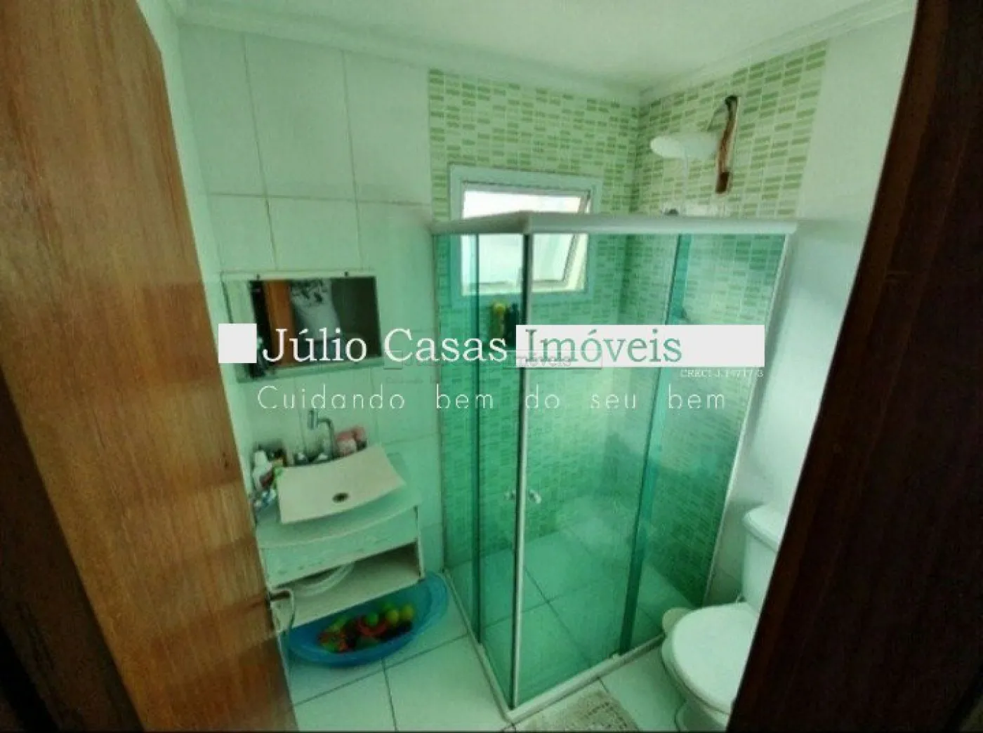 sala 2 ambientes em piso porcelanato e sanca em acabamento em gesso, cozinha americana com azulejo até o teto, pia em granito e gabinete, lavanderia , dois dormitórios, sendo um com sacada com vista para frente da casa e modulado, , banheiro com azulejos até o teto com box em vidro verde, garagem coberta para um carro