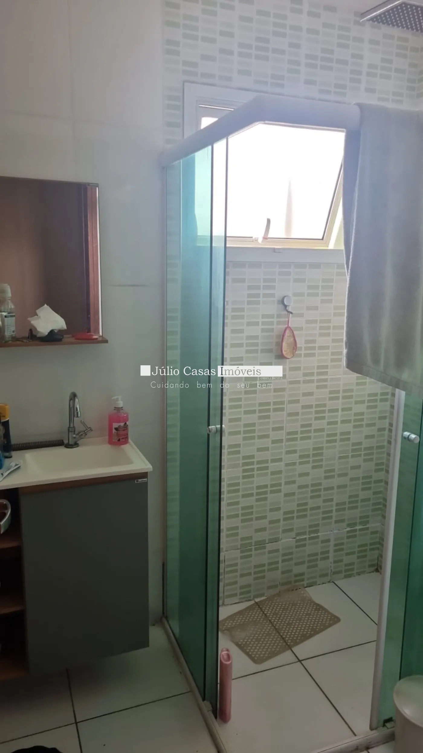 São dois dormitórios, sendo um deles com sacada voltada para a frente da casa e armário modulado, proporcionando praticidade e uma vista agradável. O banheiro moderno, com revestimento até o teto e box em vidro verde, reforça o cuidado nos detalhes e garante um ambiente sofisticado.