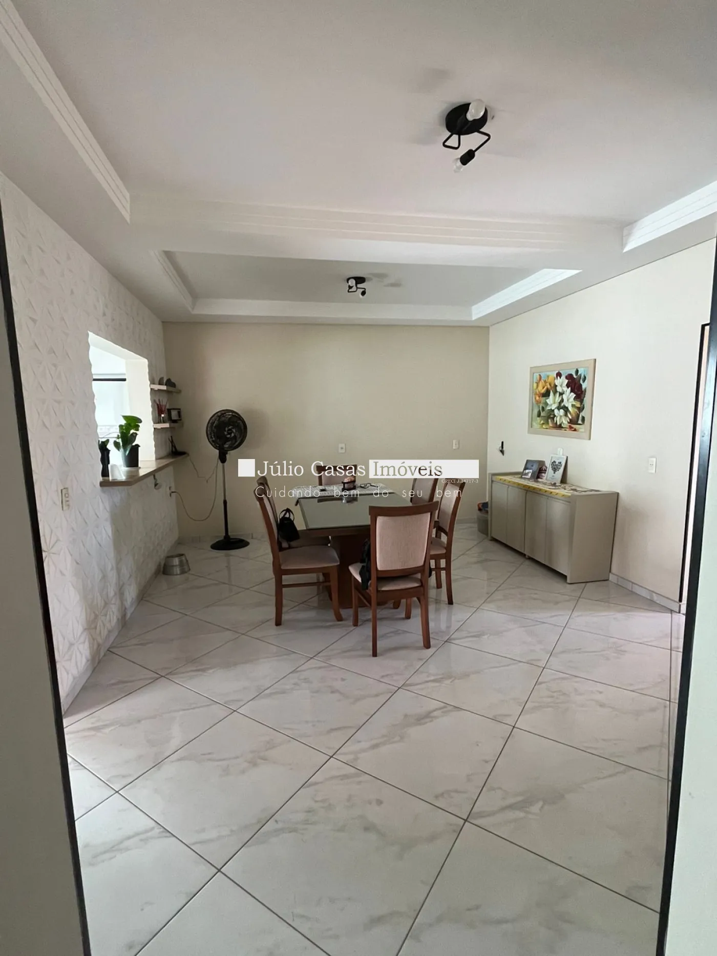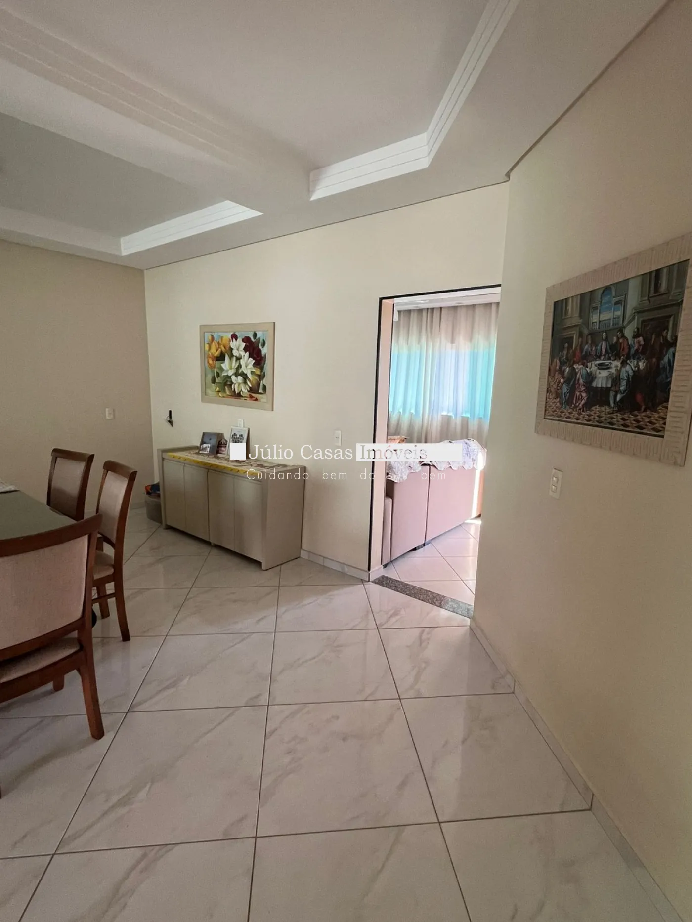 - Ampla sala de jantar com detalhes em gesso no teto, perfeita para receber amigos e familiares.