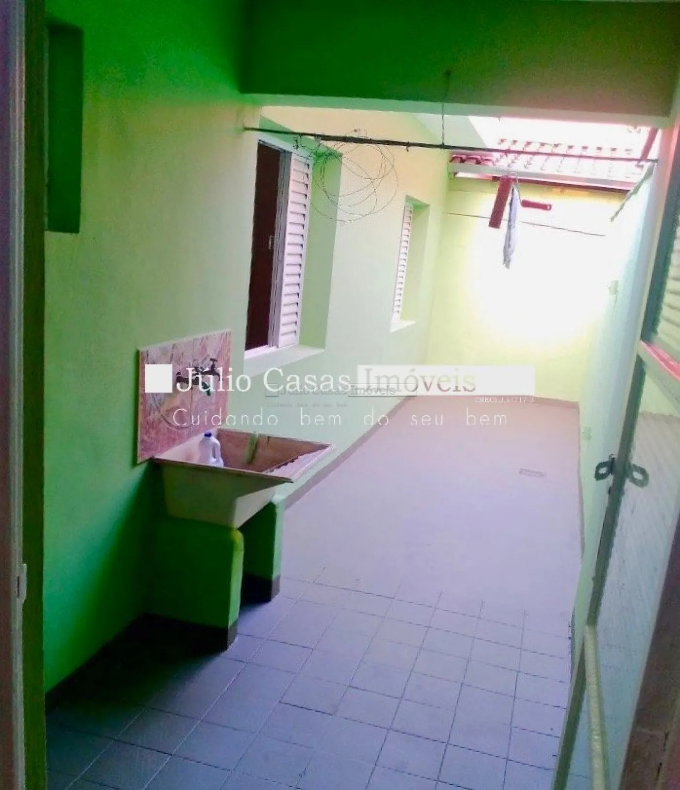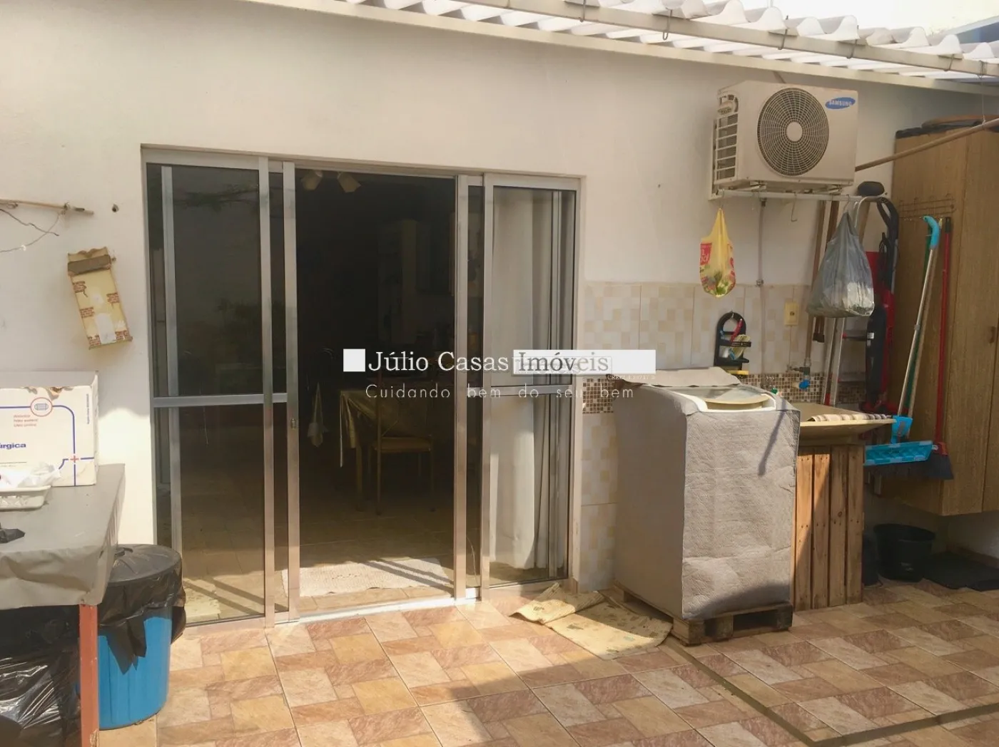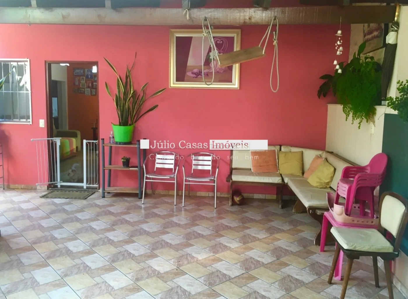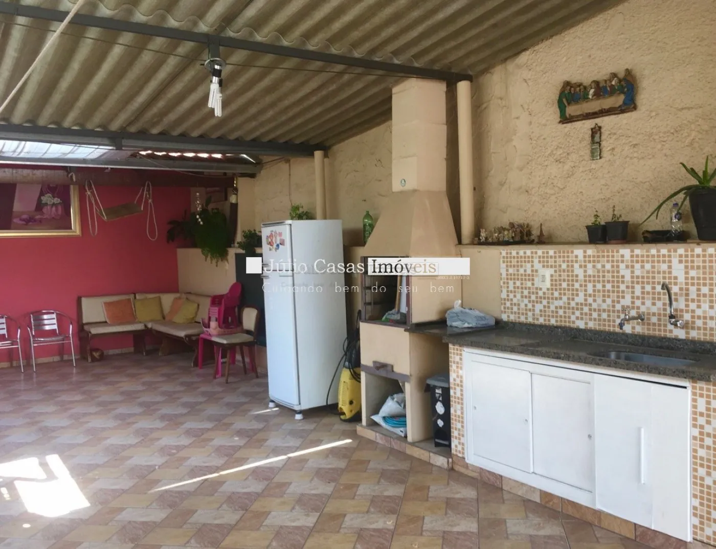 Possui garagem coberta para três carros e área com churrasqueira, pia e lavabo.