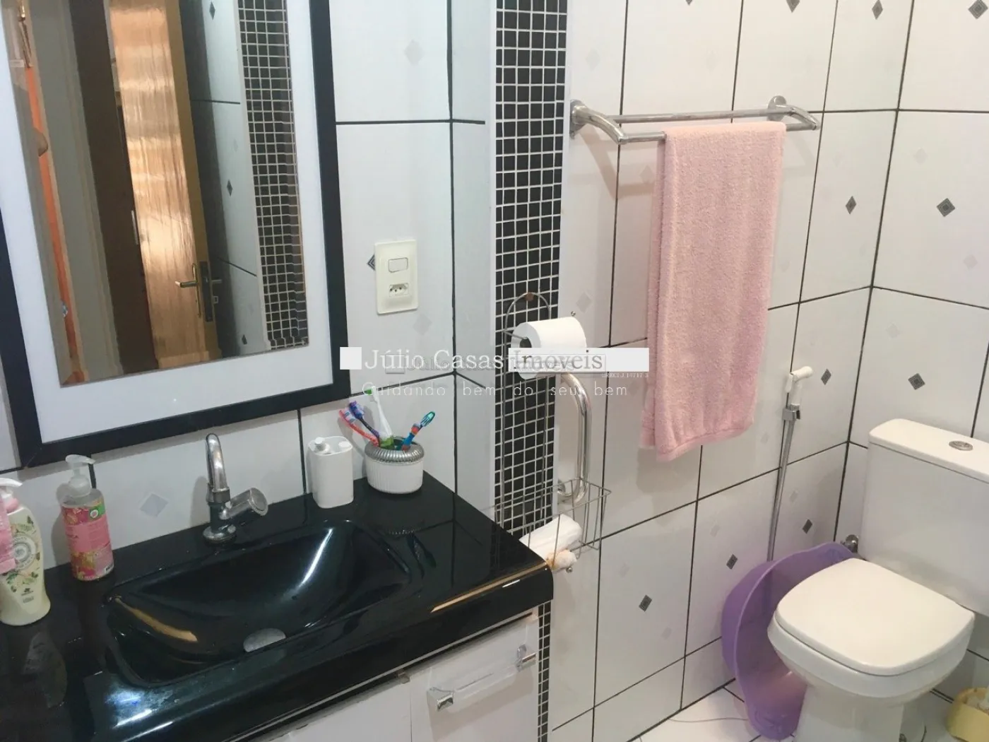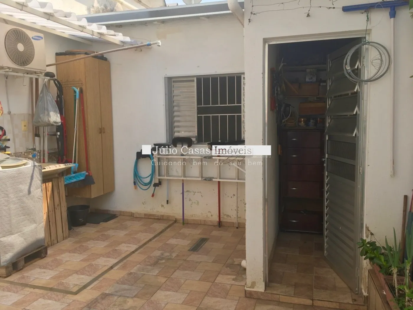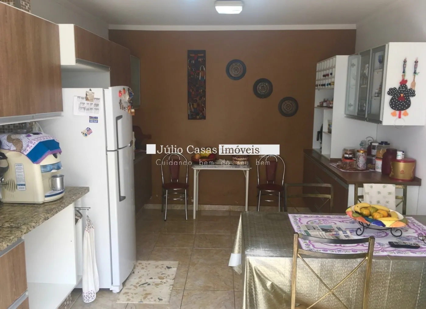 Possui garagem coberta para três carros e área com churrasqueira, pia e lavabo.