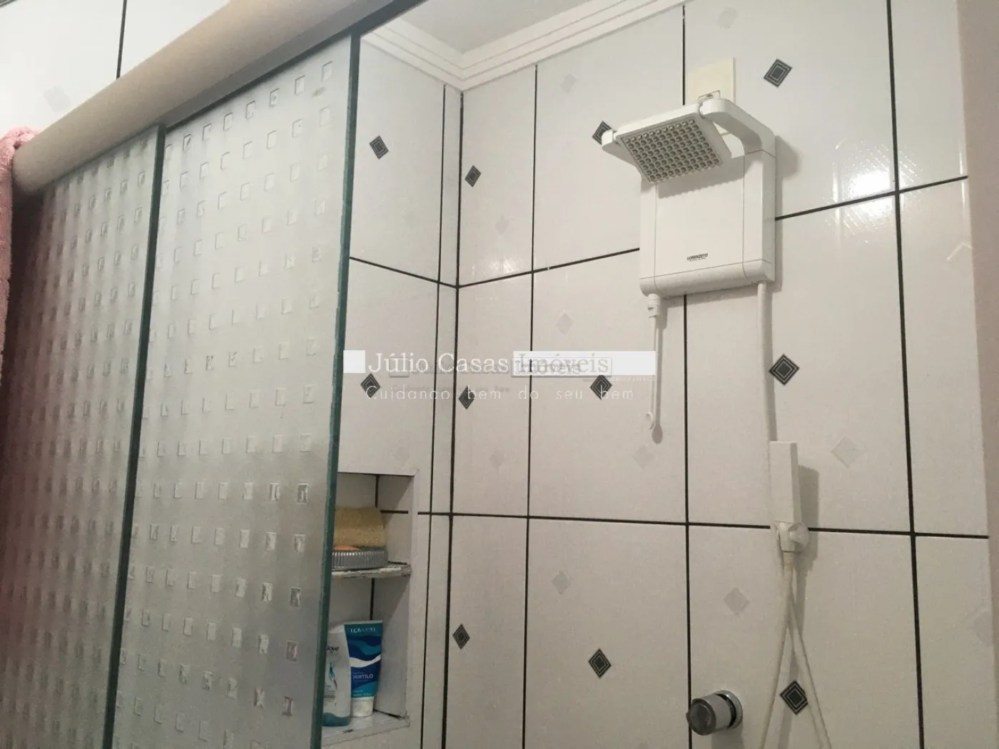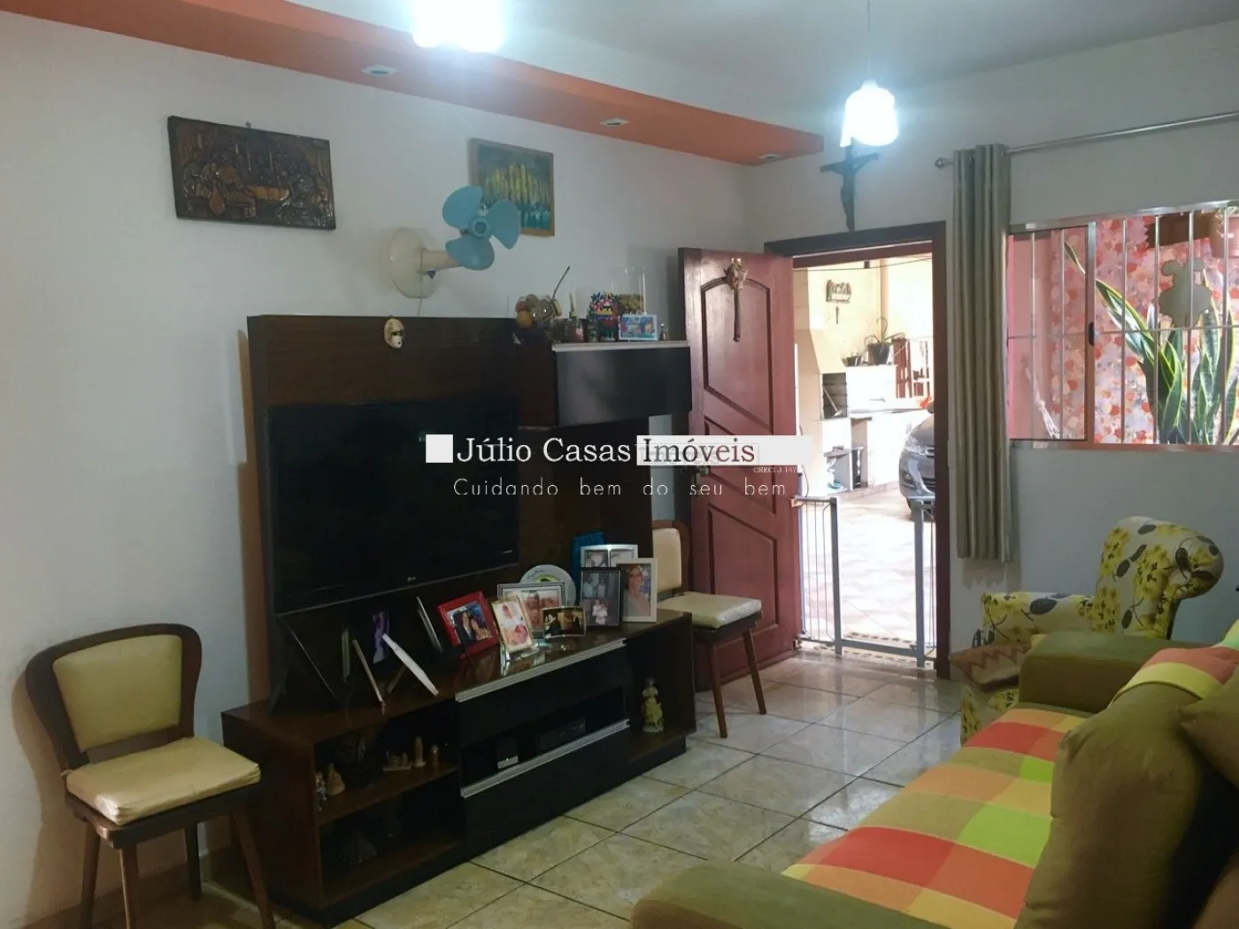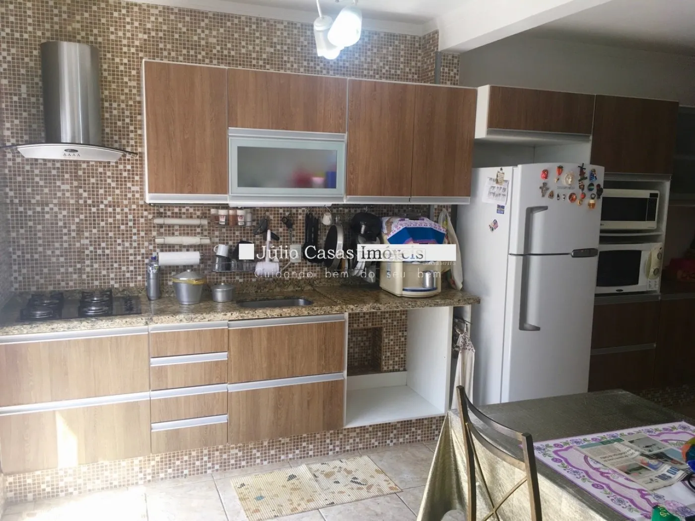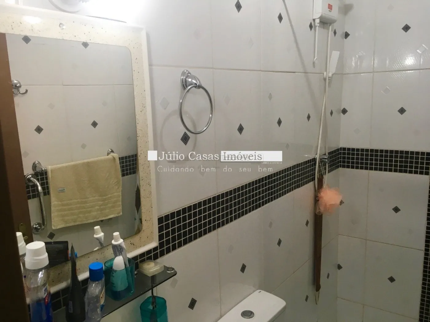Possui garagem coberta para três carros e área com churrasqueira, pia e lavabo.