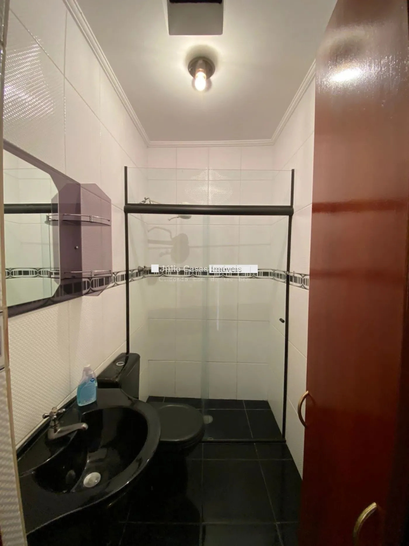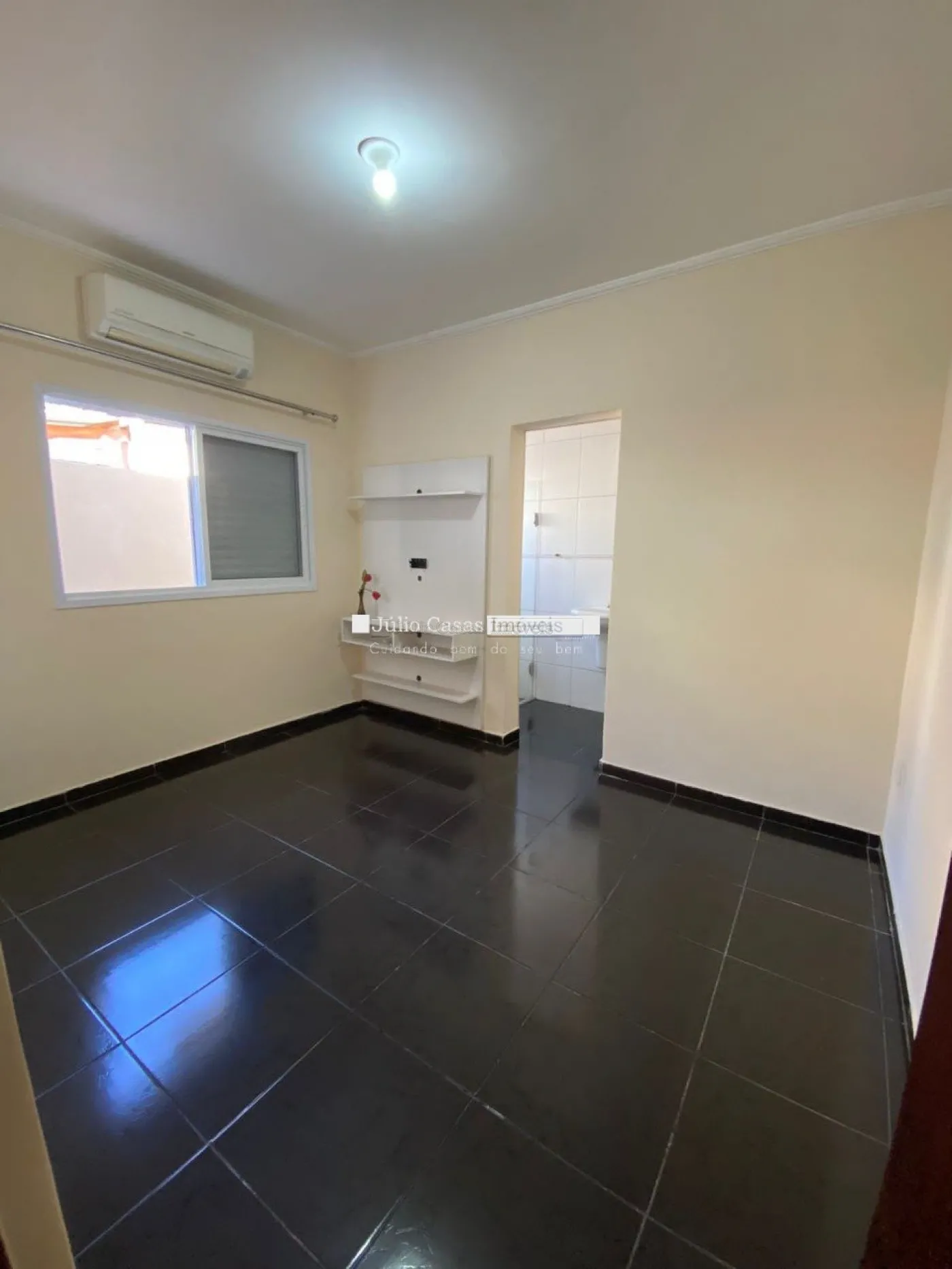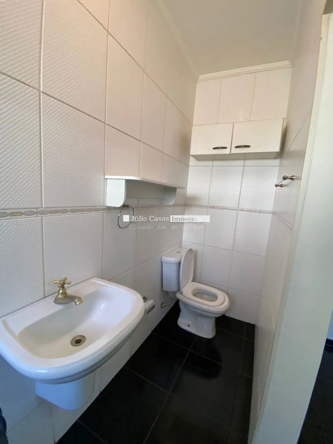 A suíte máster é equipada com porta camarão, ar condicionado e piso Gyotoku 20x20. O banheiro da suíte possui cubas e vasos Deca com torneiras de bronze, além de box fechado em vidro Blindex e revestimento em azulejo até o teto, utilizando materiais de alta qualidade. O banheiro social também apresenta piso 20x20, com cubas e vasos Gyotoku, mantendo a elegância e a uniformidade dos acabamentos.