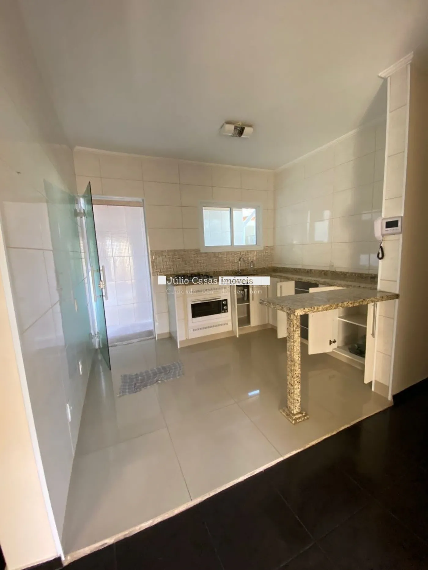 A cozinha é modulada e dispõe de piso em porcelanato Portobello 60x60, uma pia com bancada em granito amarelo Icaraí, cooktop e armários planejados, criando um ambiente funcional e sofisticado. A área de serviço e um dos quartos possuem piso em ardósia, proporcionando durabilidade e facilidade de manutenção.