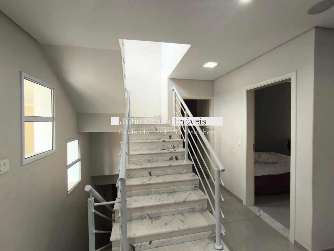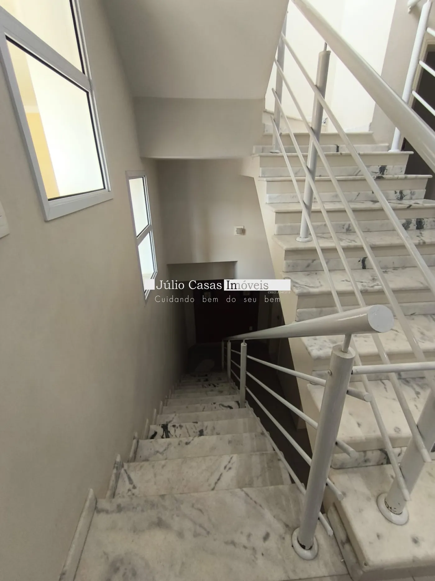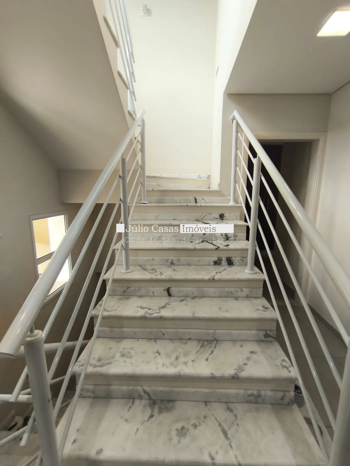 Escadas em mármore, com guarda corpo.