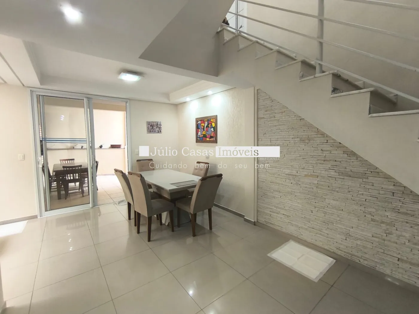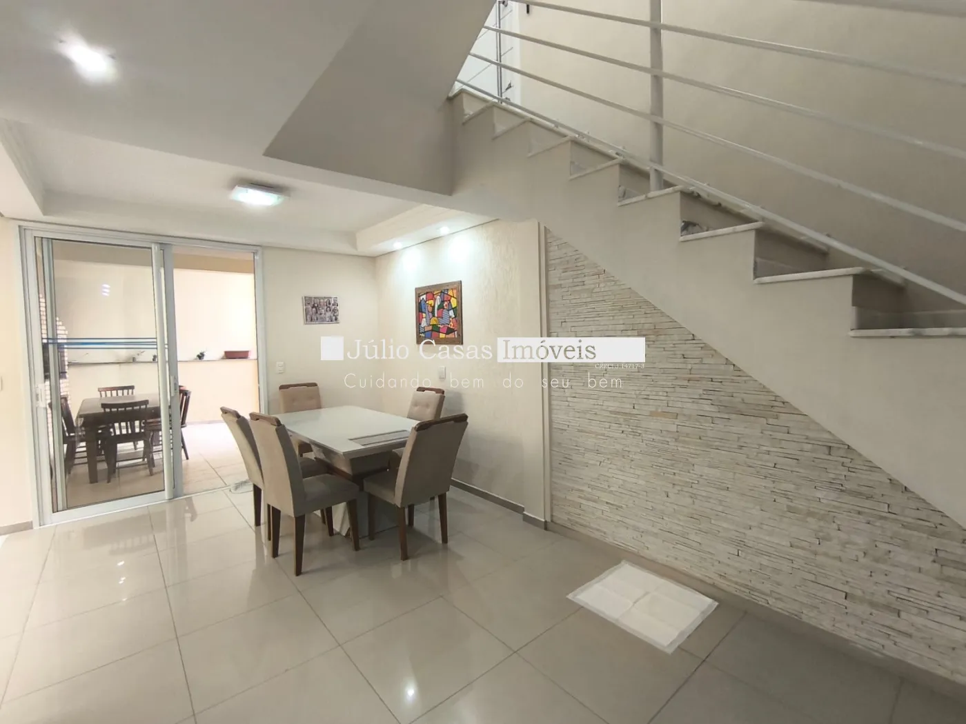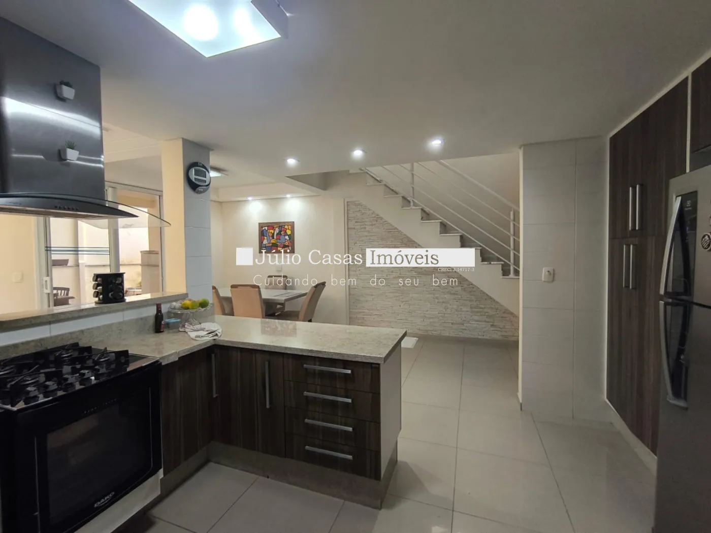 Piso inferior possui uma cozinha planejada, sala de jantar com porta de correr em vidro temperado que dá acesso a área gourmet, com churrasqueira.