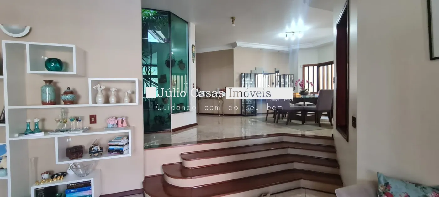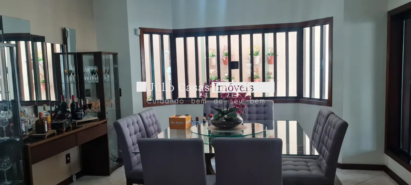 ? Ambientes Amplos e Elegantes: Sala ampla em três ambientes, com piso elevado na sala de jantar, revestida em porcelanato de alta qualidade. Sanca em gesso, luminárias embutidas e uma charmosa janela de madeira que dão um toque de sofisticação.