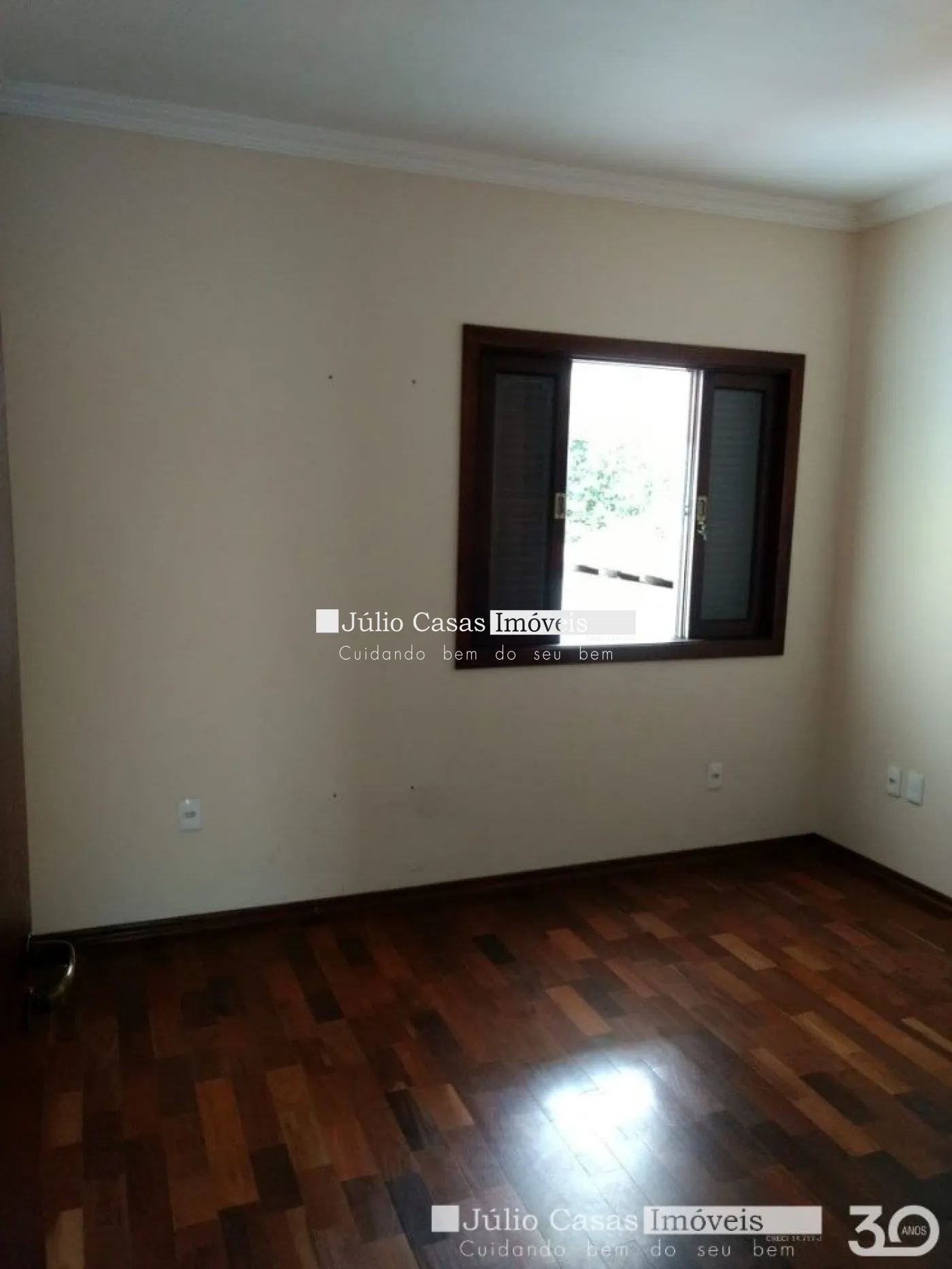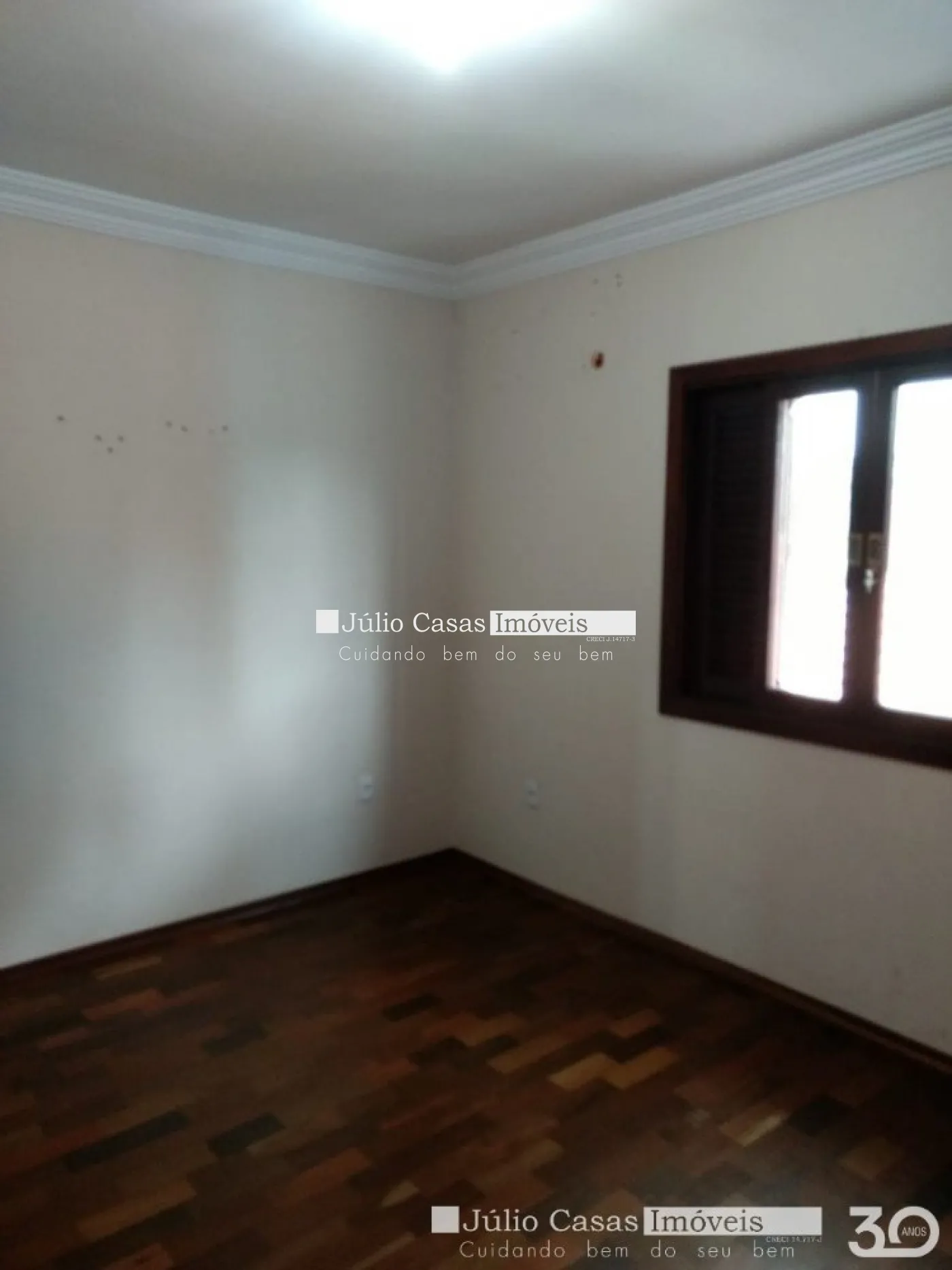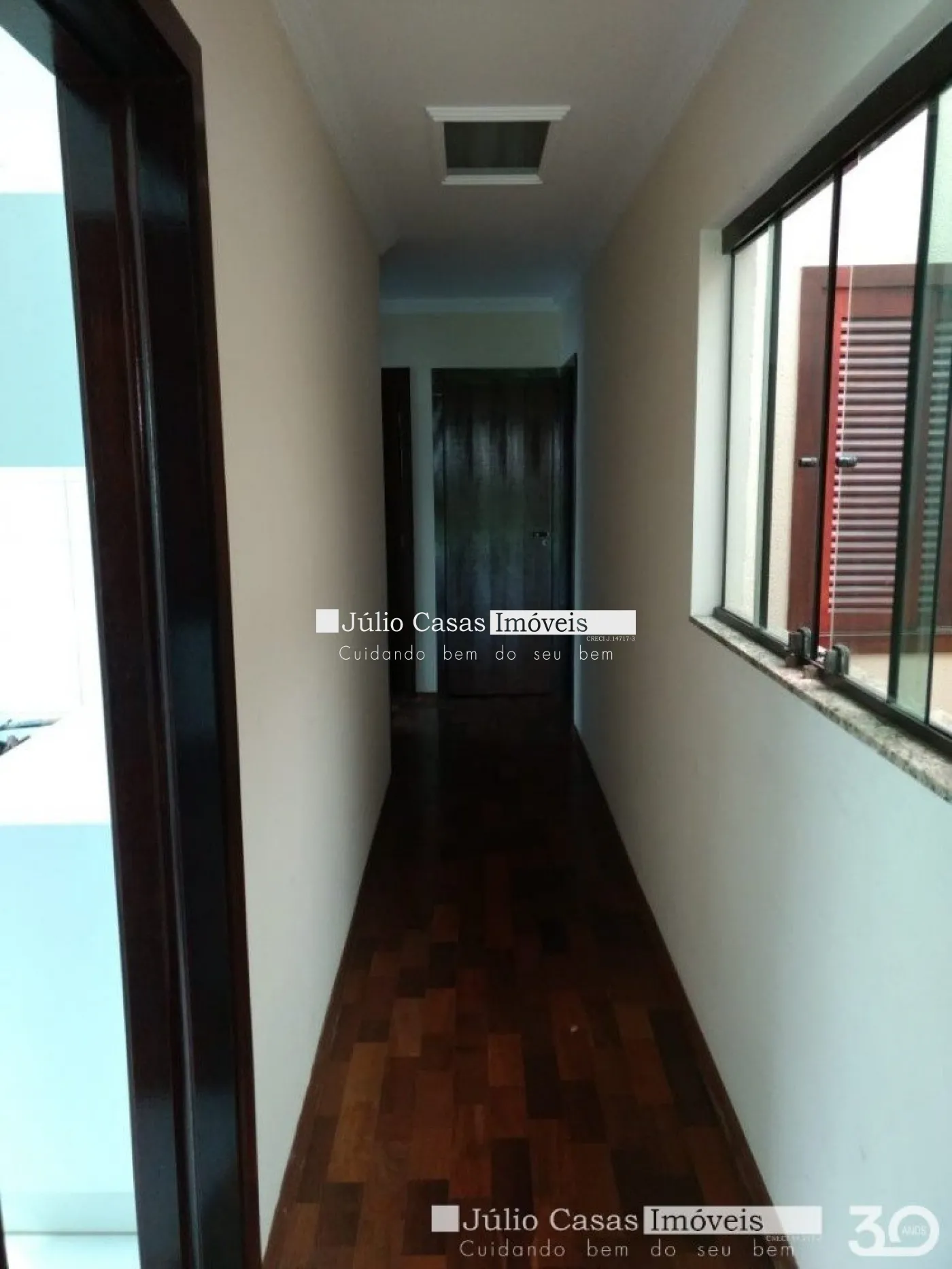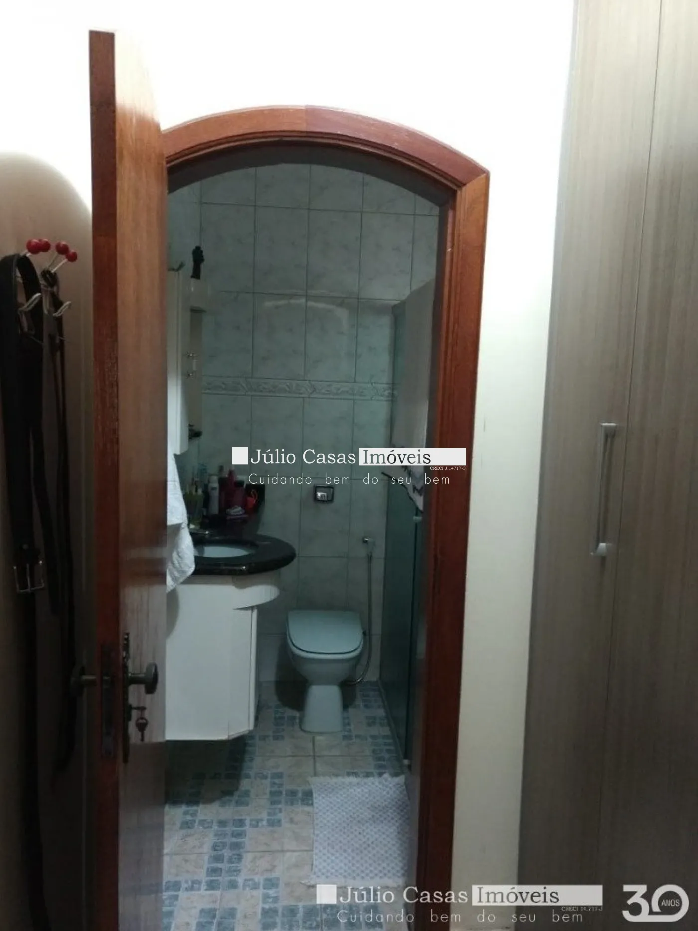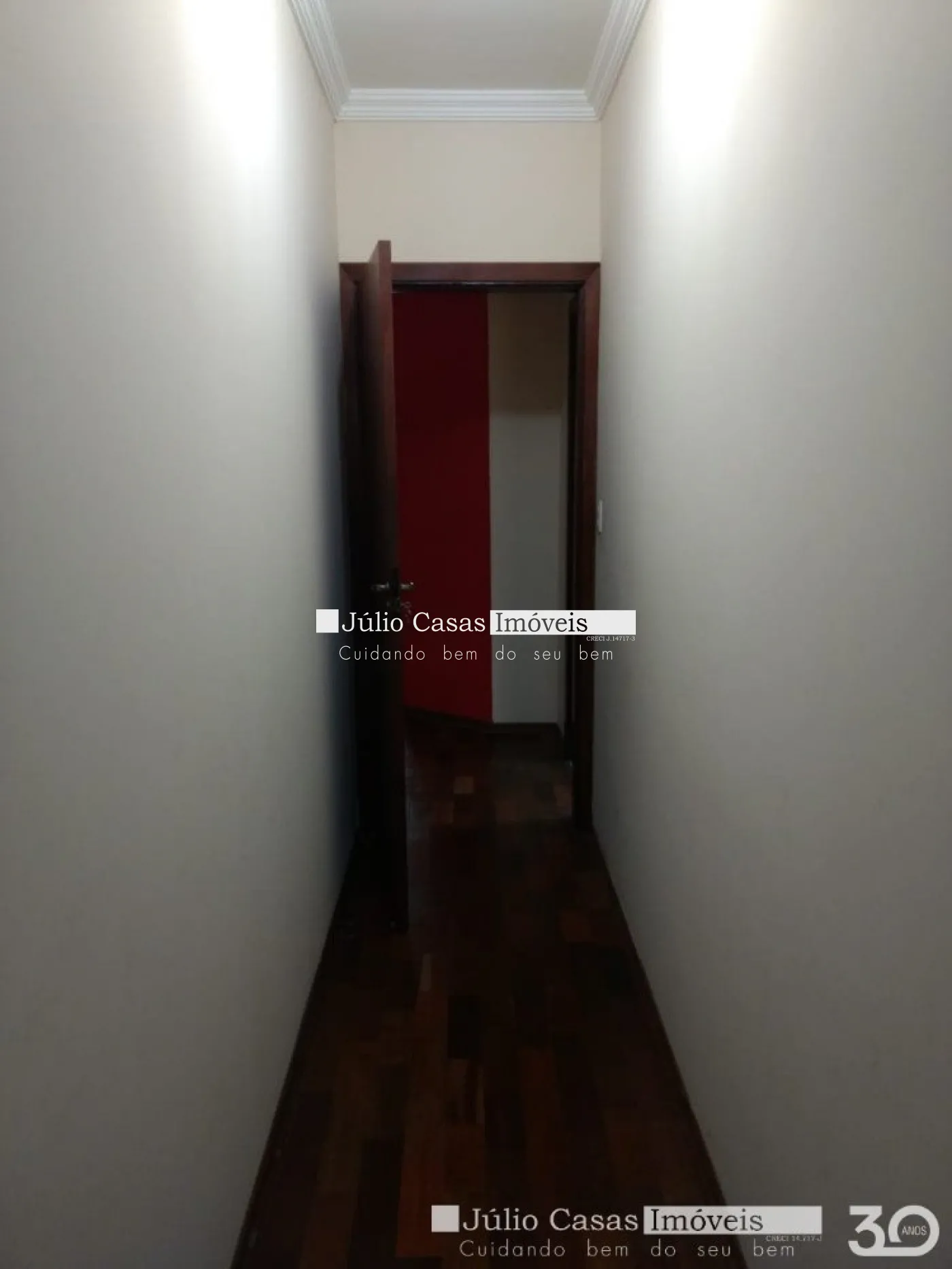 Sobrado com andar térreo tendo sala espaçosa, lavabo, 3 dormitórios 1 sendo suíte com closet e modulados, todos em piso em madeira, wc social com box e cozinha em piso frio.