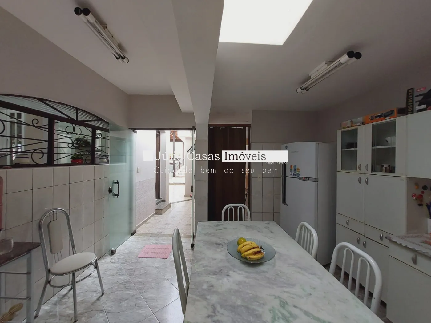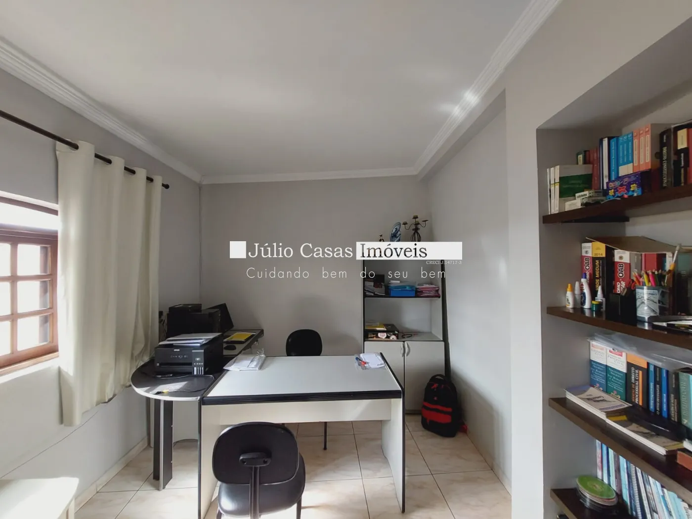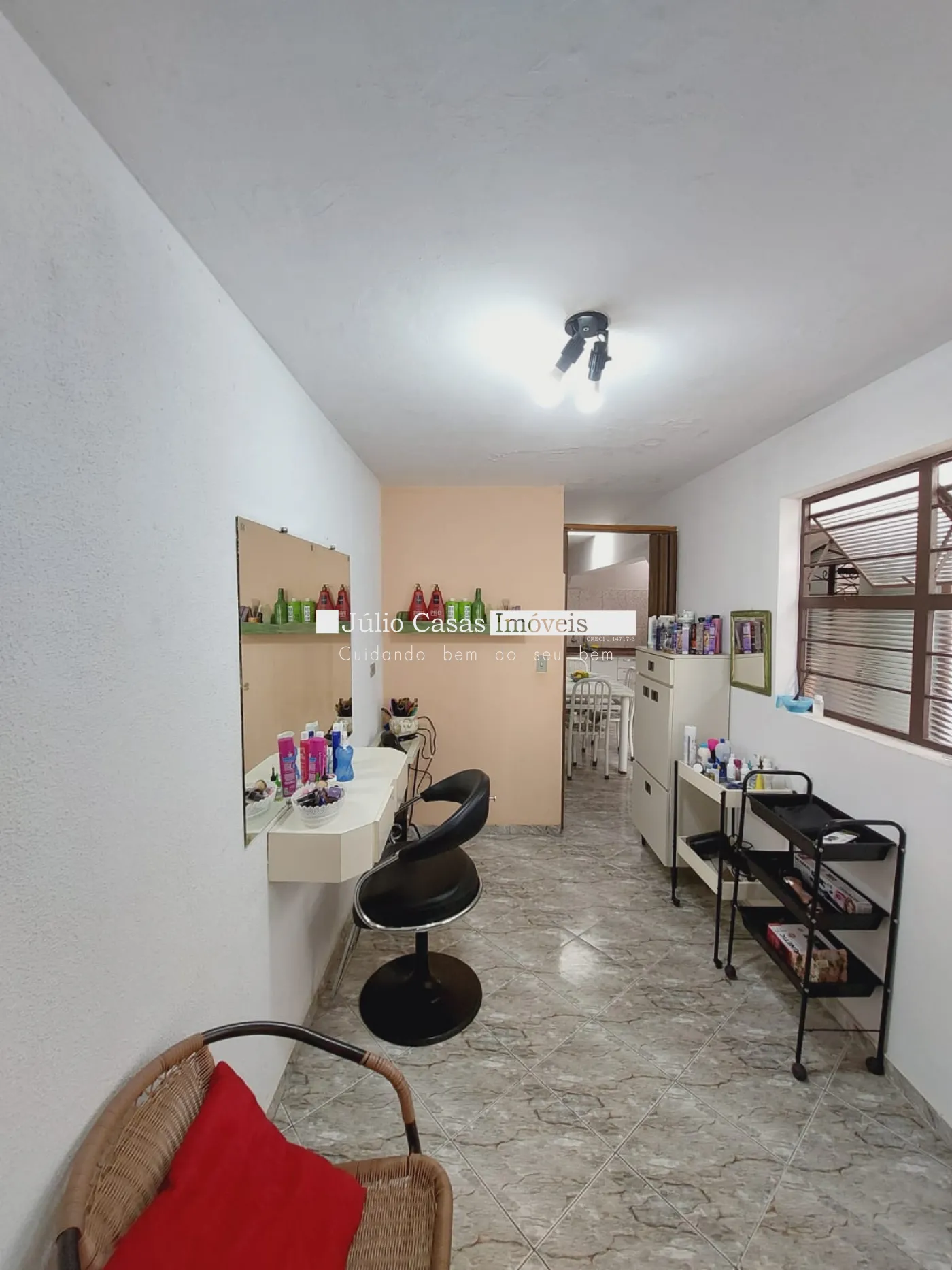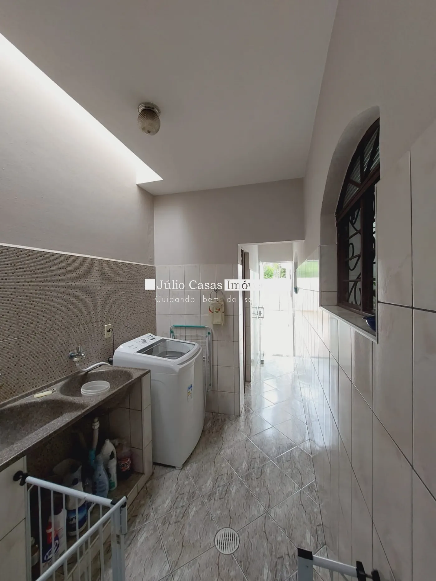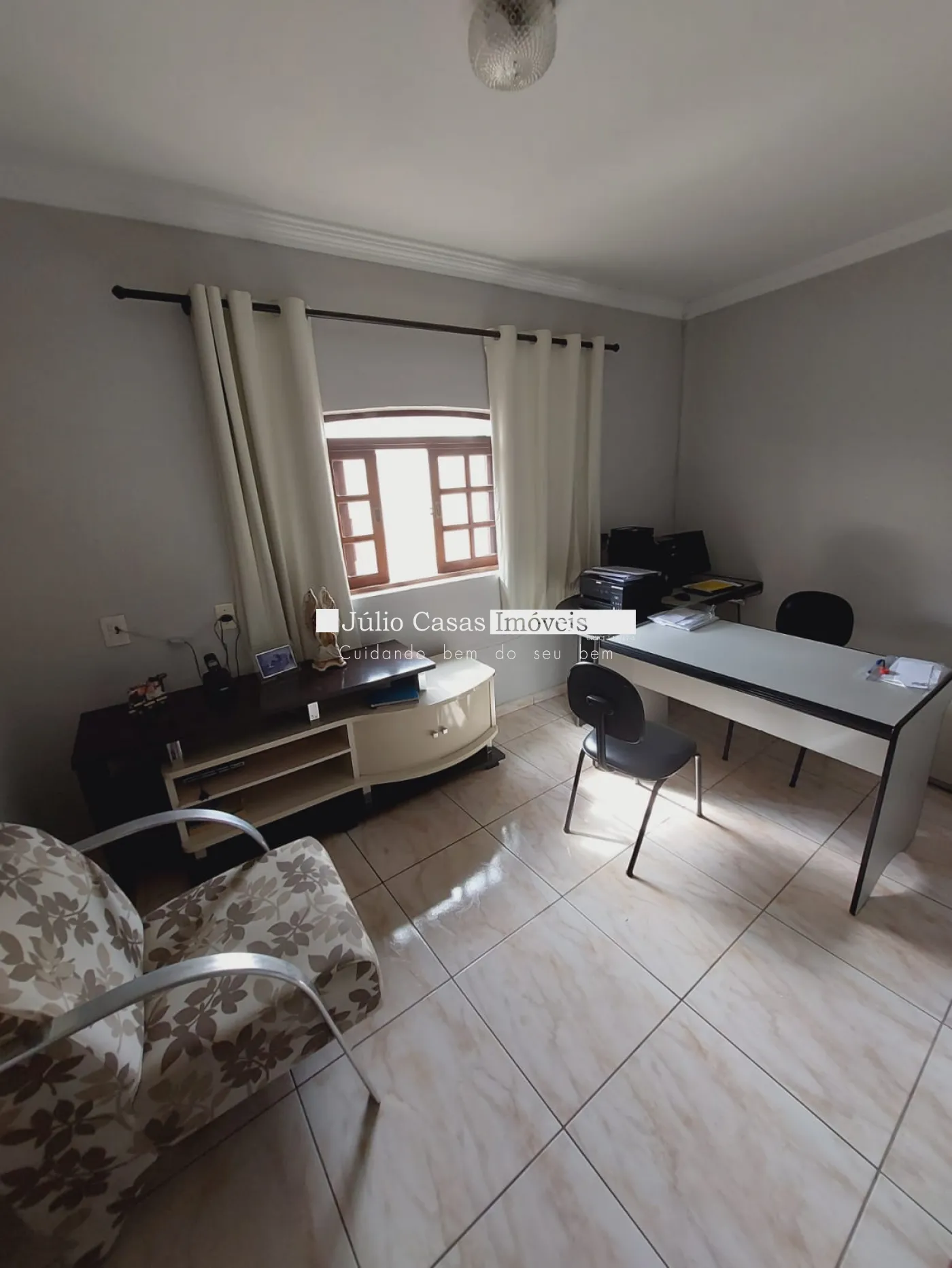 Casa com sala de estar, sala de jantar, sala de tv, 3 dormitórios sendo 1 suíte, 1 wc social, escritório, 2 cozinhas, área de serviço, quintal grande com jardim, sala usada como salão de cabeleireiro, garagem para 2 veículos cobertos, e 5 veículos descobertos.