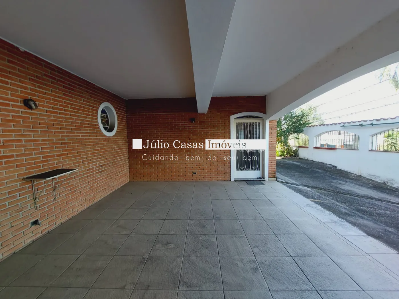 no andar ao nível da rua, encontramos mais um quarto amplo com seu respectivo banheiro, uma garagem para 3 carros cobertos e 3 descobertos, um pequeno jardim frontal.