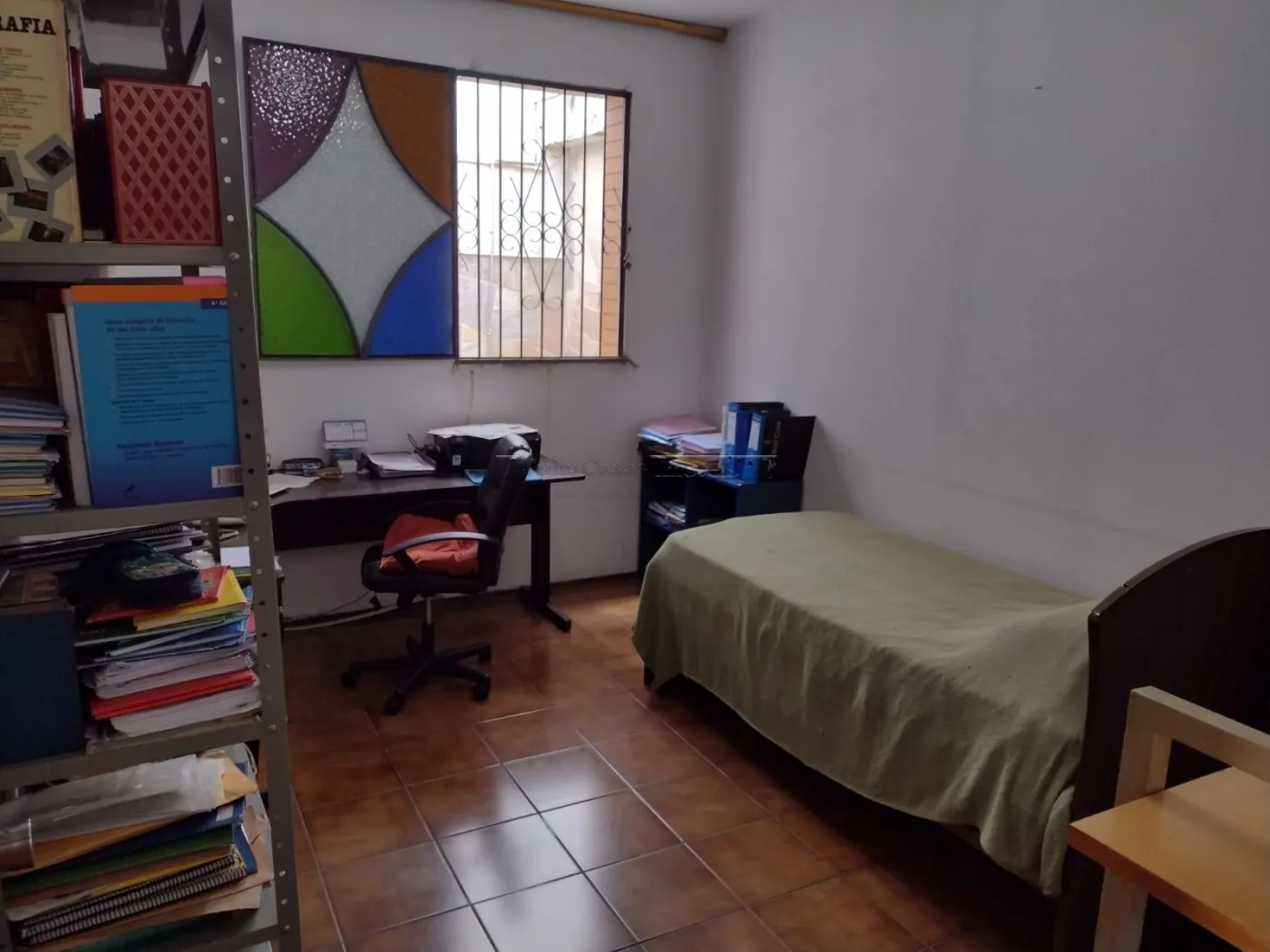 Amplo hall de entrada que conecta os quatro dormitórios, todos com piso revestido em tacos de madeira, janelas com vitrais e ventilador de teto, proporcionando conforto e iluminação natural.