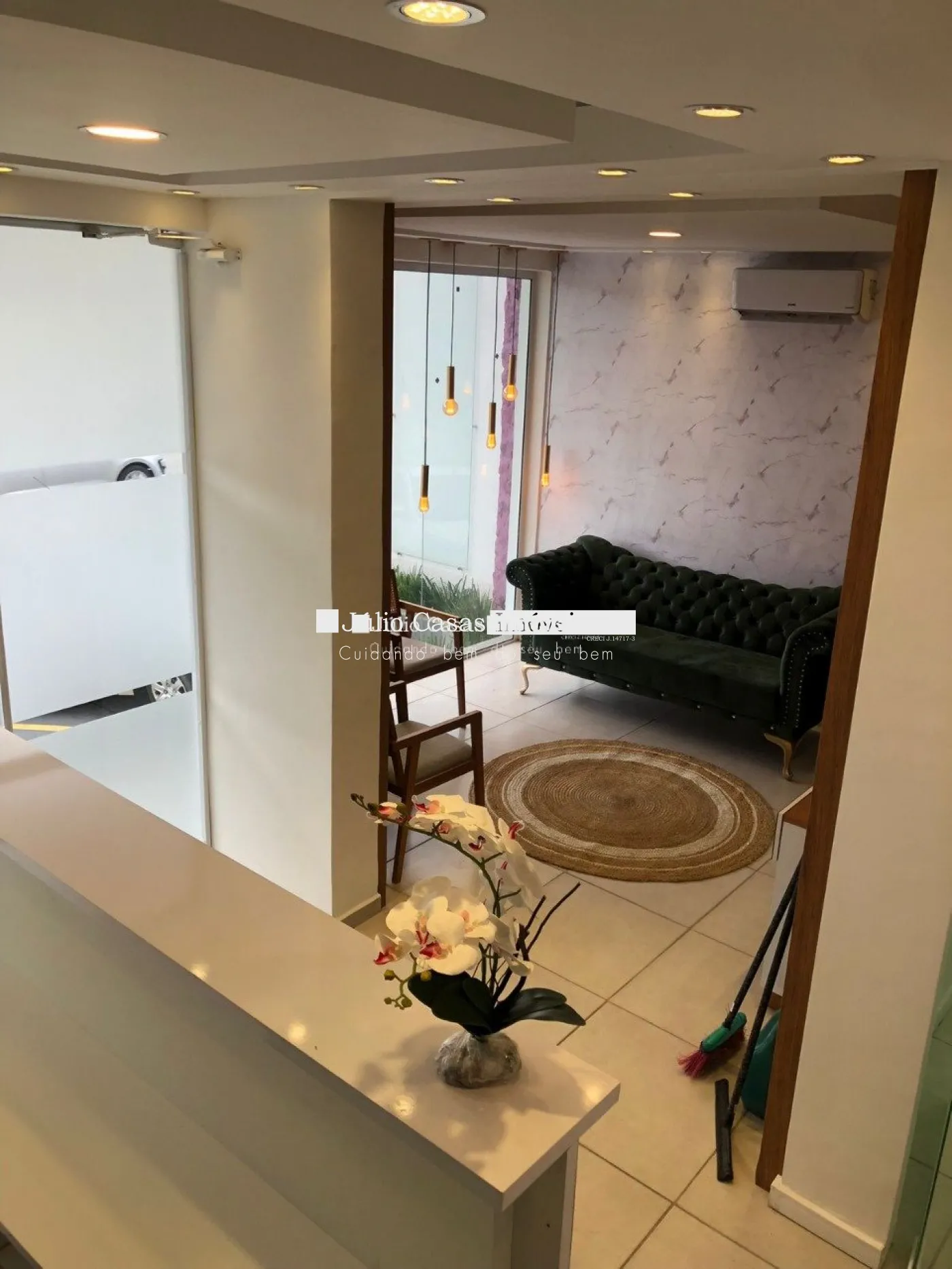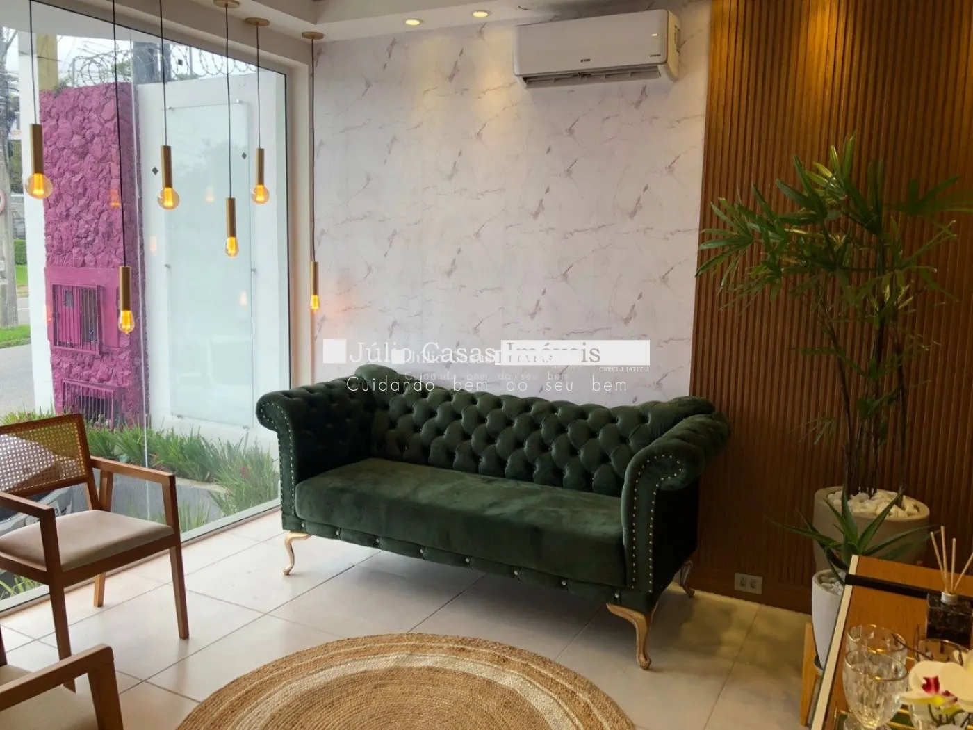 1 salão comercial com 210 m2 de piso, revestido em porcelanato, paredes acabadas com massa corrida, lâmpadas fluorescentes,2 banheiros com piso em porcelanato, bancadas em granito Granito Amêndoa Light, toalheiros e saboneteiras instalados, revestimento de parede tipo travertino até a altura do teto, louças no tom de bege, portas em madeira de embutia envernizadas, espelhos instalados, teto em gesso com molduras, um pequeno quintal com piso em cerâmica com 1 tanque, amplas janelas em alumínio preto com pintura eletrostática , porta frontal em blindex fumê em toda a fachada, um estacionamento coberto para 2 automóveis pequenos, com piso em pedra Miracema rosa anti derrapante, uma porta com roldanas superiores em aço conferindo total segurança ao imóvel.