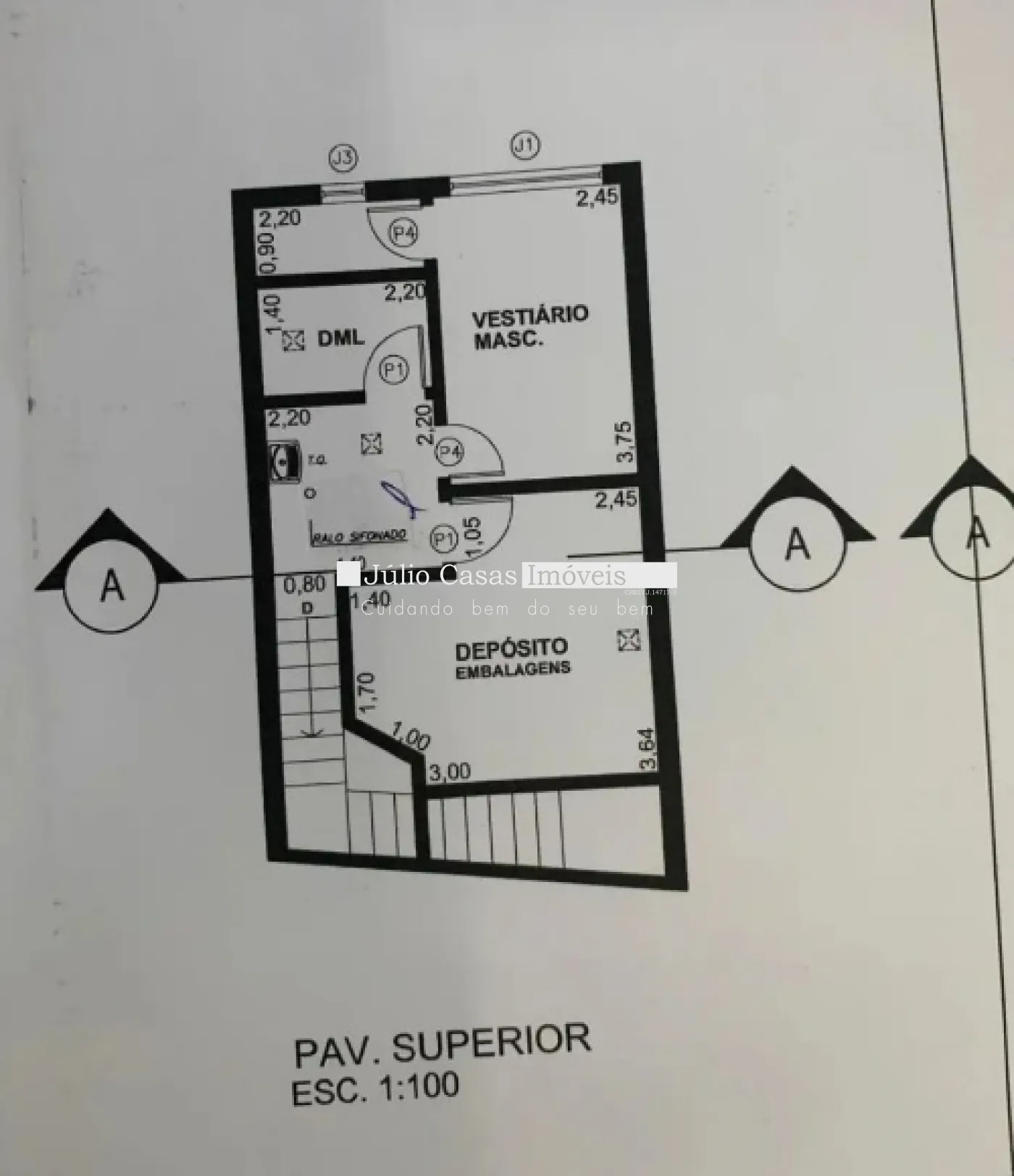 No piso superior: um depósito menor, área de serviço, sala de descanso, 1 banheiro e 1 quarto de despejo.