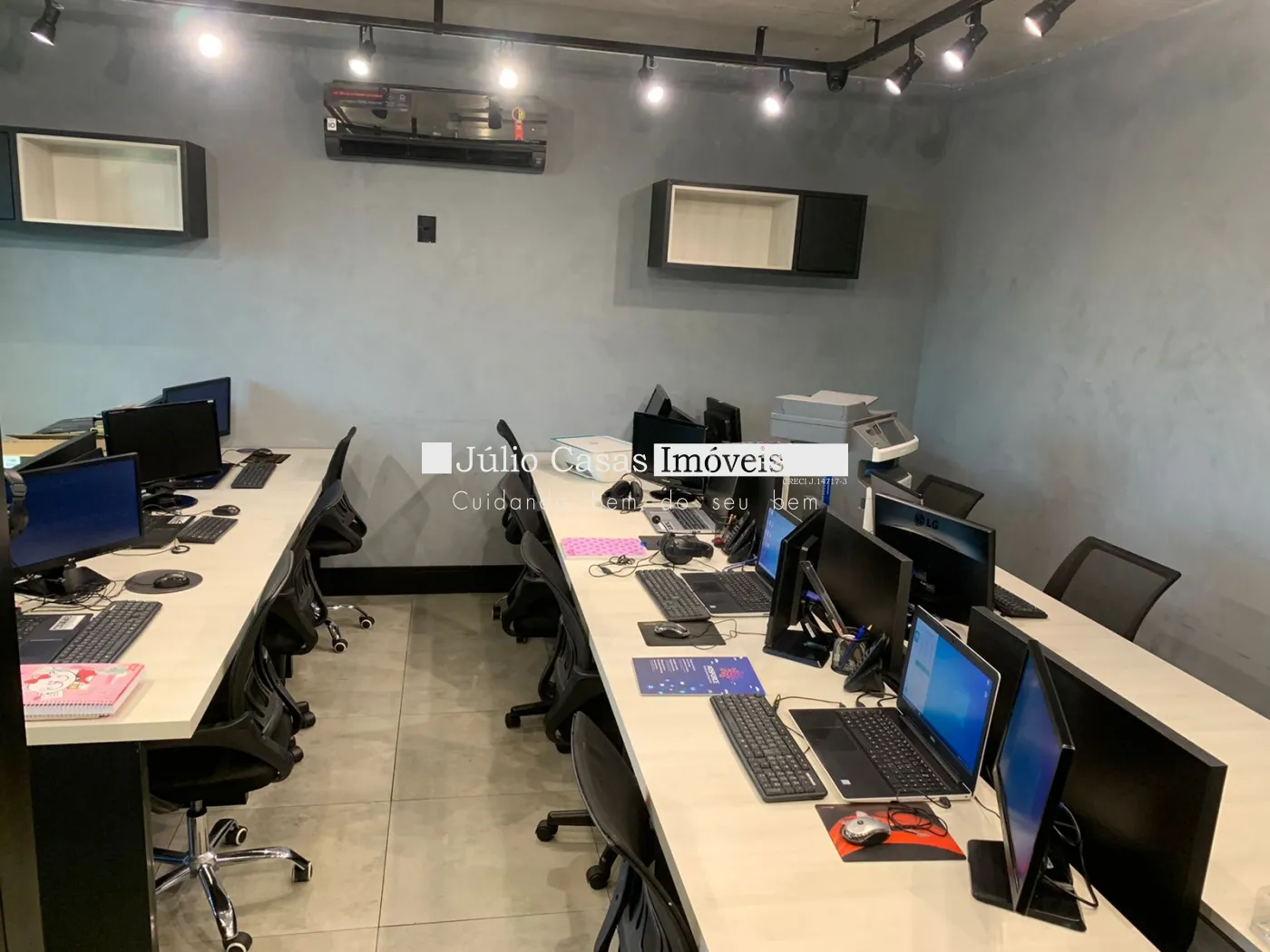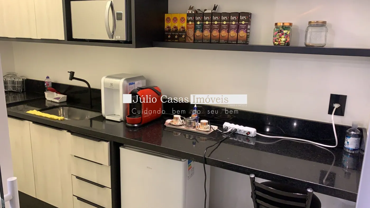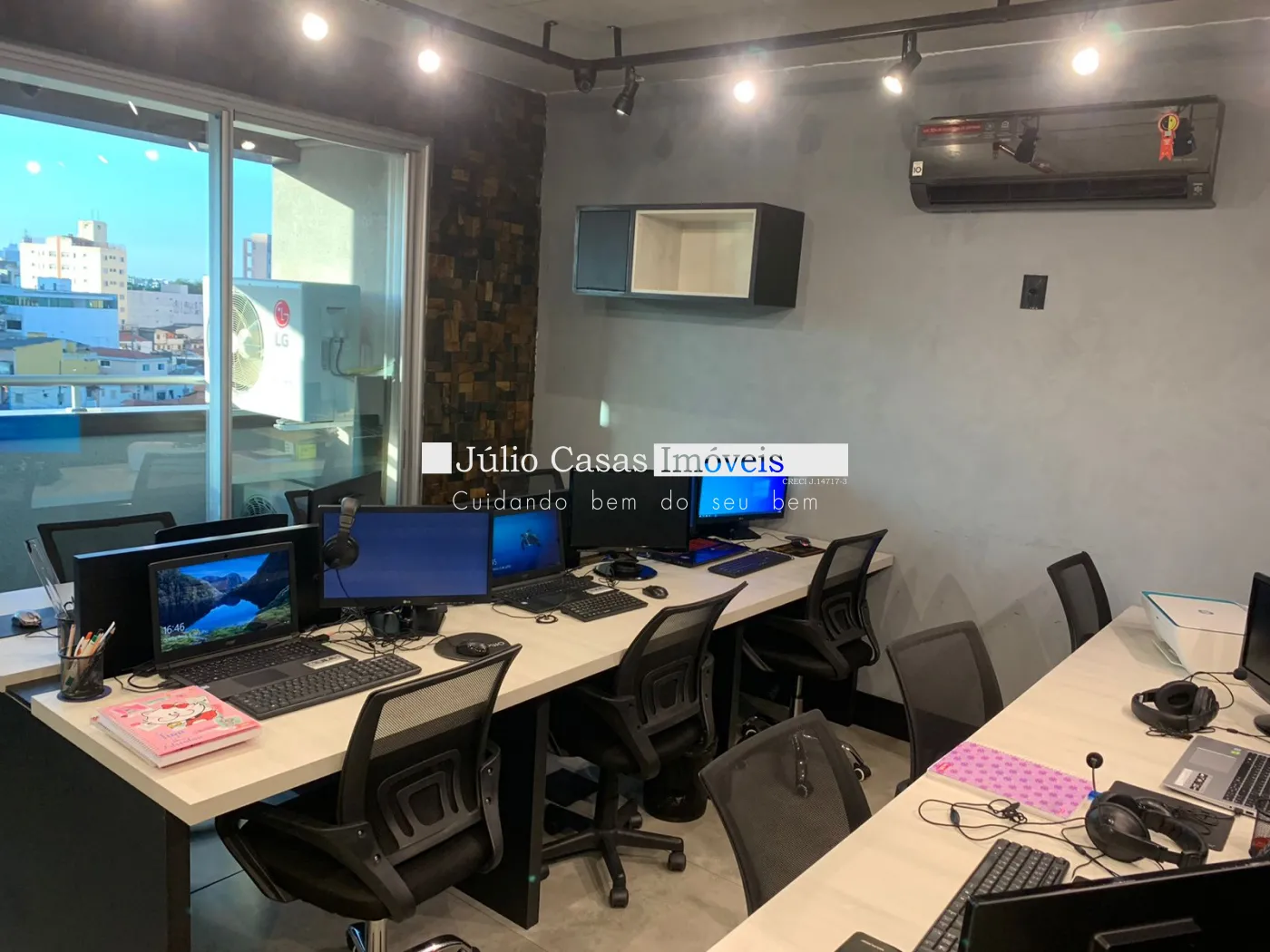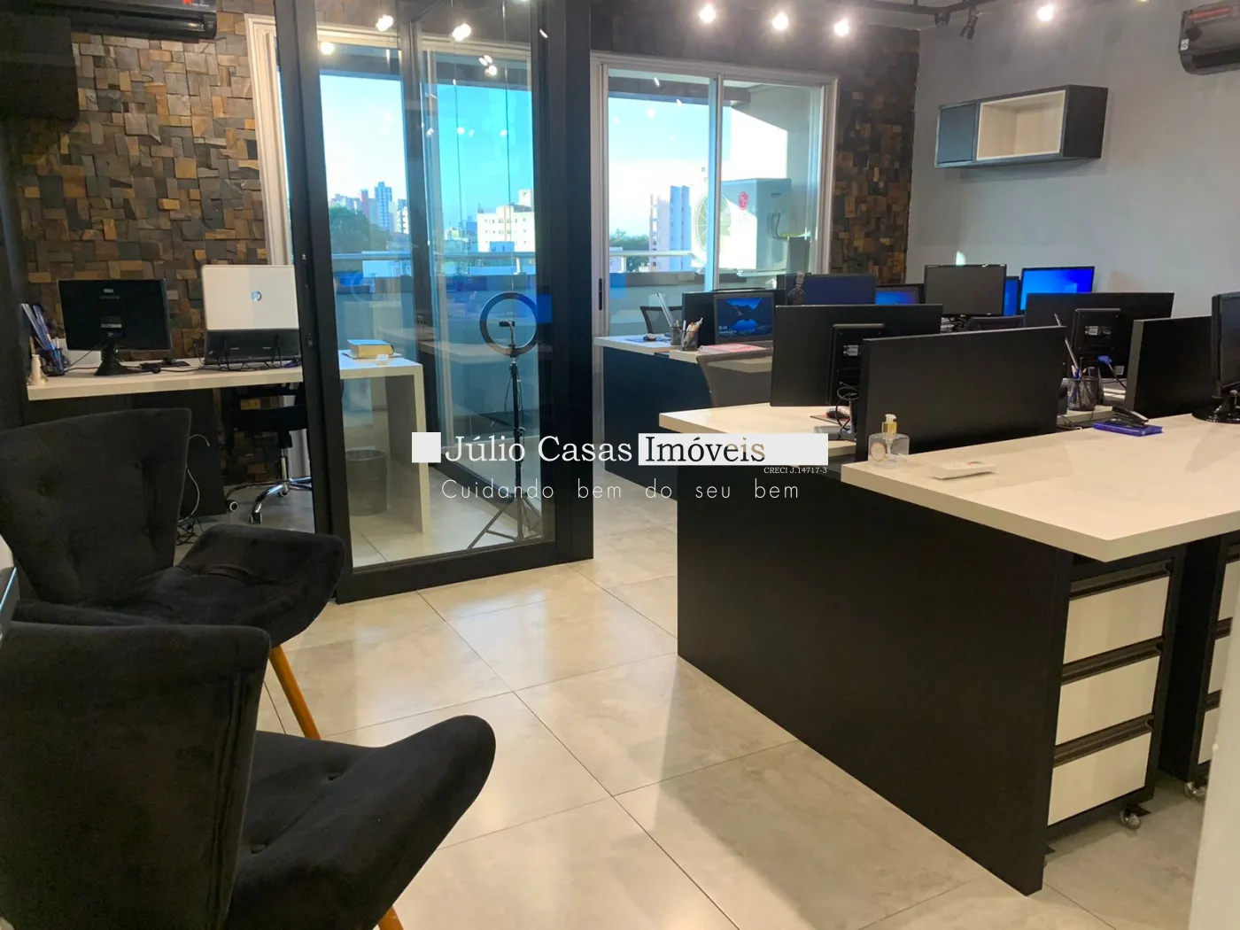 O piso elevado em porcelanato e os móveis planejados garantem um ambiente moderno e profissional. Para seu conforto, a sala é equipada com dois aparelhos de ar-condicionado inverter, proporcionando climatização eficiente.