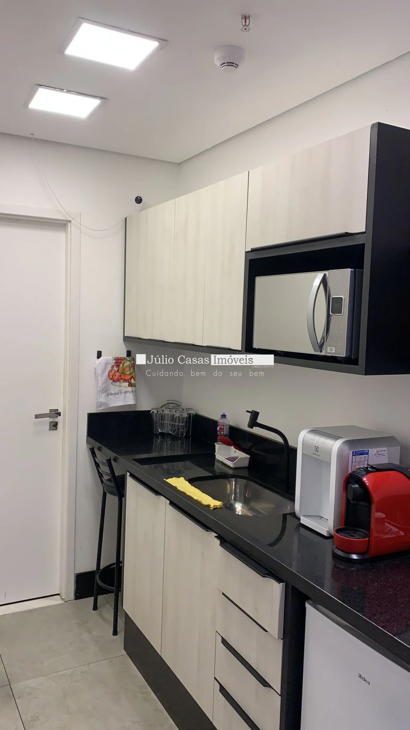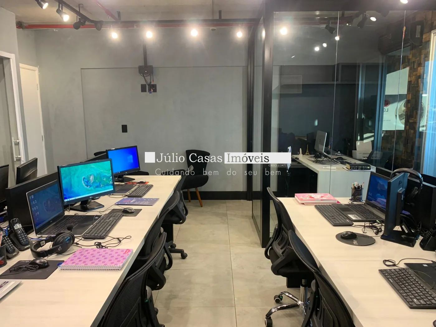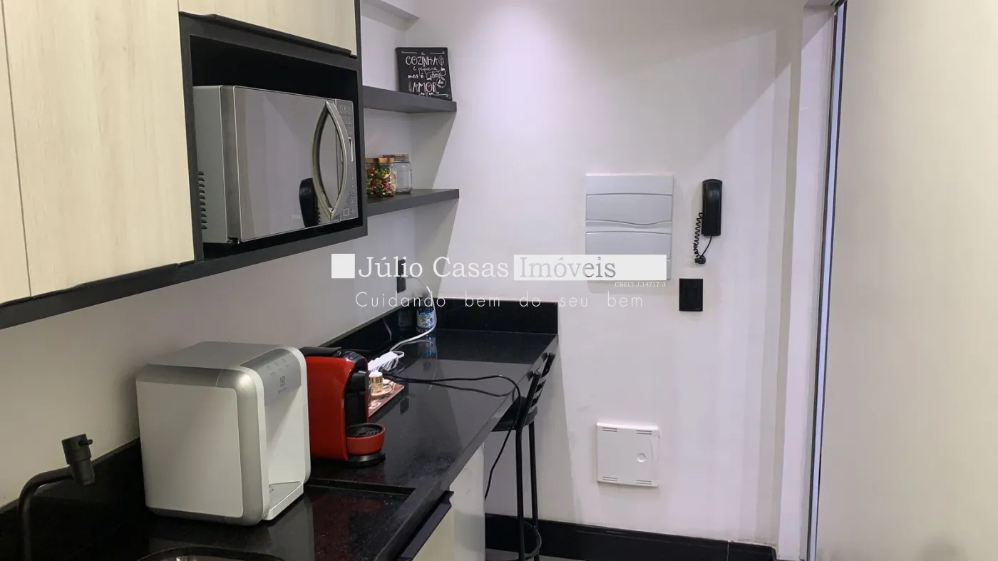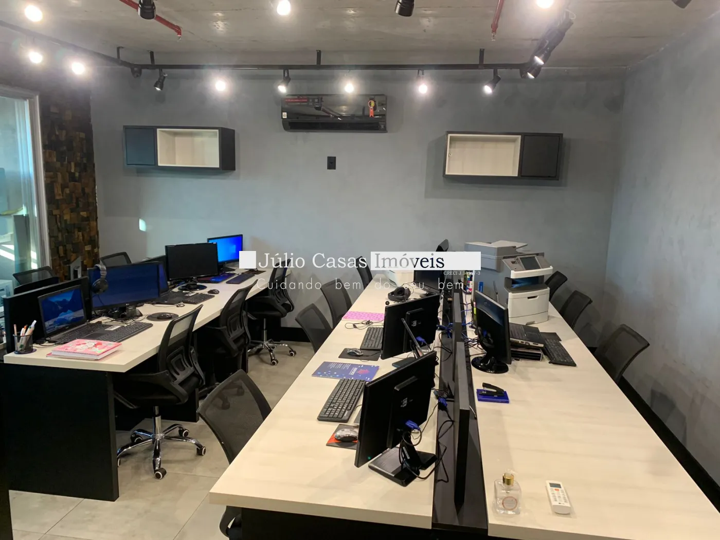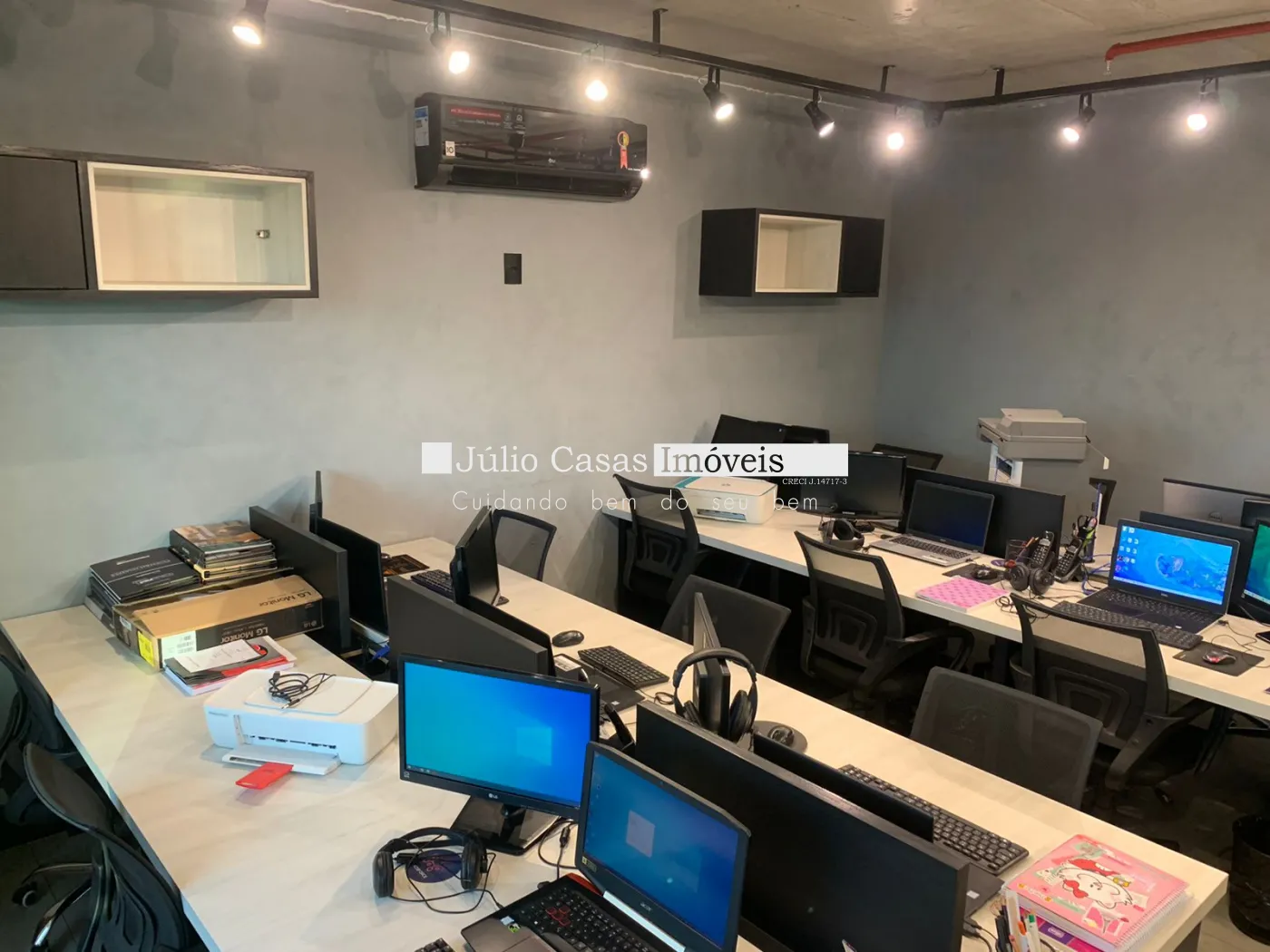 O piso elevado em porcelanato e os móveis planejados garantem um ambiente moderno e profissional. Para seu conforto, a sala é equipada com dois aparelhos de ar-condicionado inverter, proporcionando climatização eficiente.