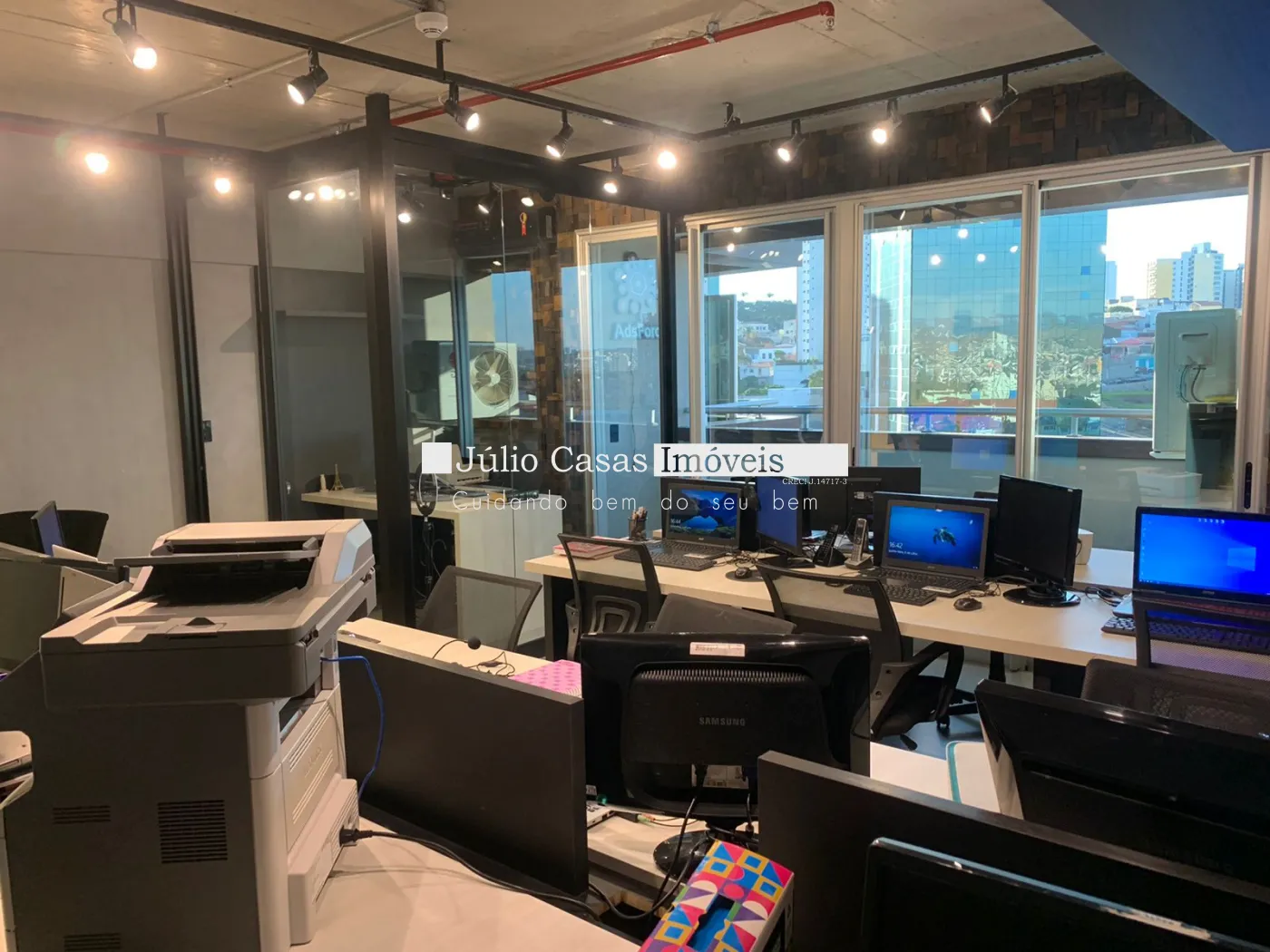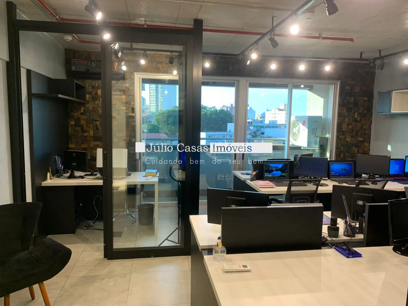Dividida em cinco ambientes cuidadosamente planejados, a sala inclui uma diretoria privativa de 7 m² e um complexo para funcionários de 22 m², que conta com copa, cozinha e banheiro, além de uma agradável sacada para momentos de descontração.