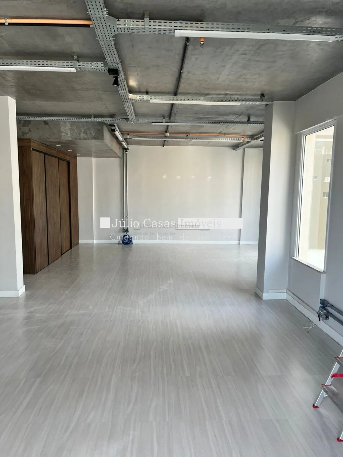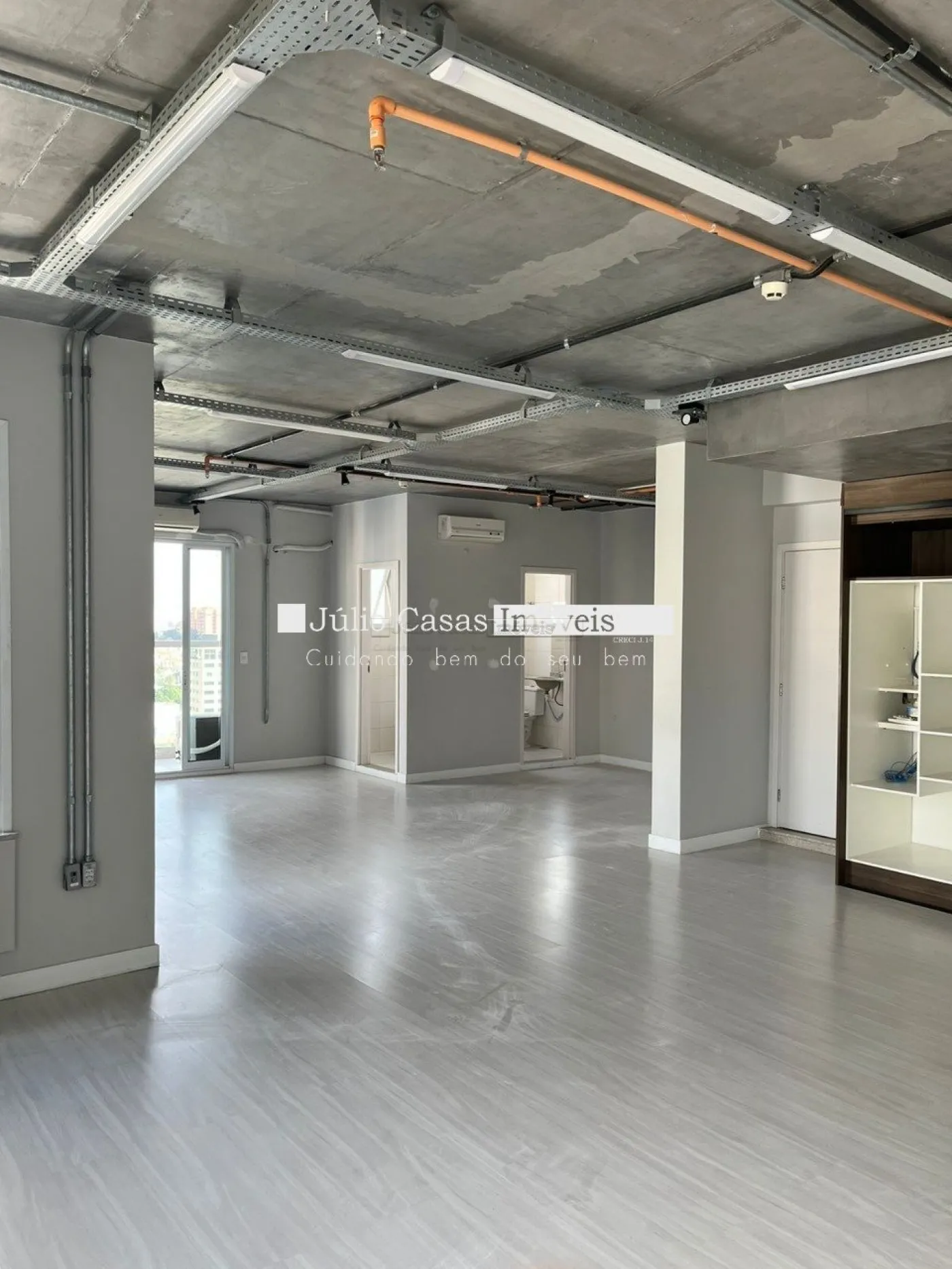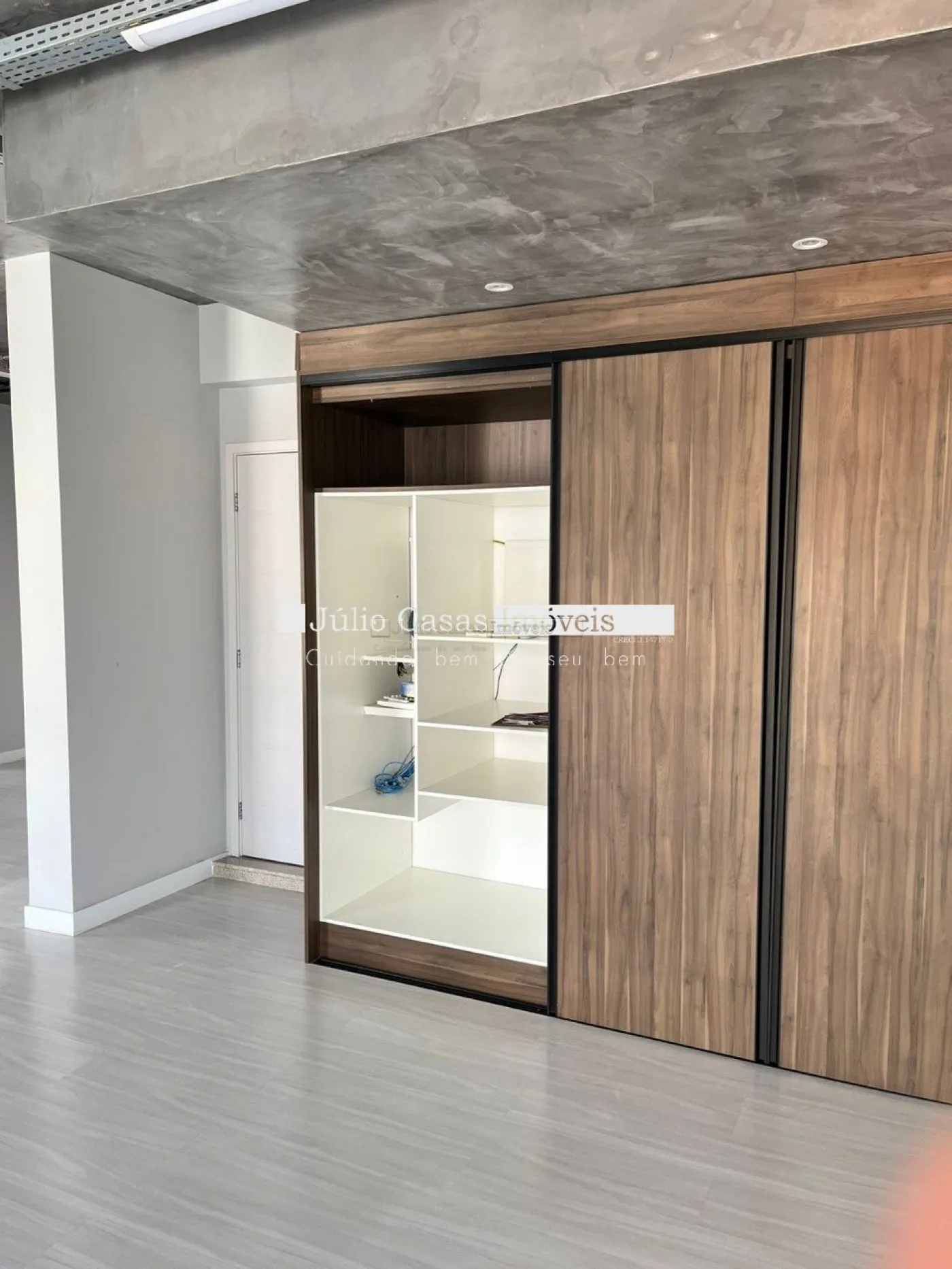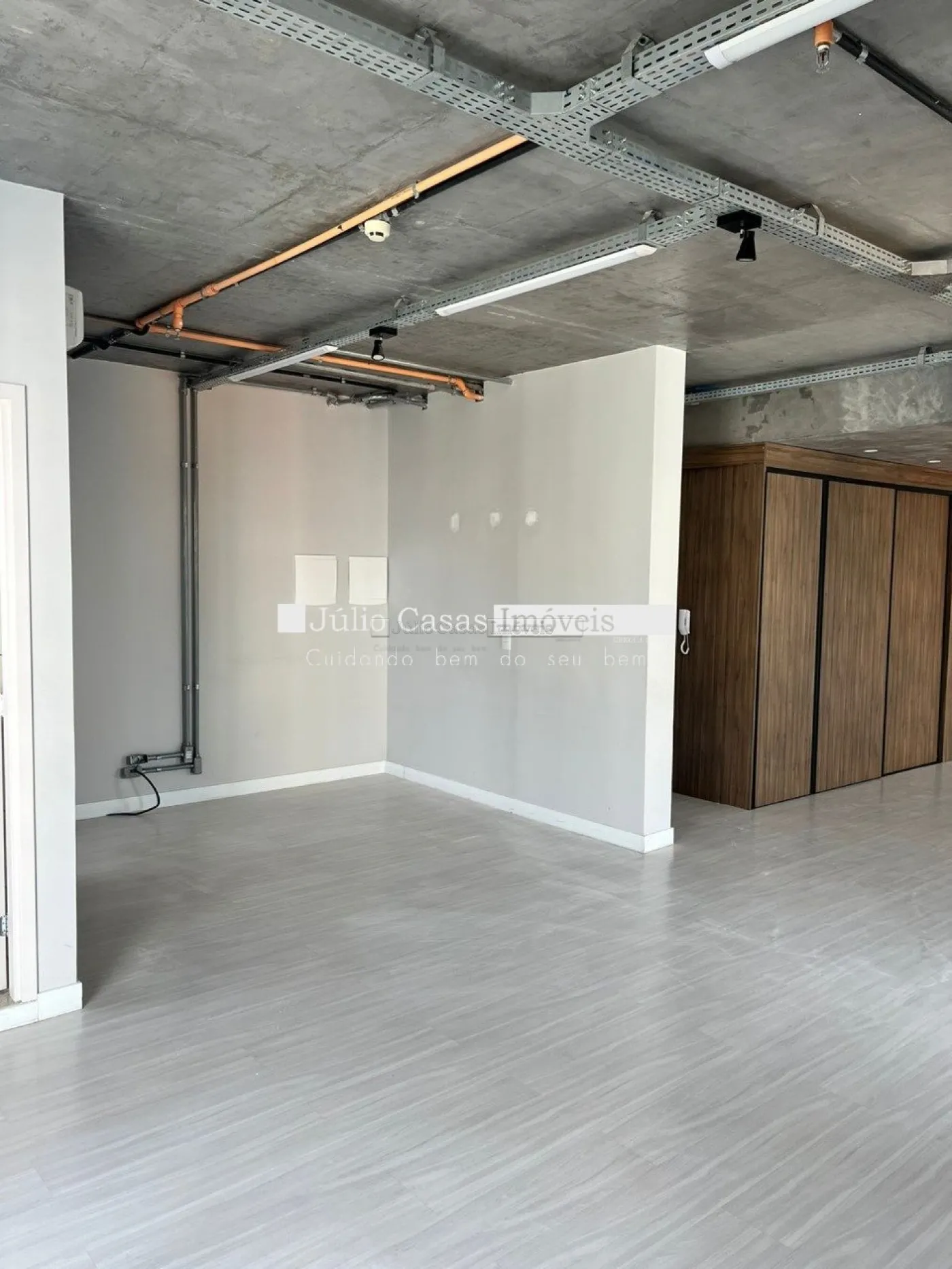 Toda com piso revestido em laminado de madeira, 4 aparelhos de ar condicionado, luminárias de LED, bancada com pia, armário para produtos de limpeza e copa embutida, portas com fechadura digital, dois banheiros e duas vagas de garagem cobertas.
