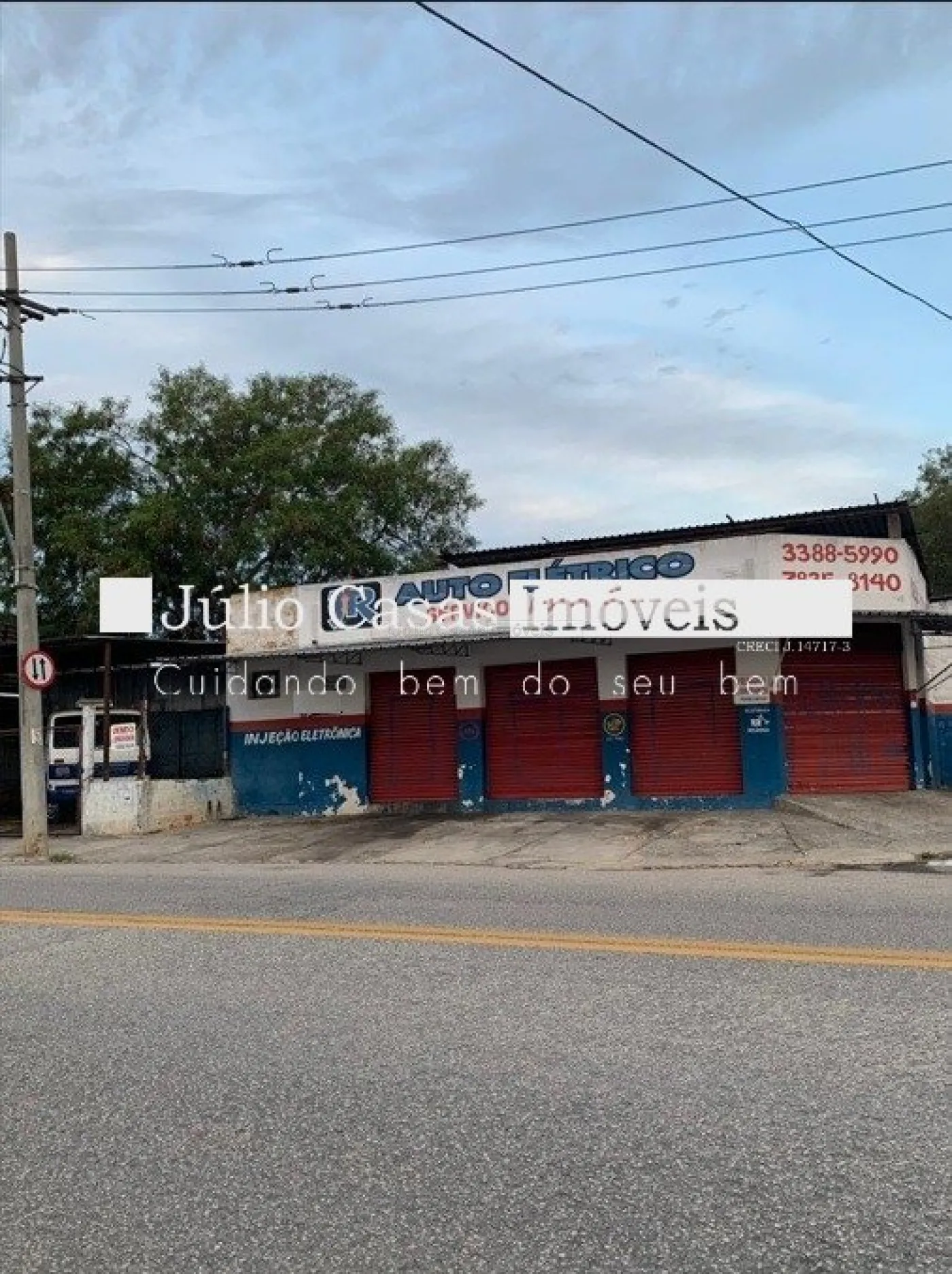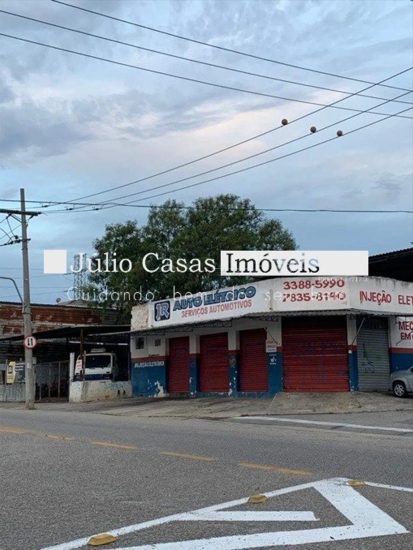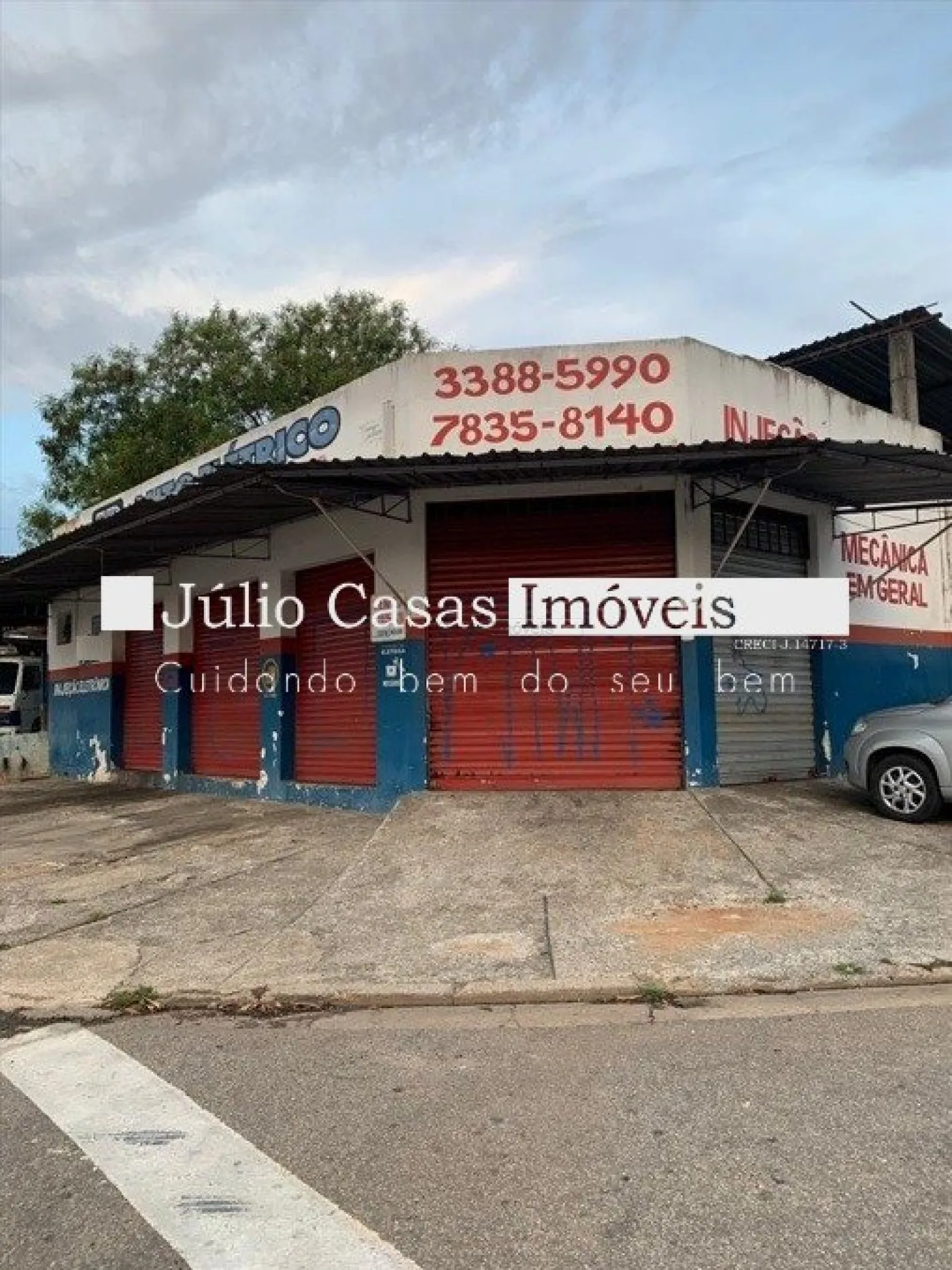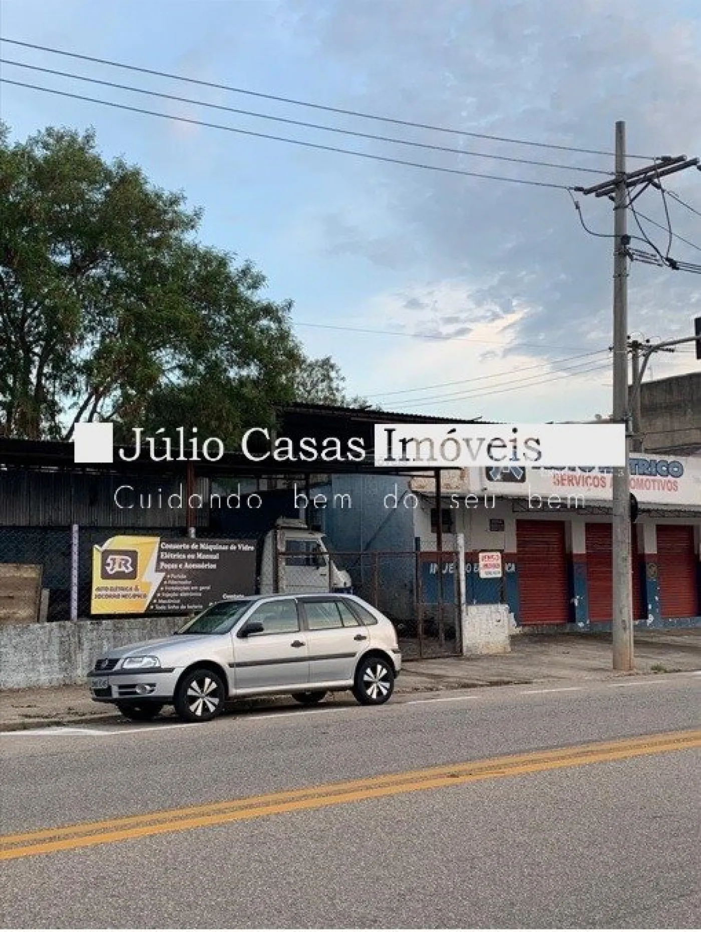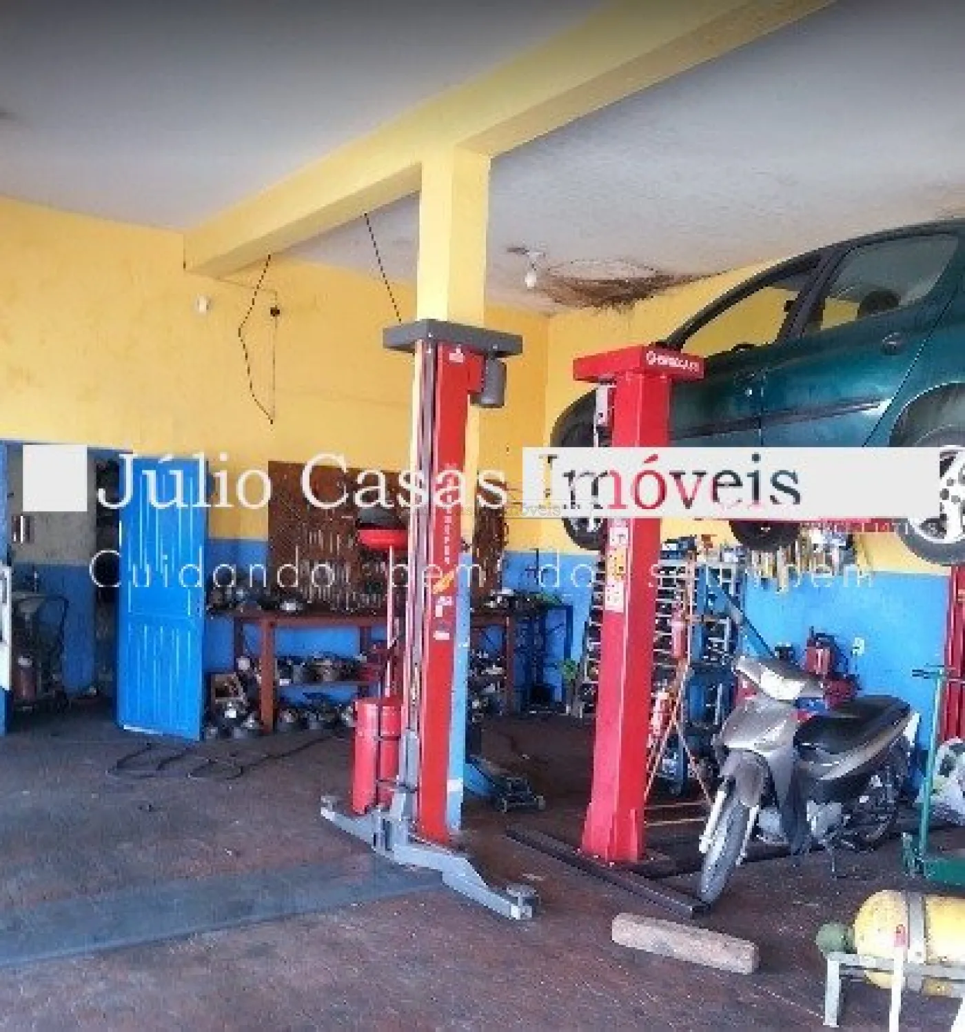 Composto de uma área fechada com cinco portas de enrolar de esquina e uma área coberta com pé direito alto e cercada de alambrado, perfazendo um total de 300m².