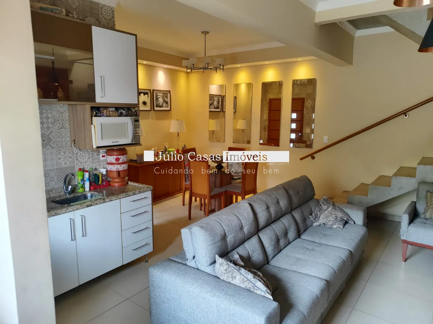 Residência com sala conceito aberto, sala de tv, sala de jantar e cozinha.