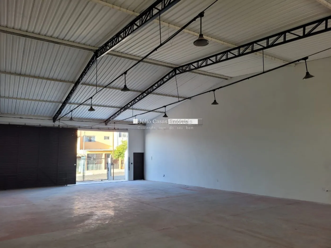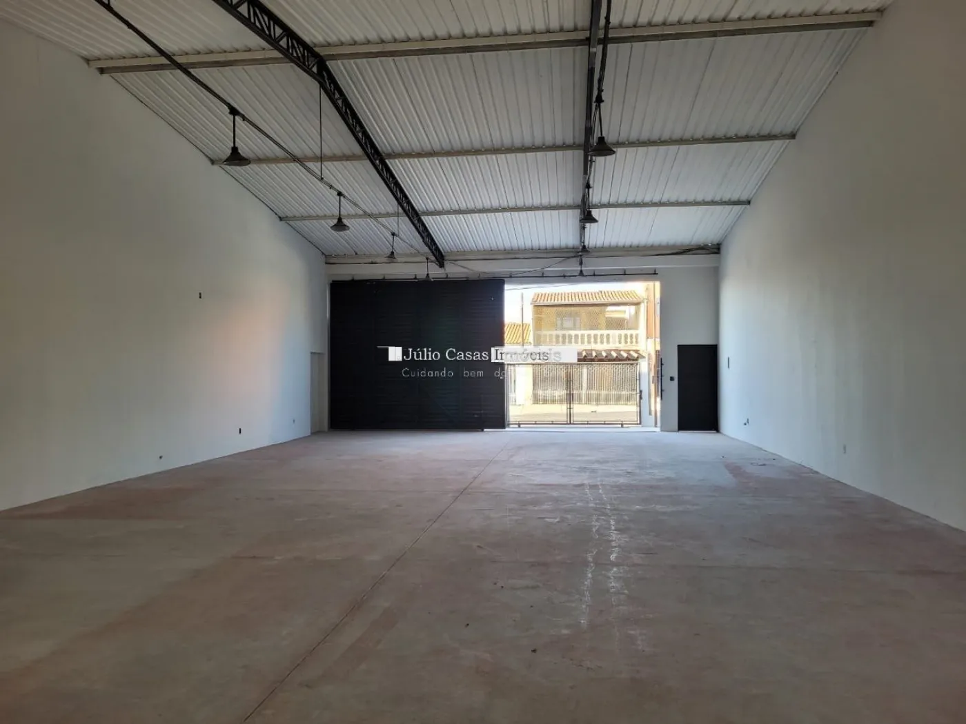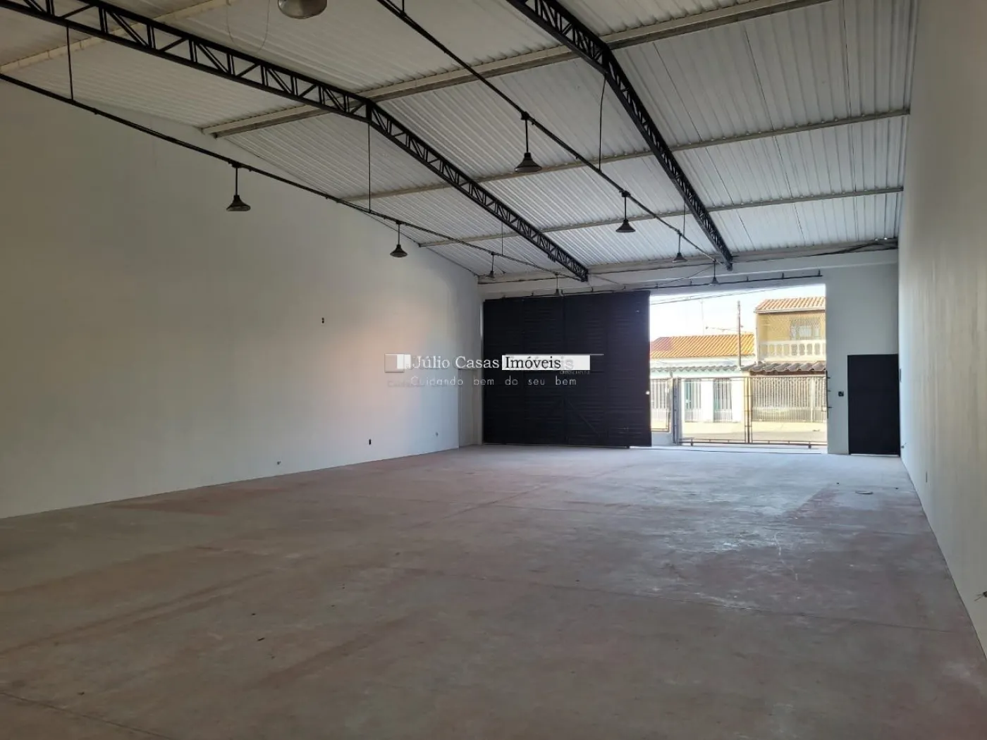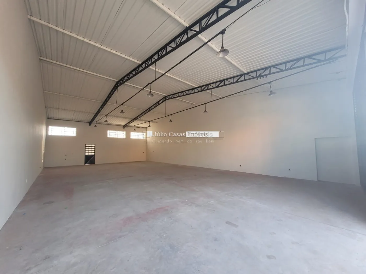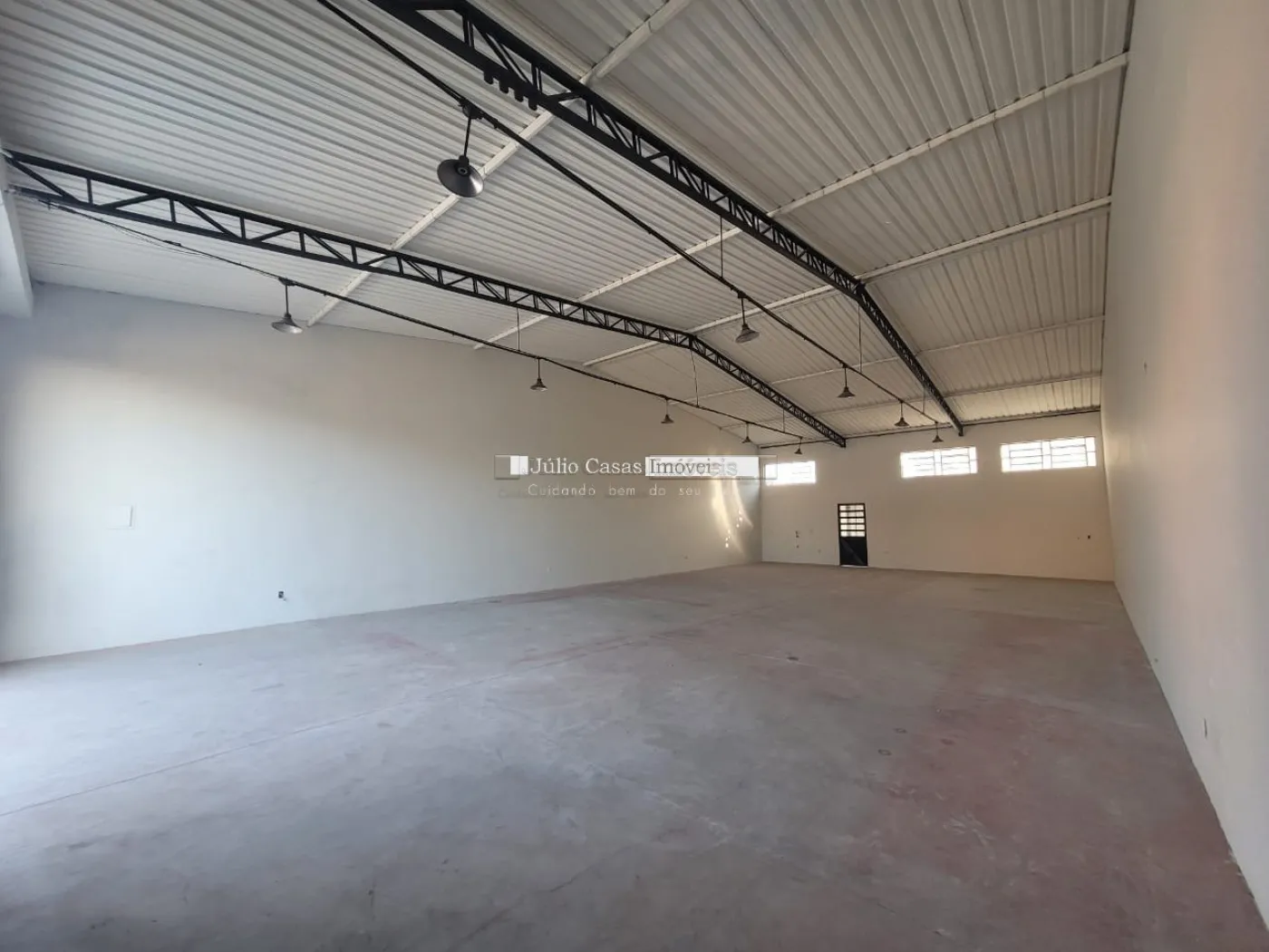 Barracão com pé direito de 5m, portão com 3m altura e portão social lateral, espaço para estacionar com portão, piso em cimento polido, vão totalmente livre, cozinha, 2 banheiros, um pequeno quintal no fundo