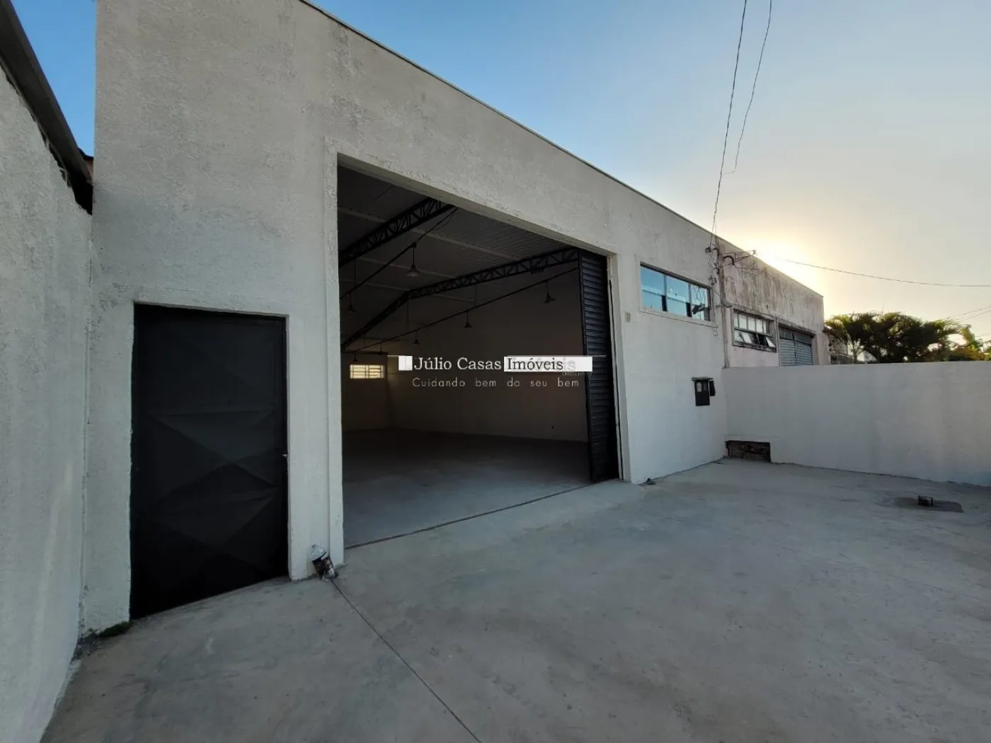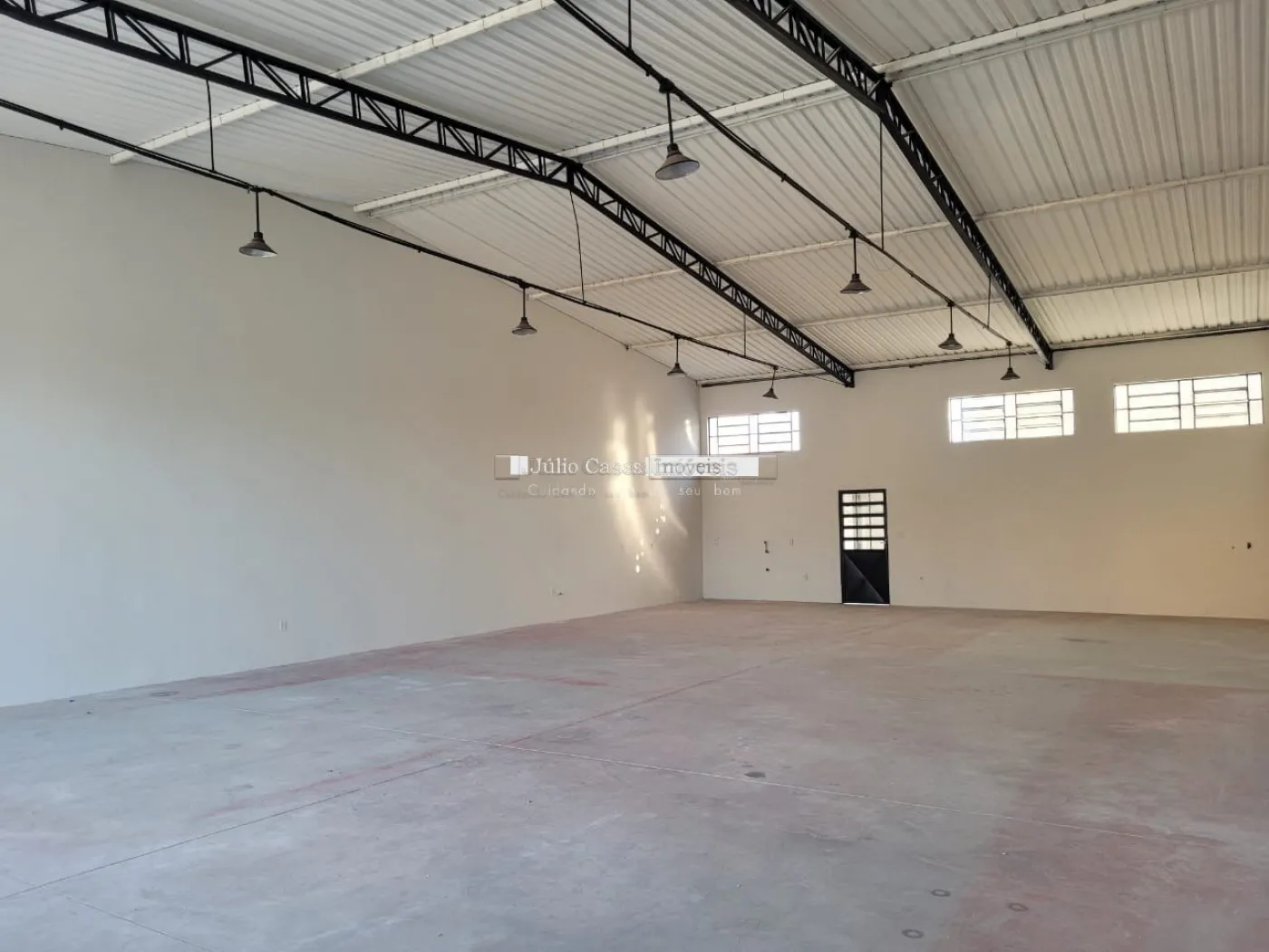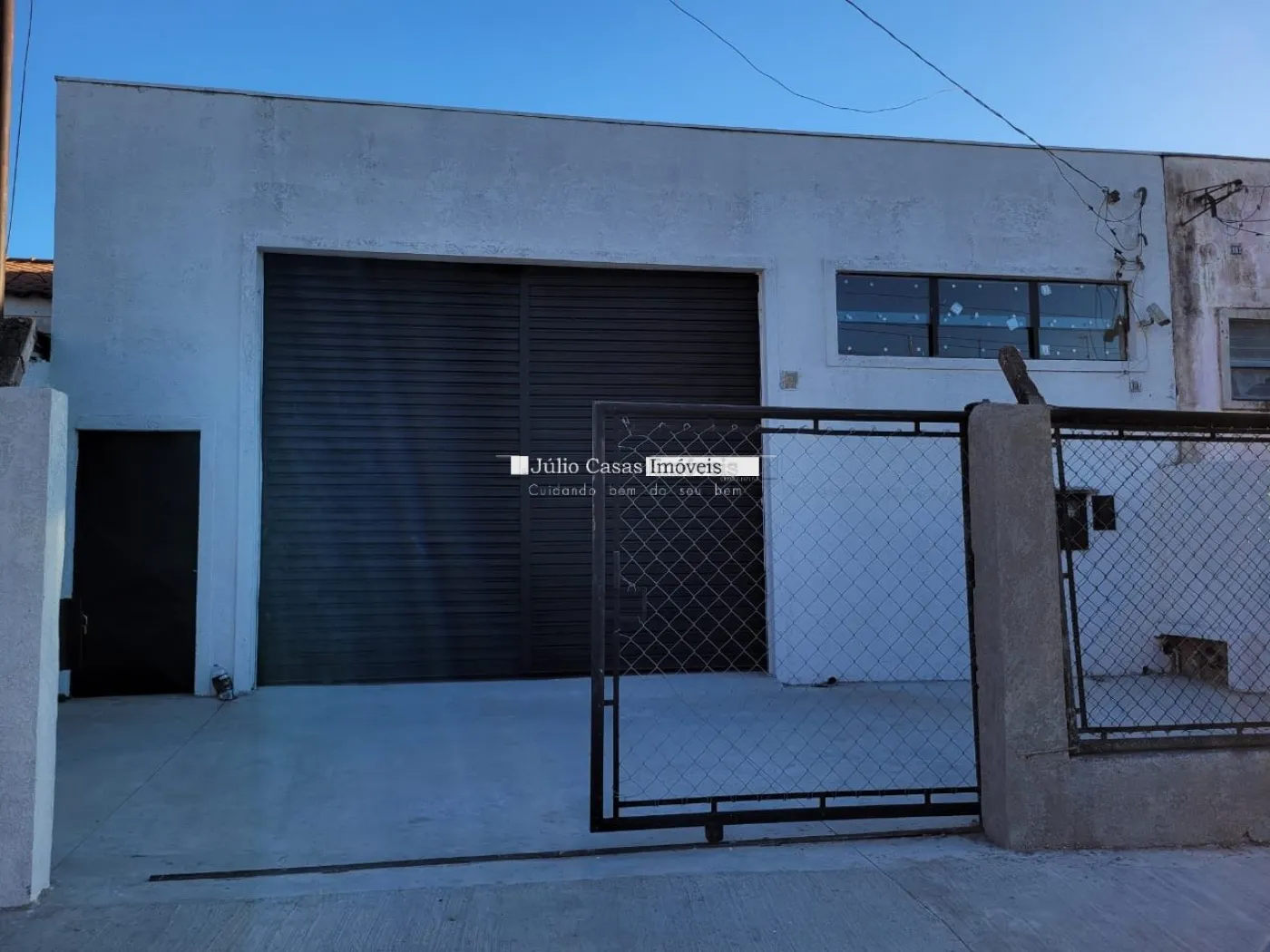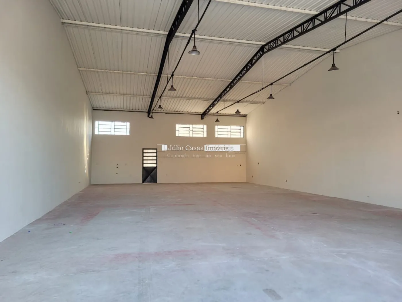 Barracão com pé direito de 5m, portão com 3m altura e portão social lateral, espaço para estacionar com portão, piso em cimento polido, vão totalmente livre, cozinha, 2 banheiros, um pequeno quintal no fundo