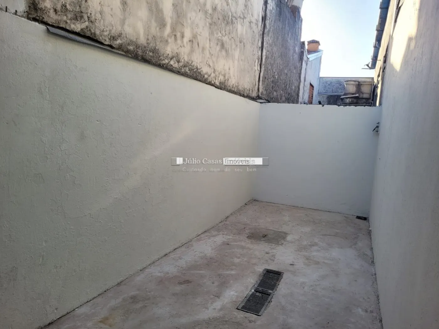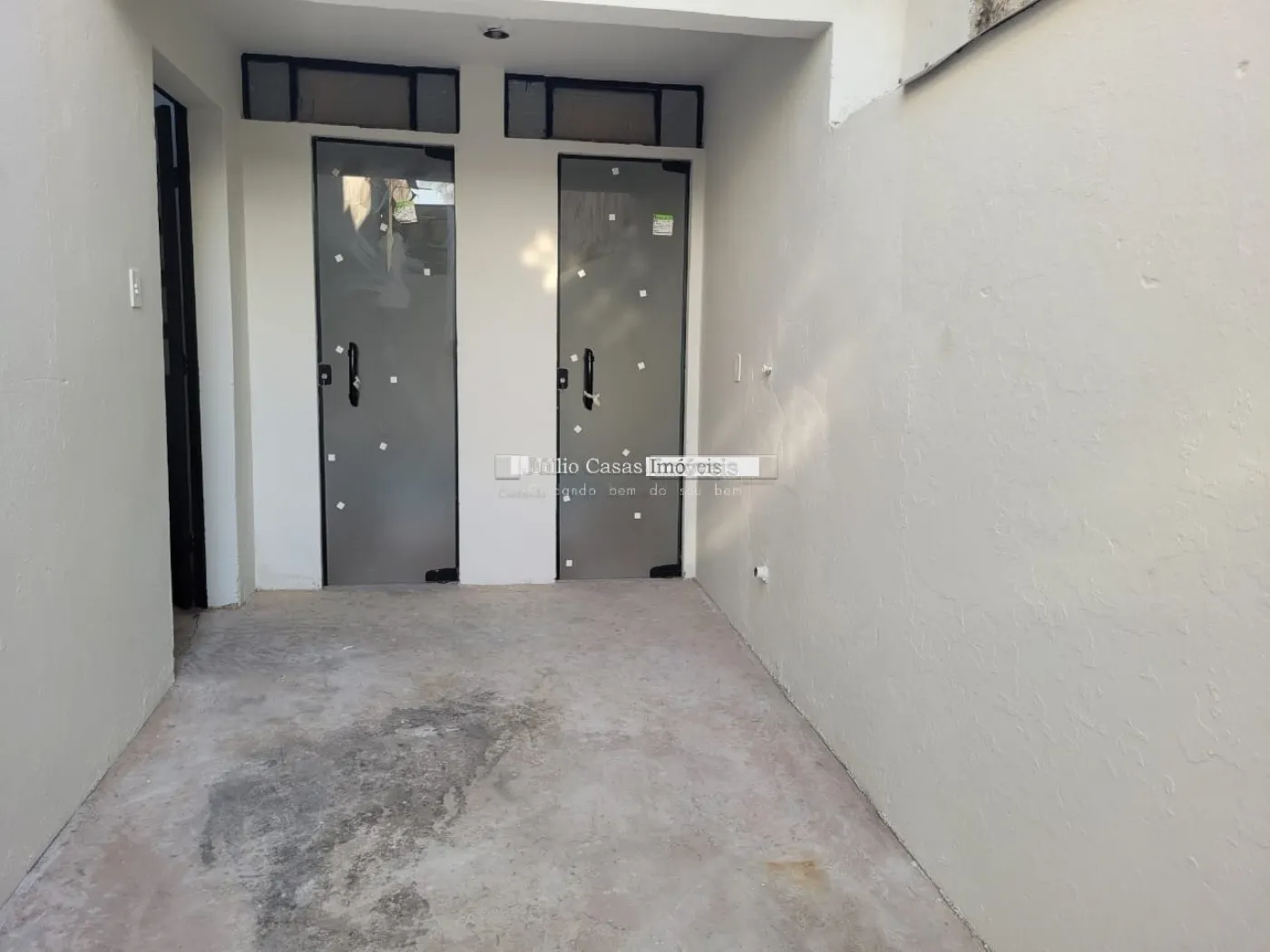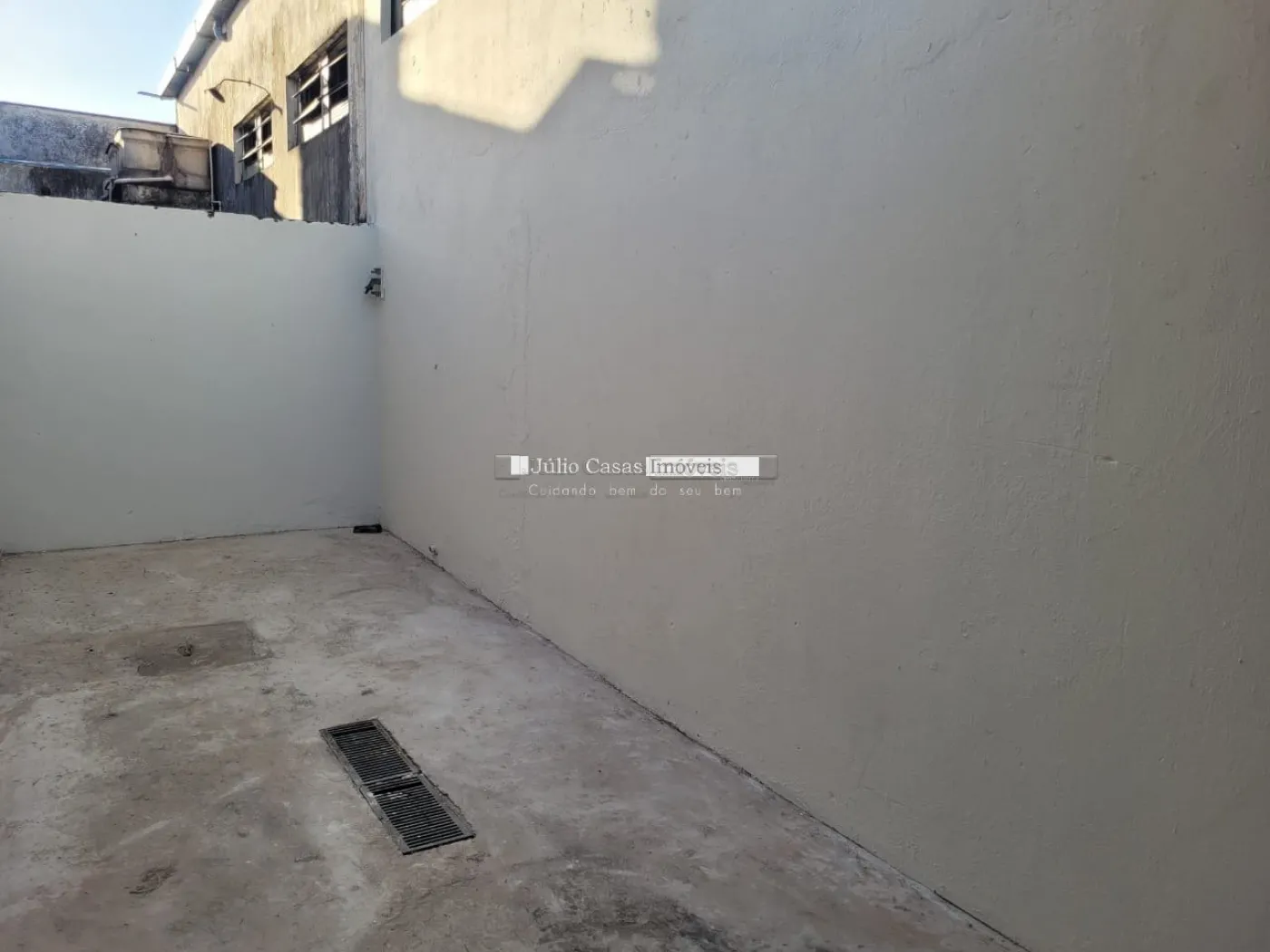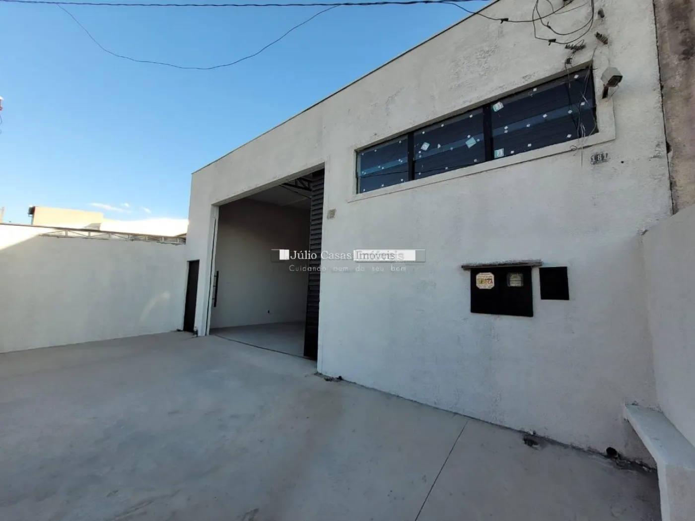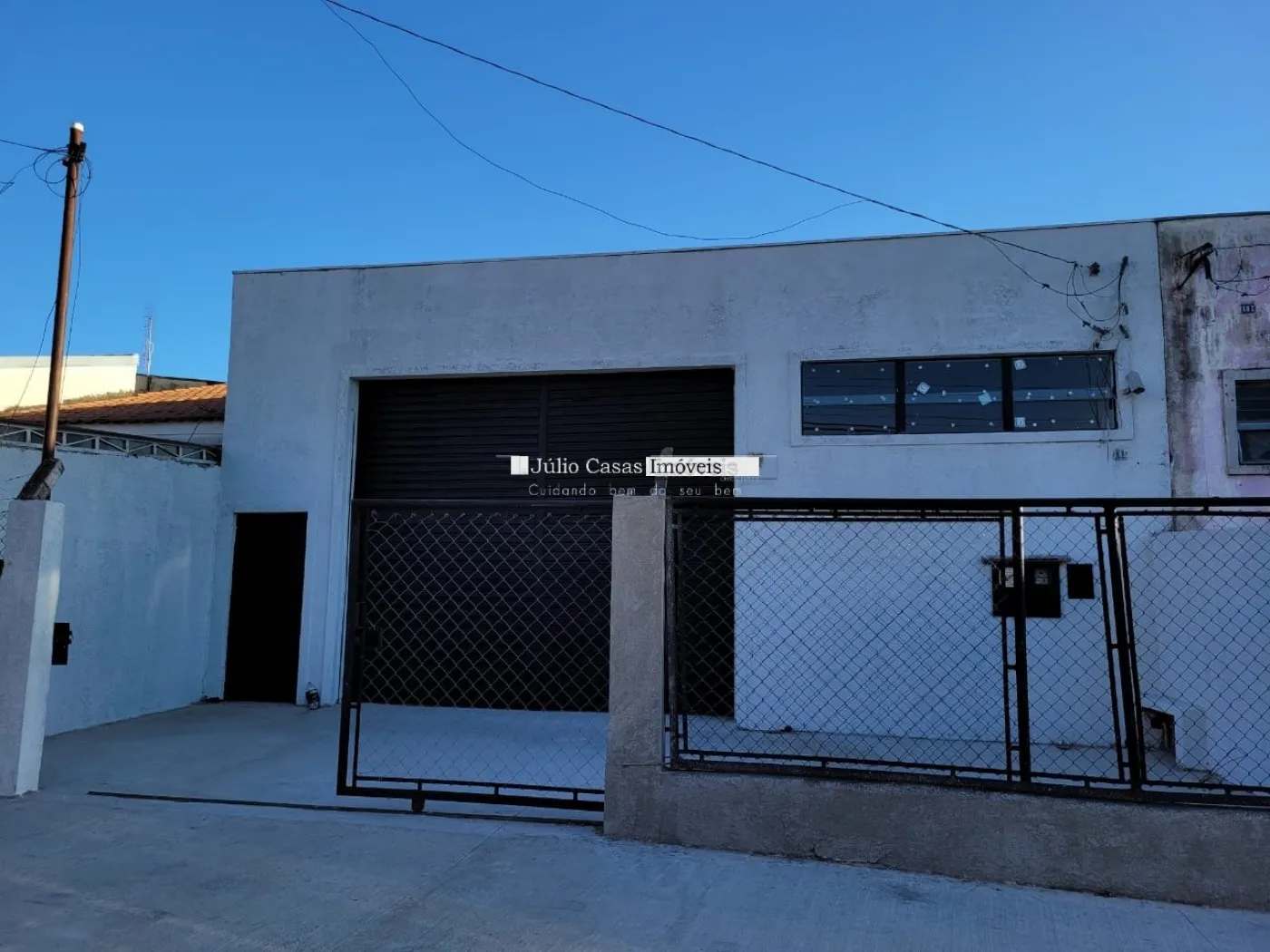 Barracão com pé direito de 5m, portão com 3m altura e portão social lateral, espaço para estacionar com portão, piso em cimento polido, vão totalmente livre, cozinha, 2 banheiros, um pequeno quintal no fundo