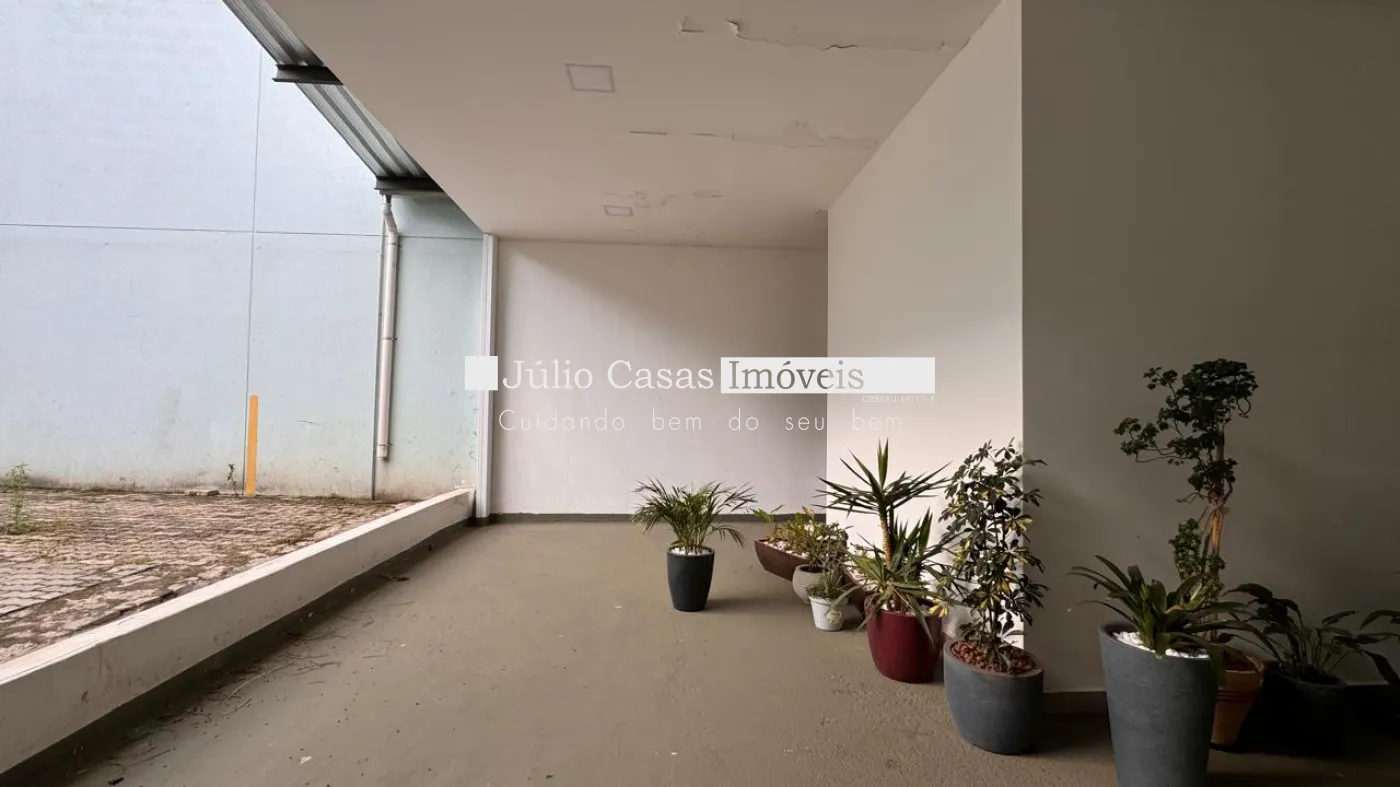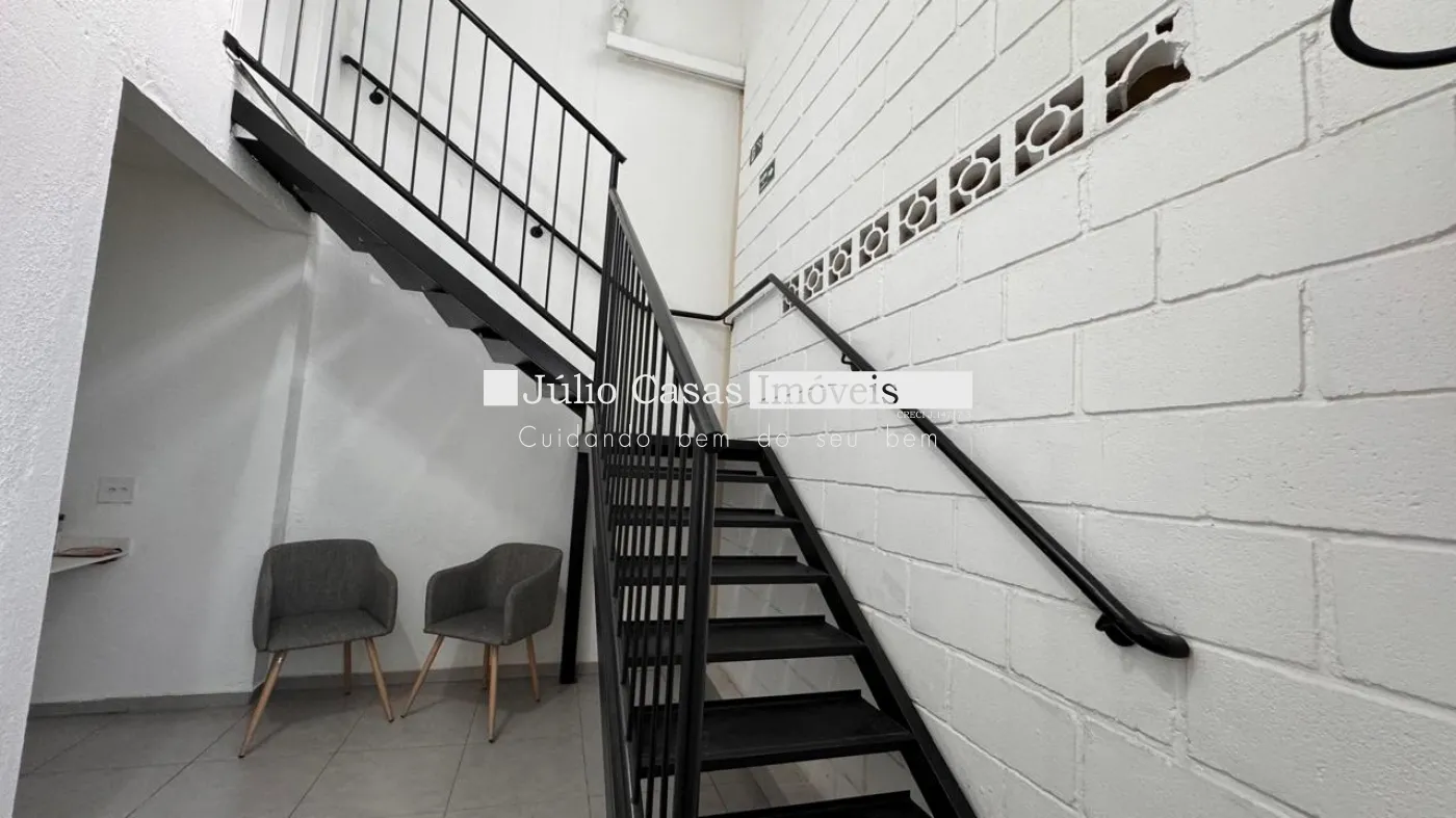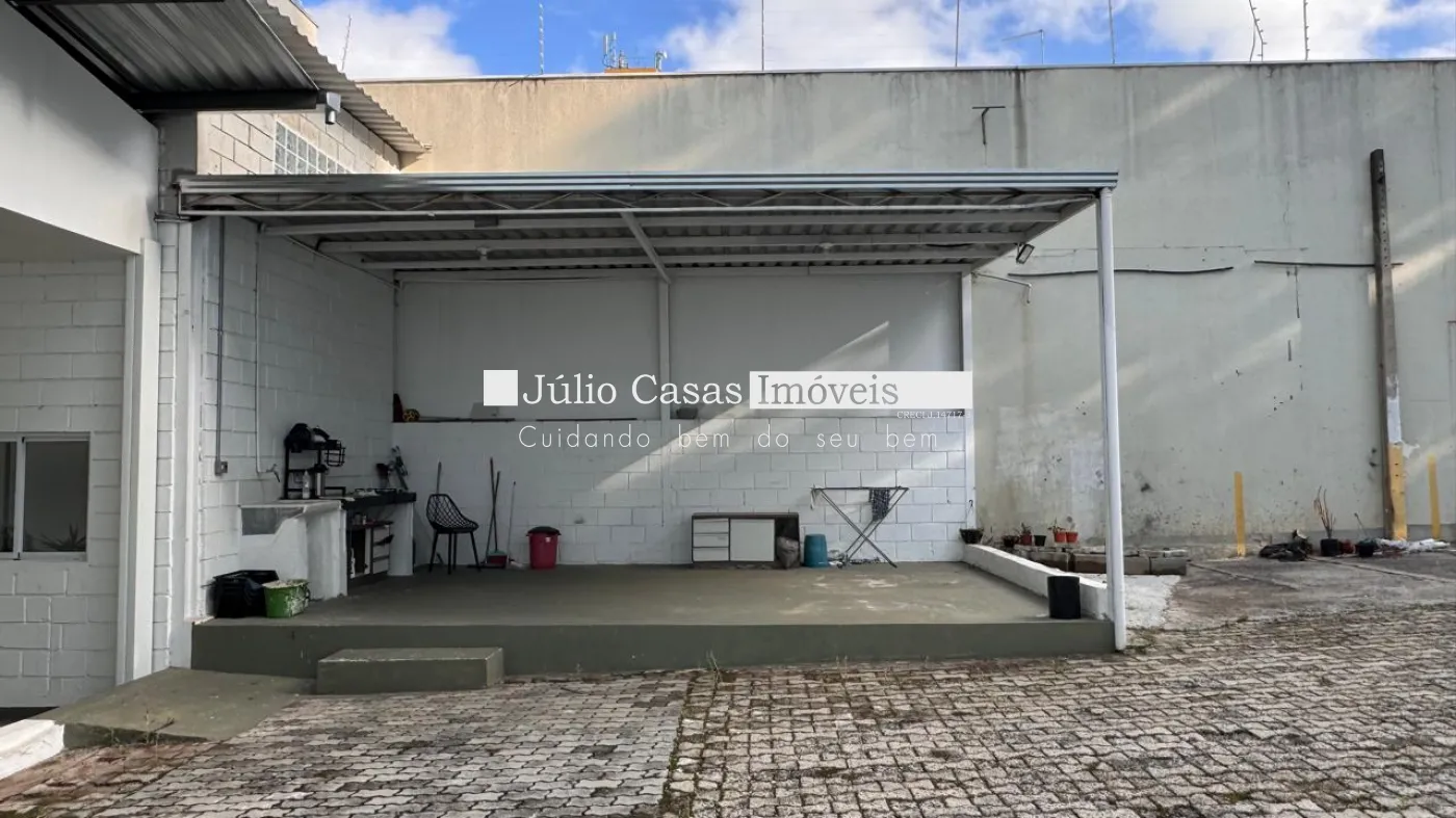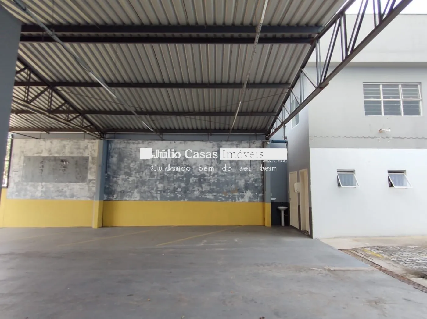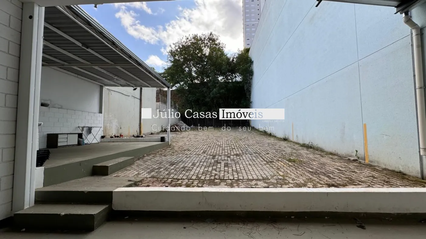 Nos fundos, há dois banheiros, um deles com acessibilidade. O espaço também conta com um box coberto para lavagem de carros e duas salas que podem ser utilizadas como escritório ou depósito.