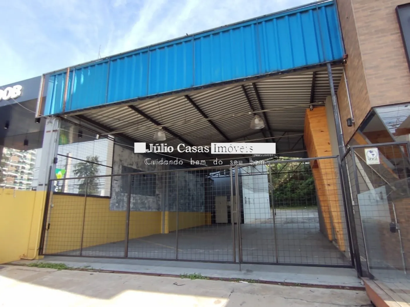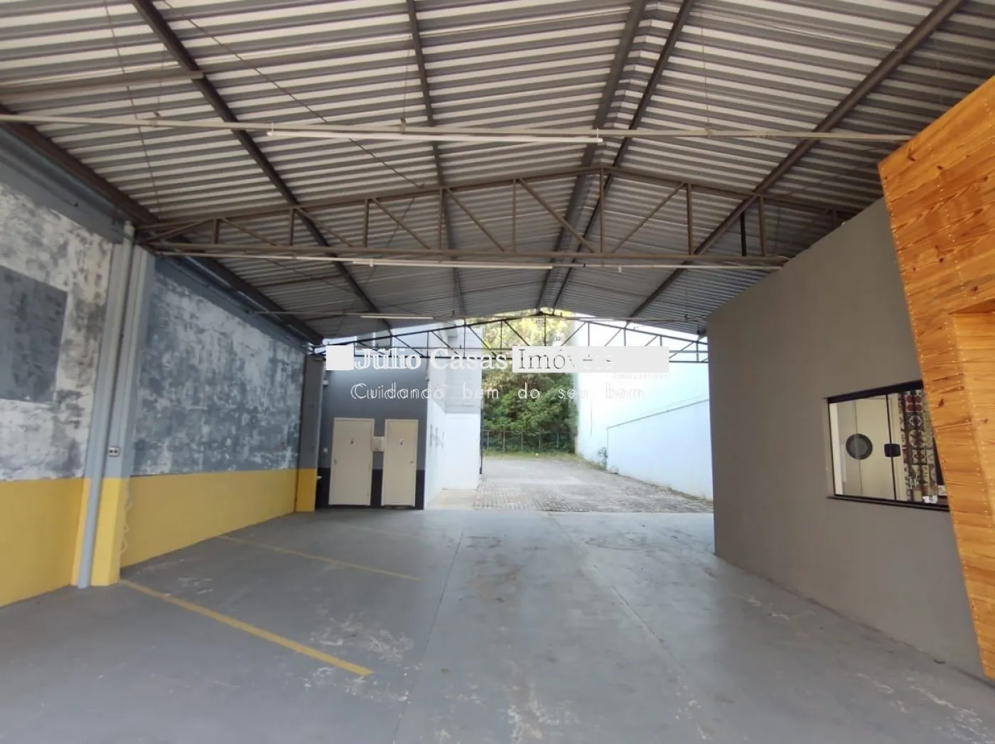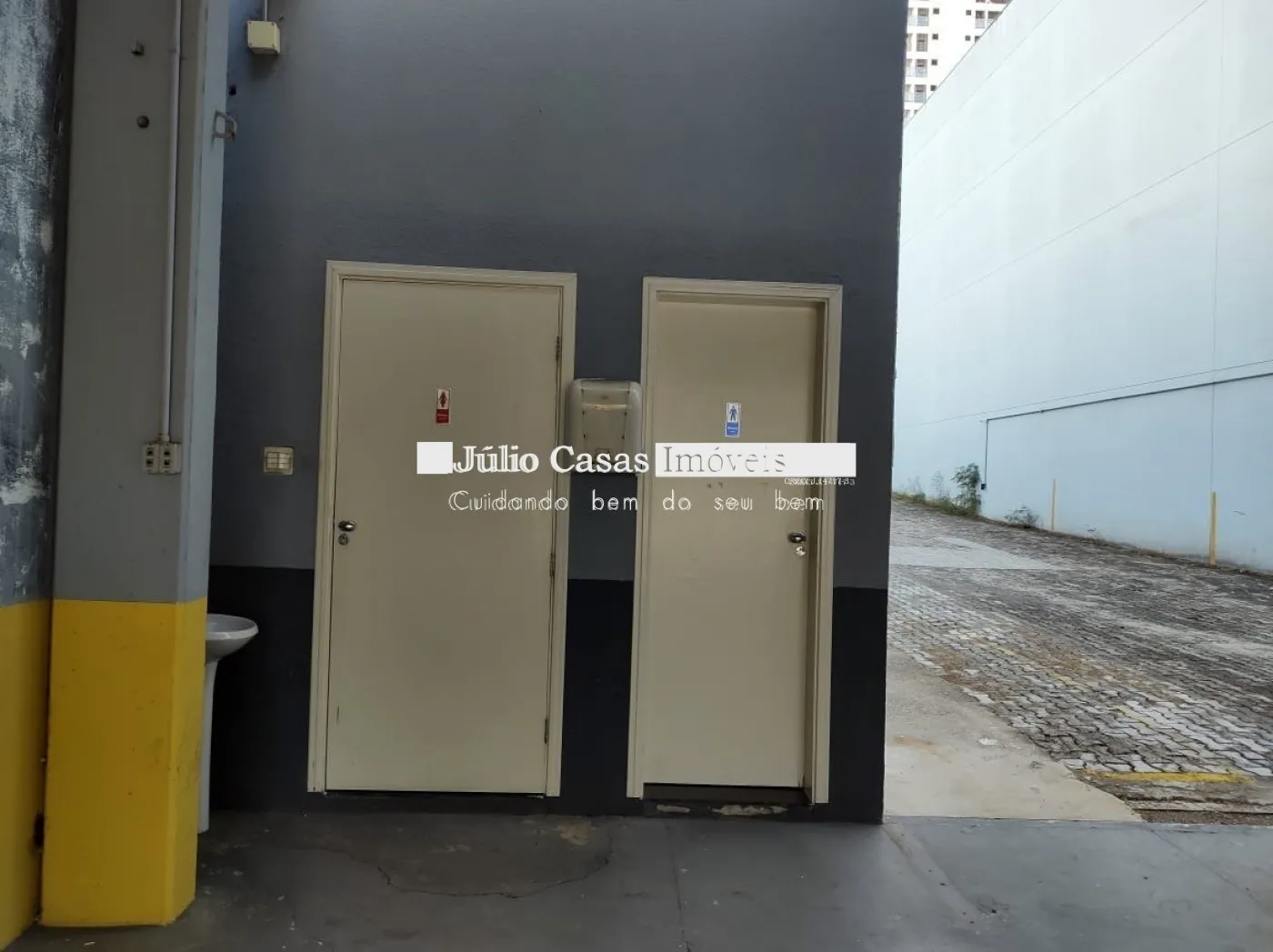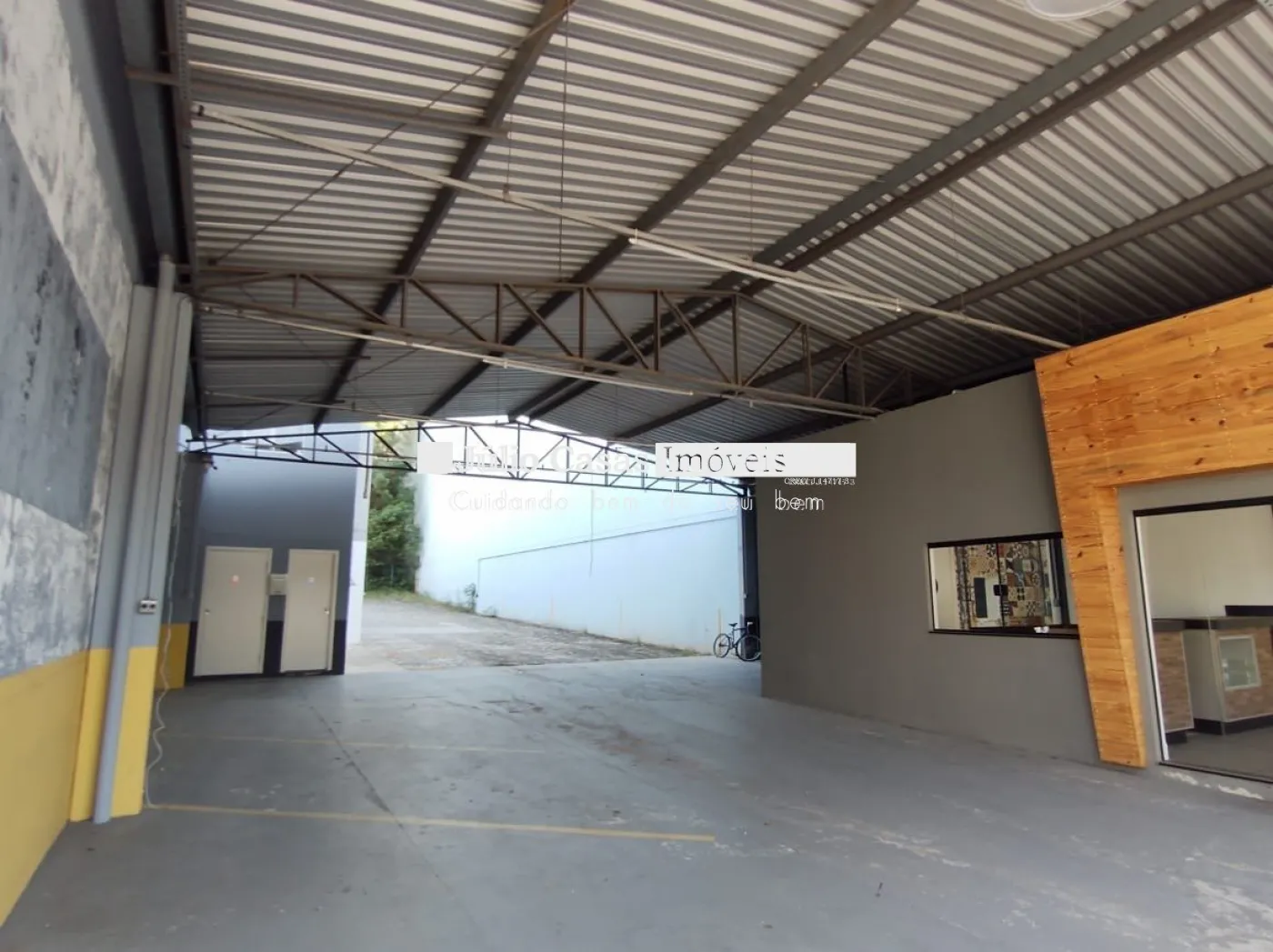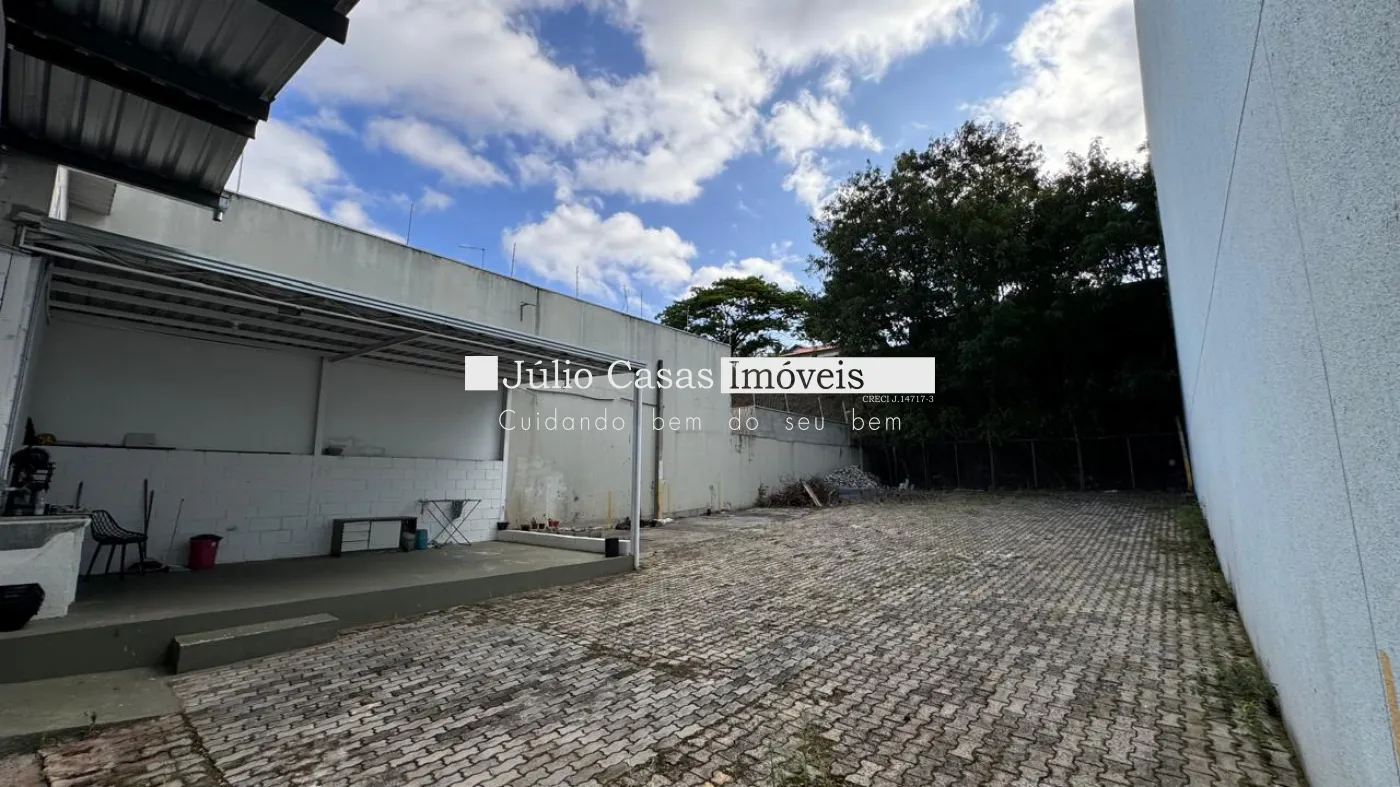 Nos fundos, há dois banheiros, um deles com acessibilidade. O espaço também conta com um box coberto para lavagem de carros e duas salas que podem ser utilizadas como escritório ou depósito.